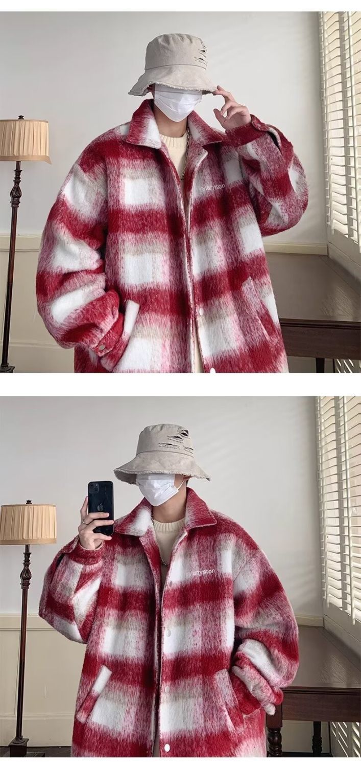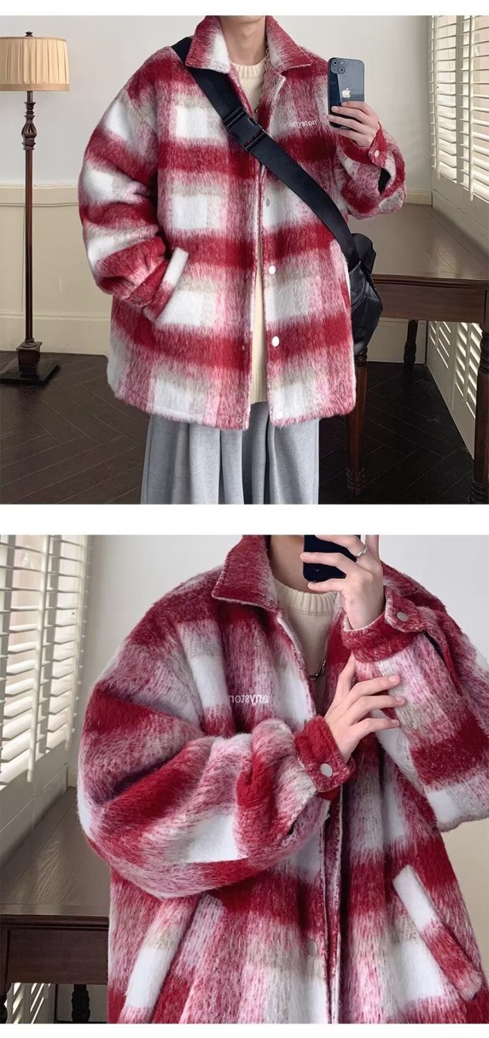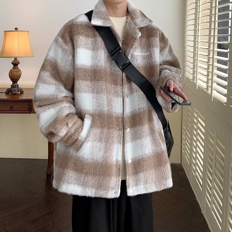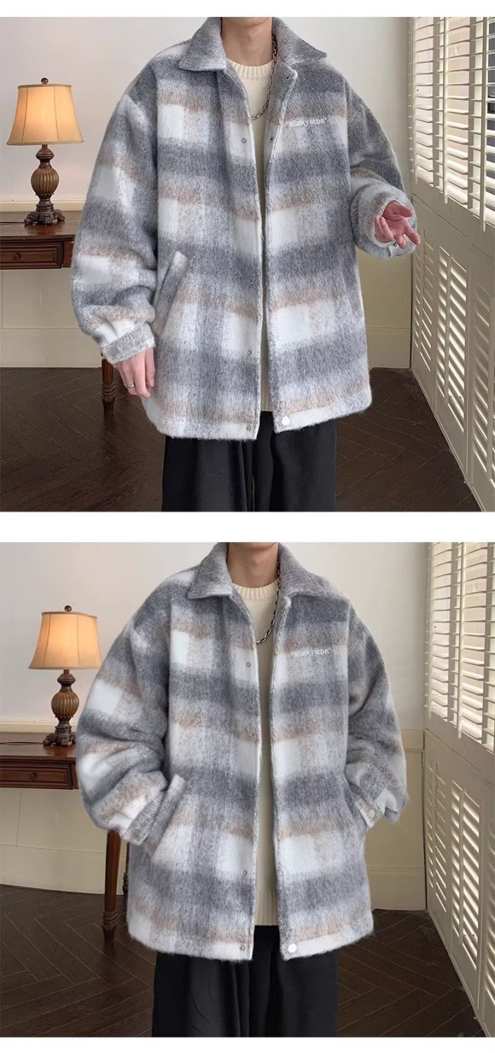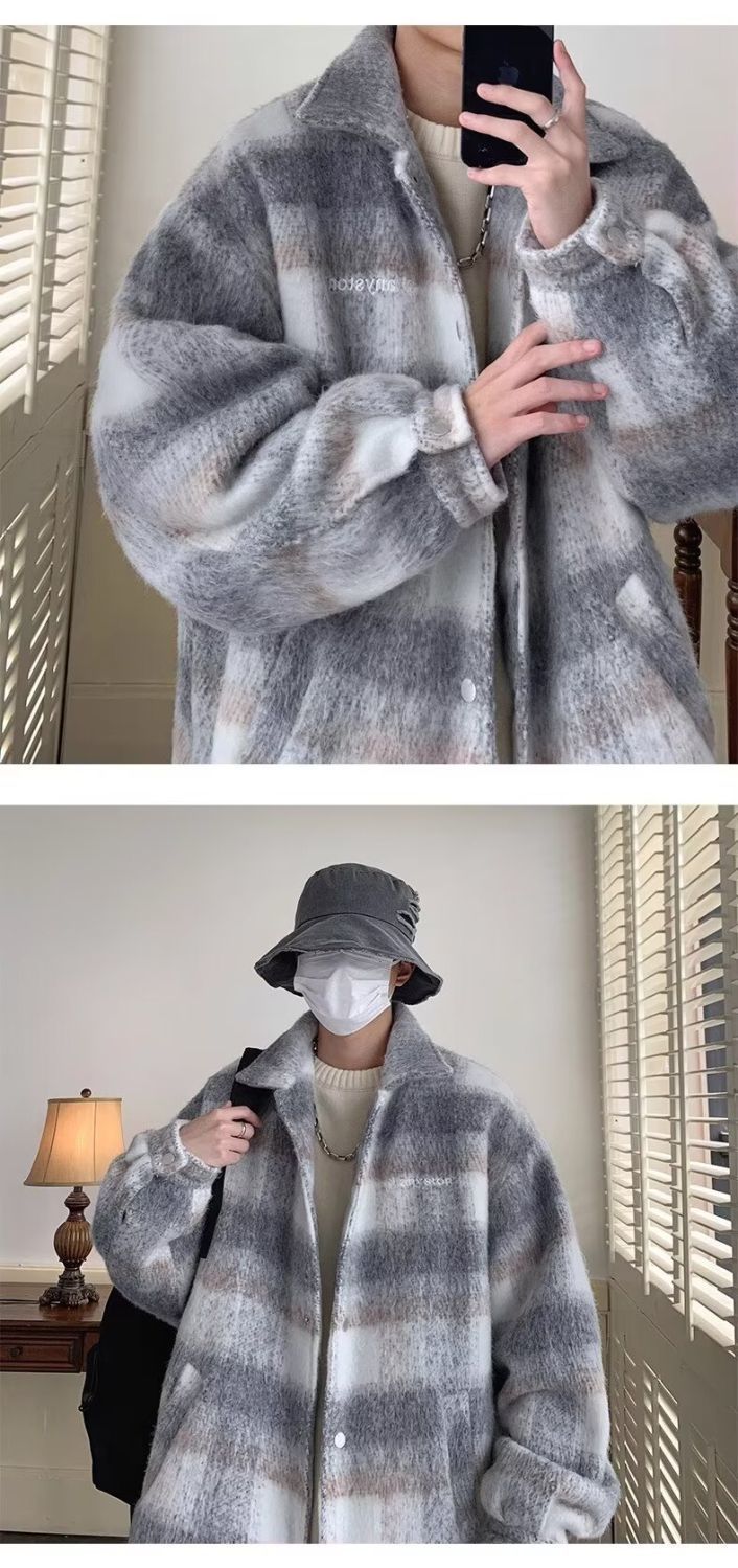 봄과 가을 격자 무늬 코트 오버 사이즈 울 루즈 모직 유행 남성 재킷 아메리칸 스타일 레트로 커플 재킷