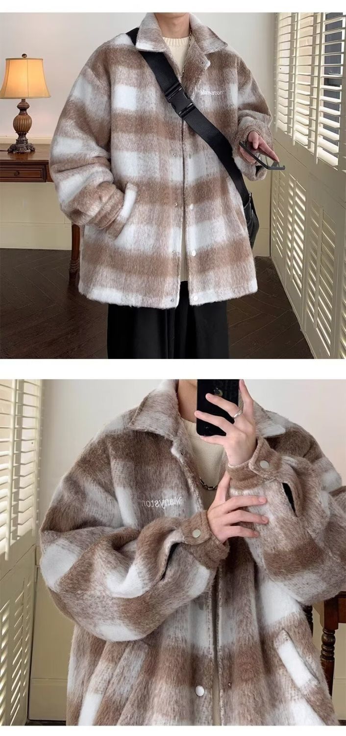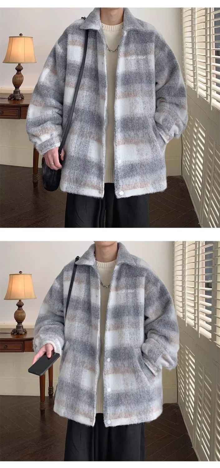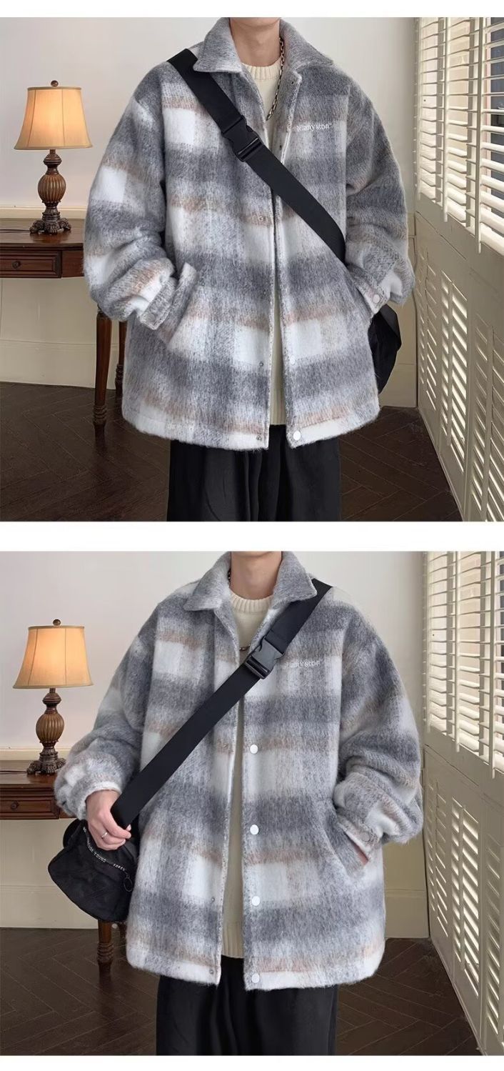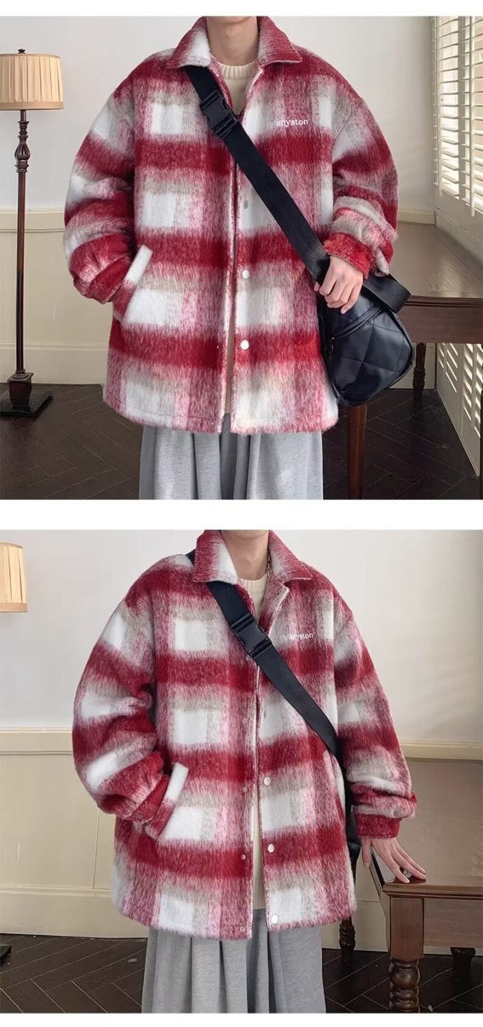 봄과 가을 격자 무늬 코트 오버 사이즈 울 루즈 모직 유행 남성 재킷 아메리칸 스타일 레트로 커플 재킷