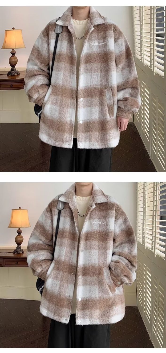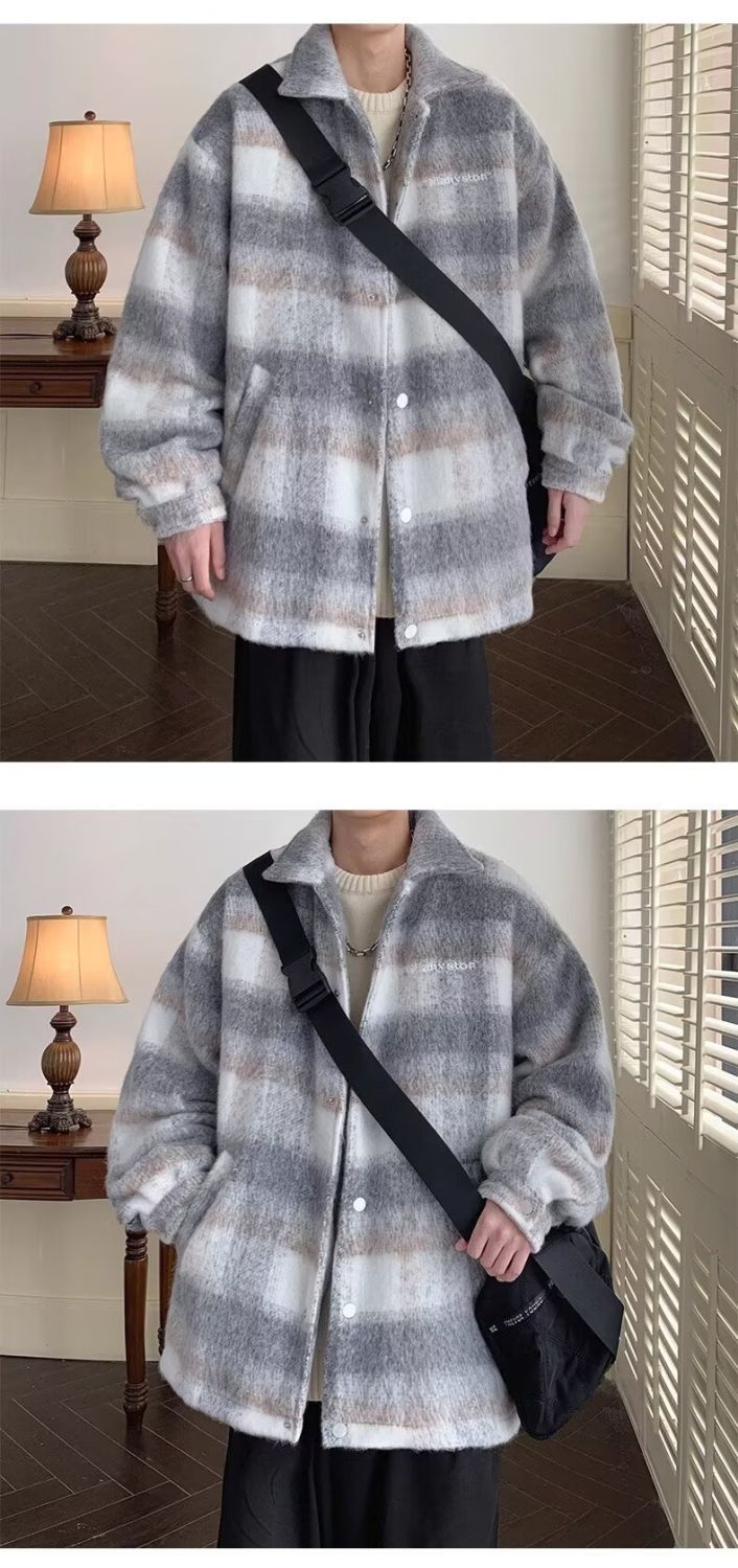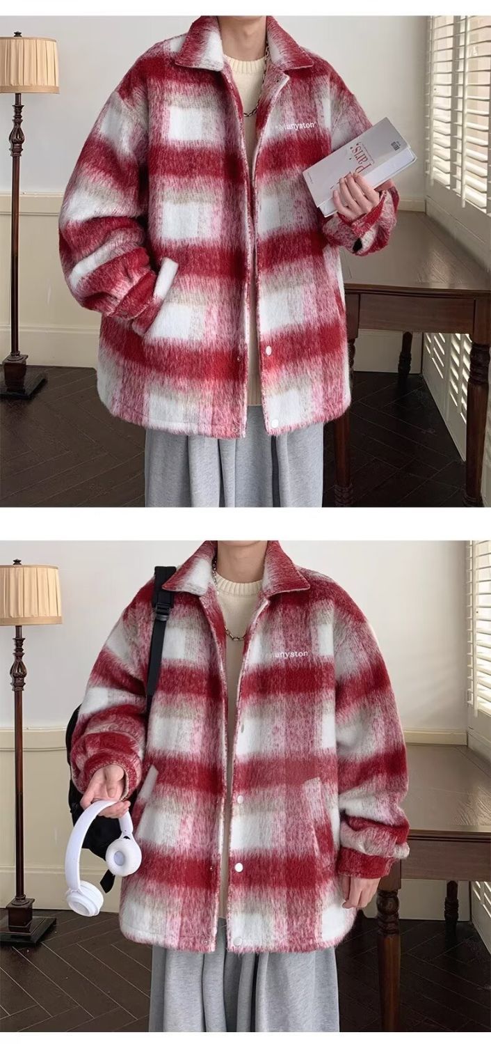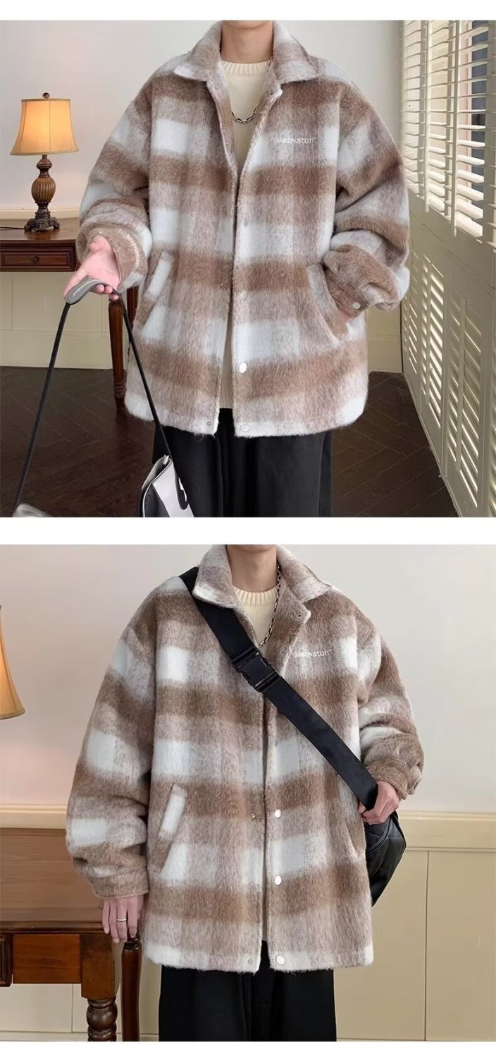 봄과 가을 격자 무늬 코트 오버 사이즈 울 루즈 모직 유행 남성 재킷 아메리칸 스타일 레트로 커플 재킷