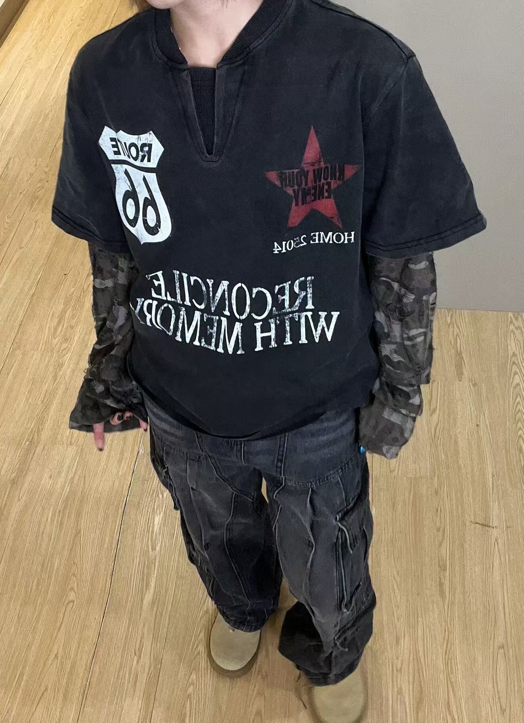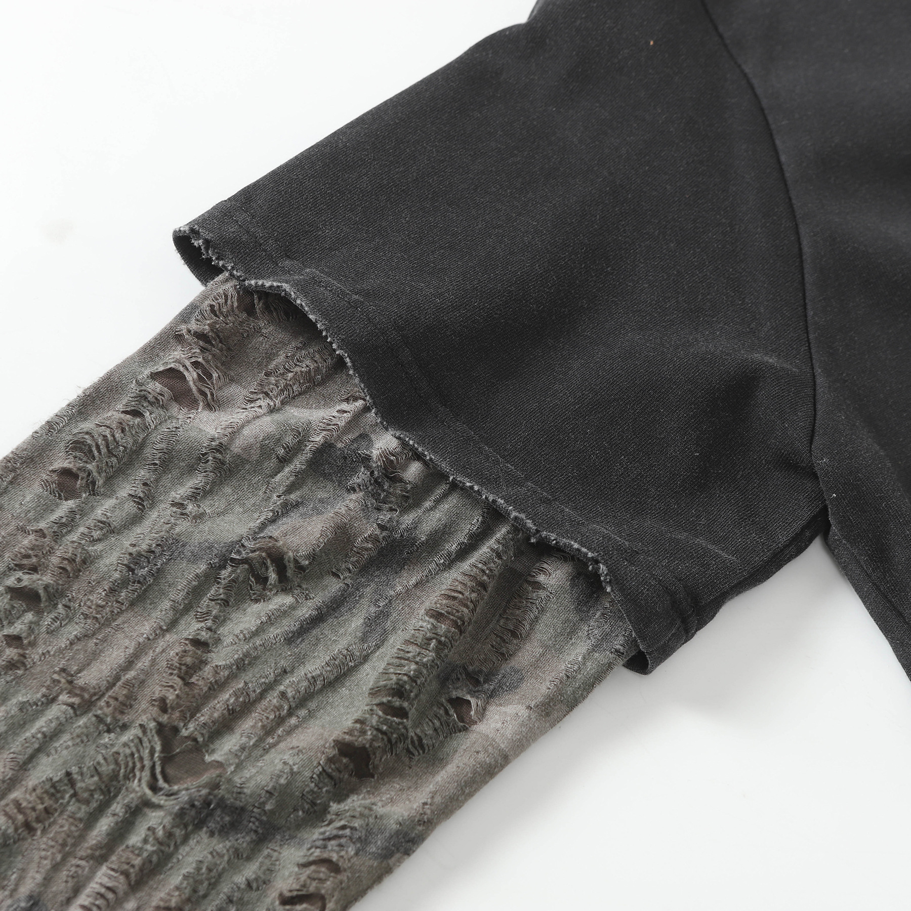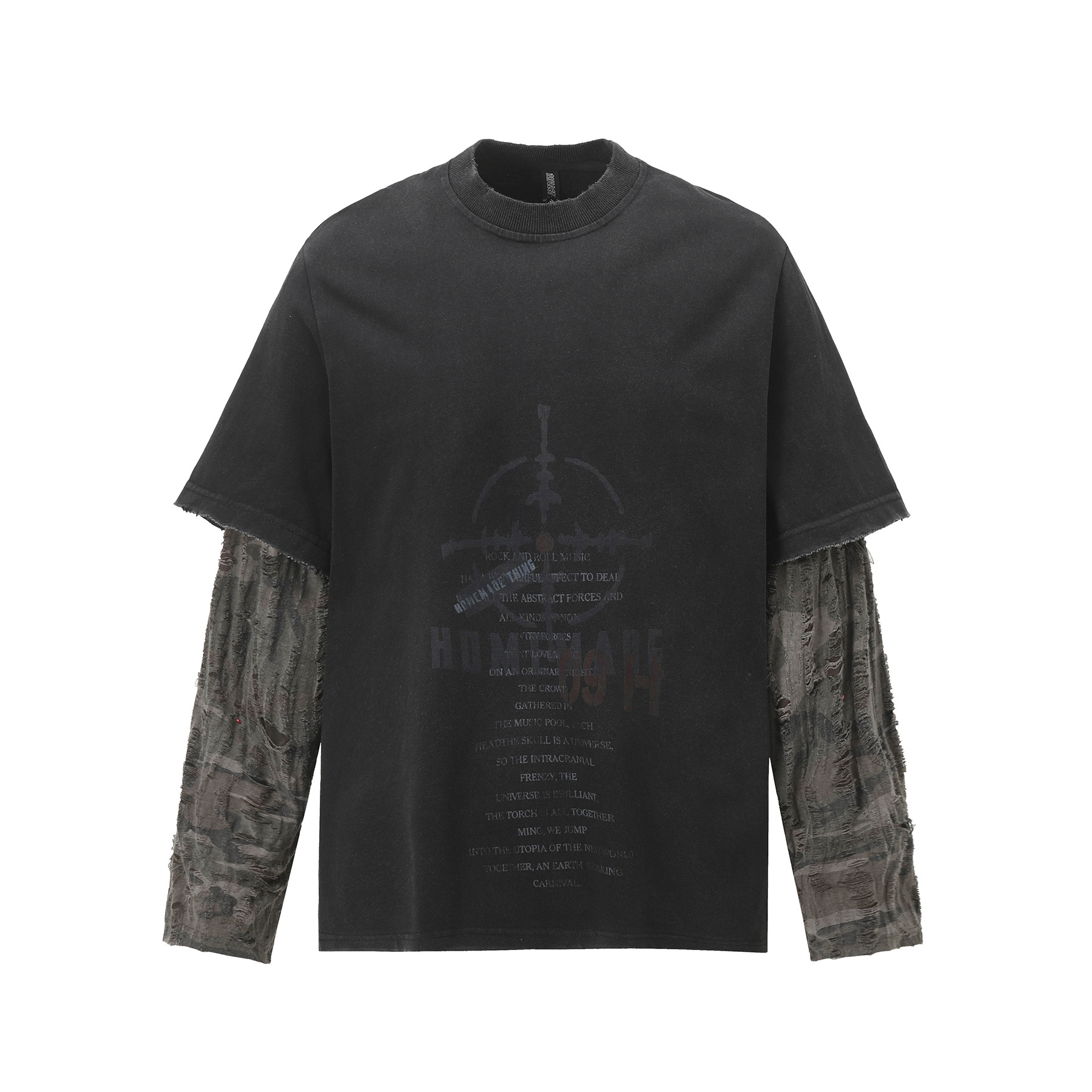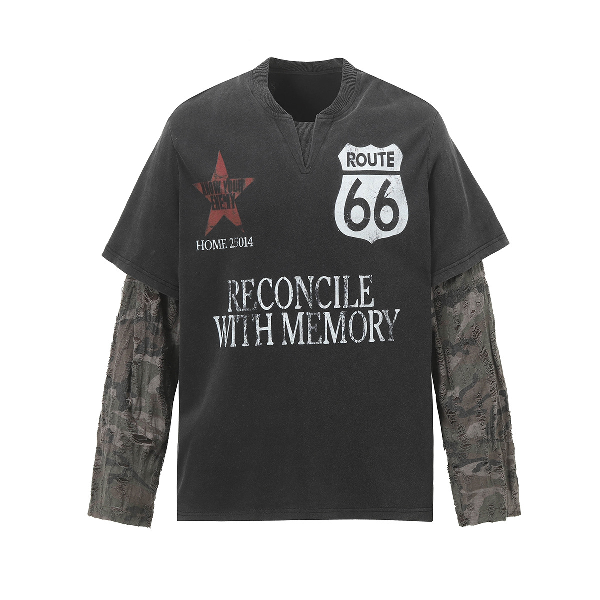 Jiayiku 남성 의류 가을 2025 새로운 미국 스트리트 패션 브랜드 가짜 두 씻어 손상된 씻어 티셔츠 긴 소매