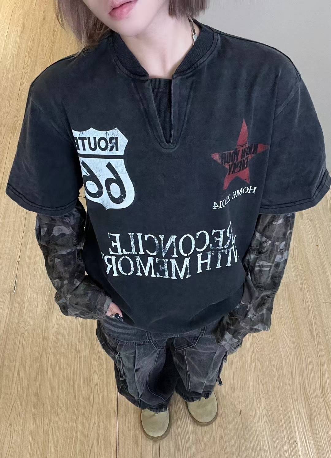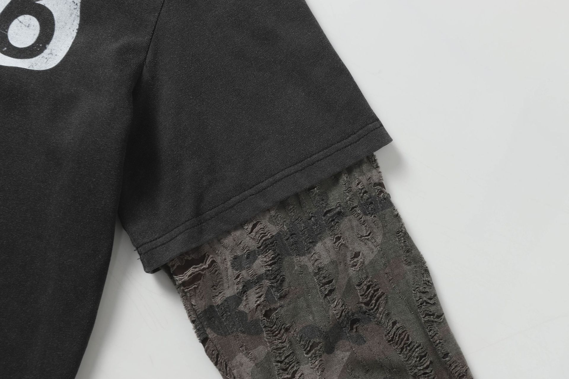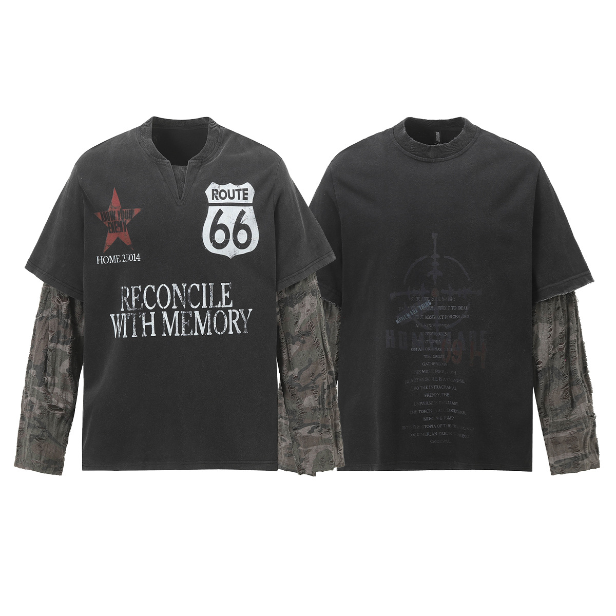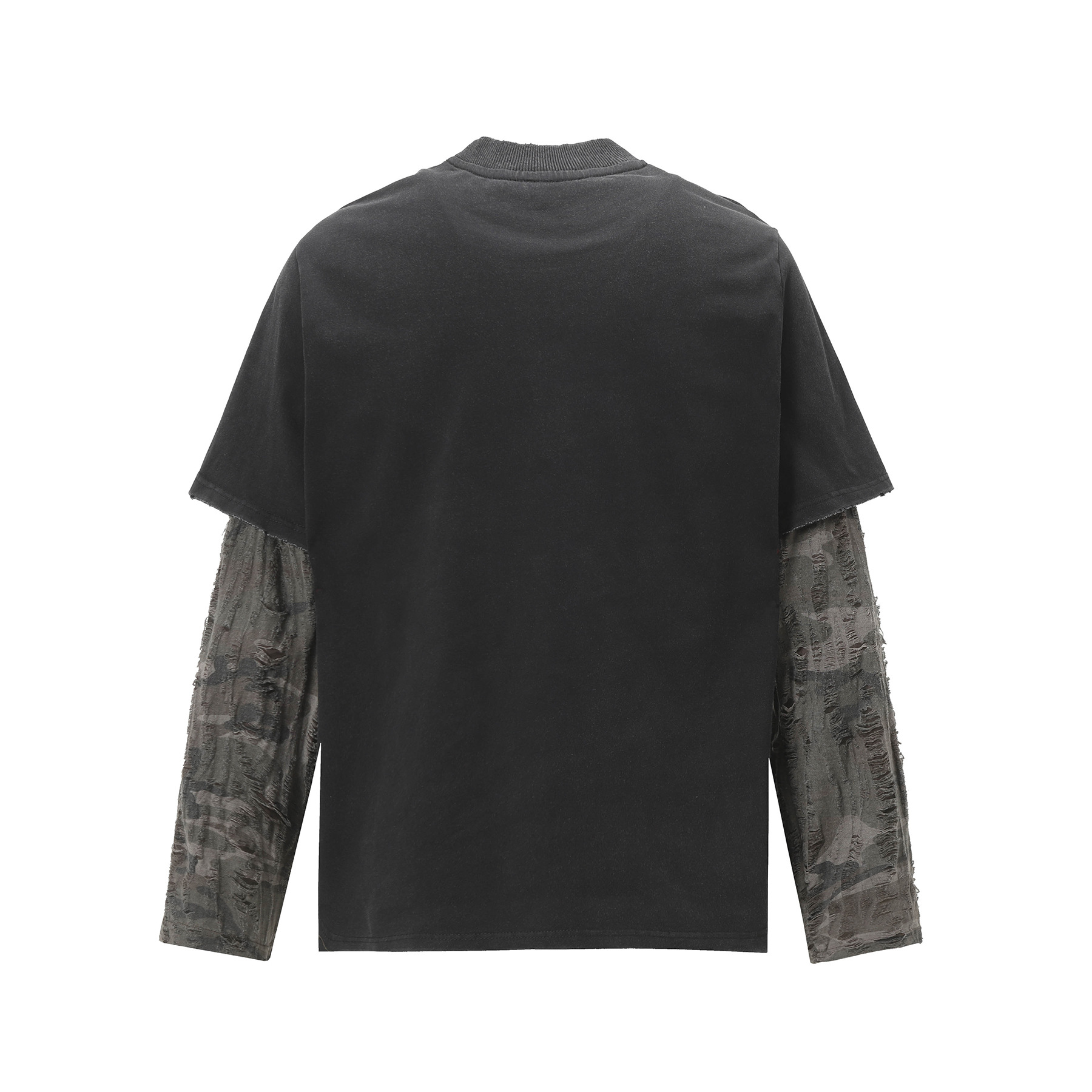 Jiayiku 남성 의류 가을 2025 새로운 미국 스트리트 패션 브랜드 가짜 두 씻어 손상된 씻어 티셔츠 긴 소매스토어 가기
