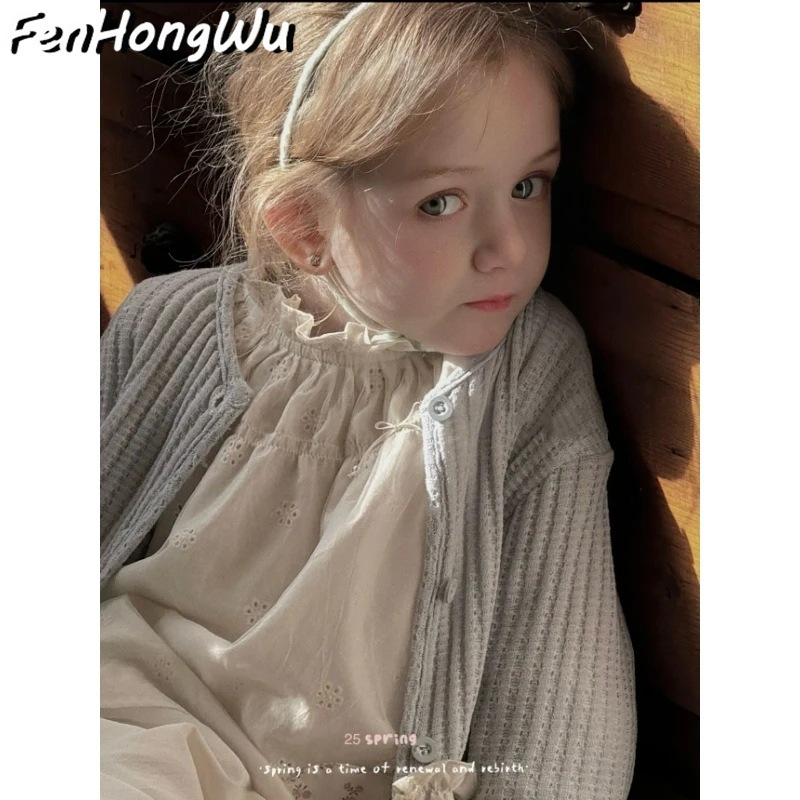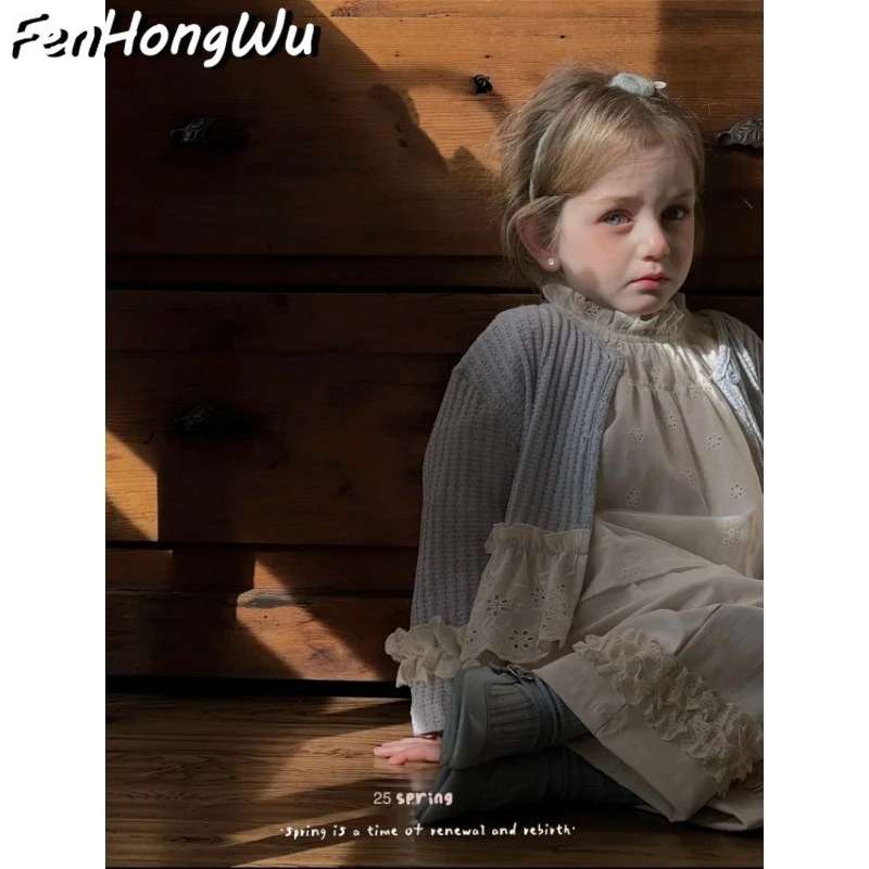 [핑크 집] 한국 아동복 소녀 세트 봄 새 어린이 모리 스티칭 레이스 카디건 넓은 다리 바지