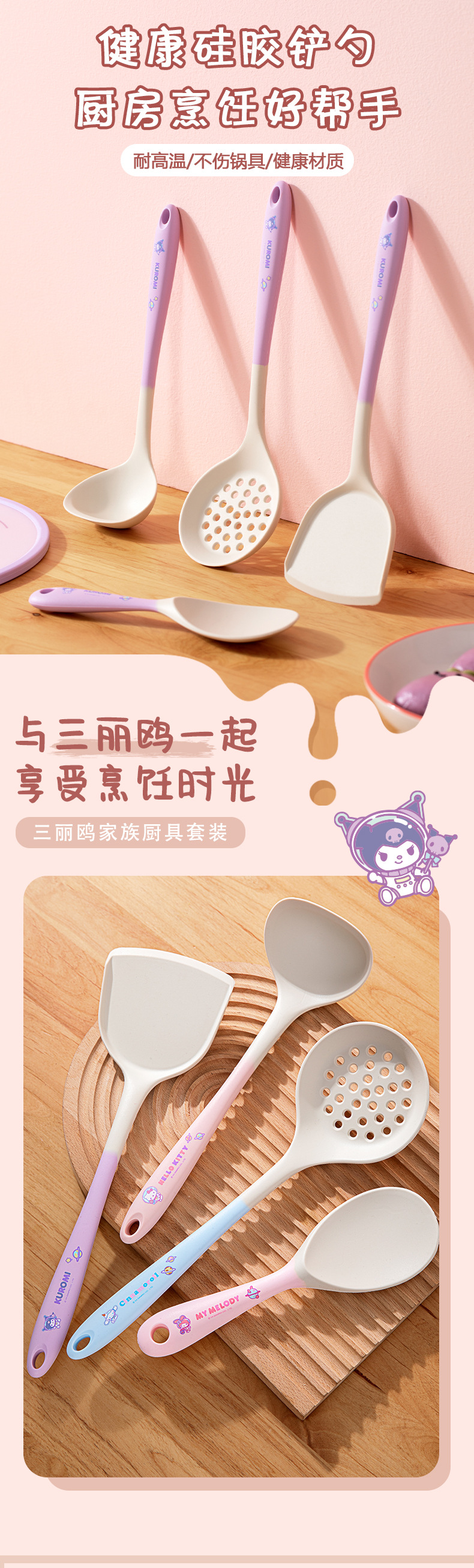 산리오 실리콘 주걱 가정용 붙지 않는 요리 주걱 식품 등급 고온 방지 수프 스푼 주방 용품 세트 BT