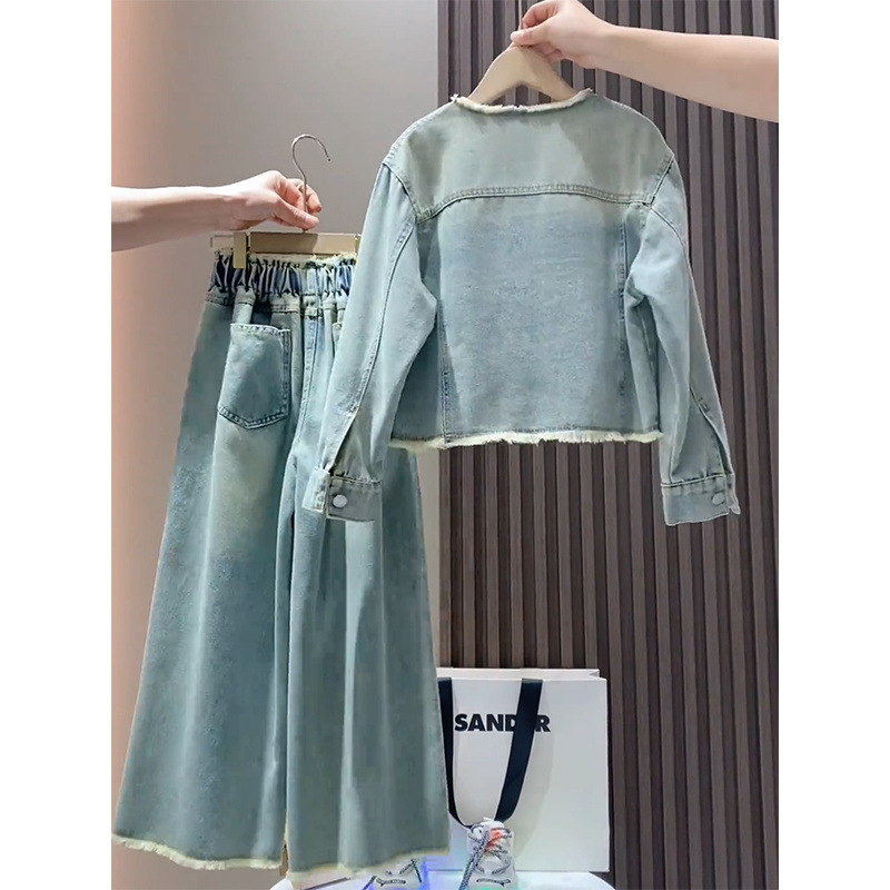 소녀 데님 세트 2025 신형 한국식 어린이 가을 긴팔 재킷, 느슨해지는 허리 바지 투피스 세트