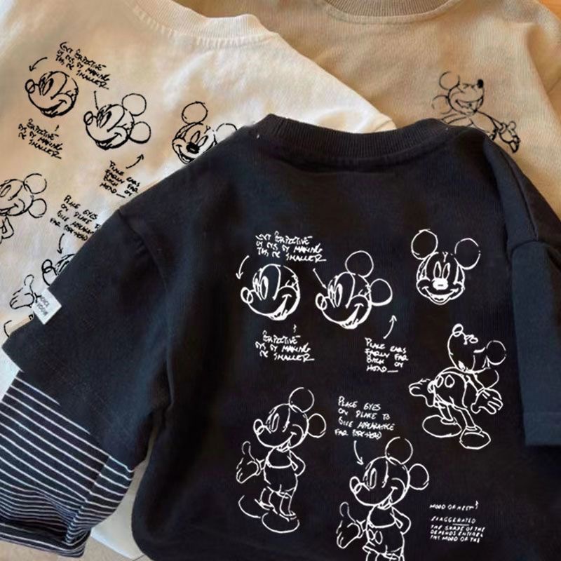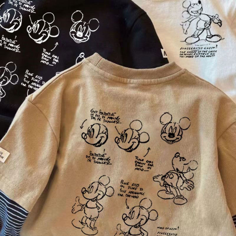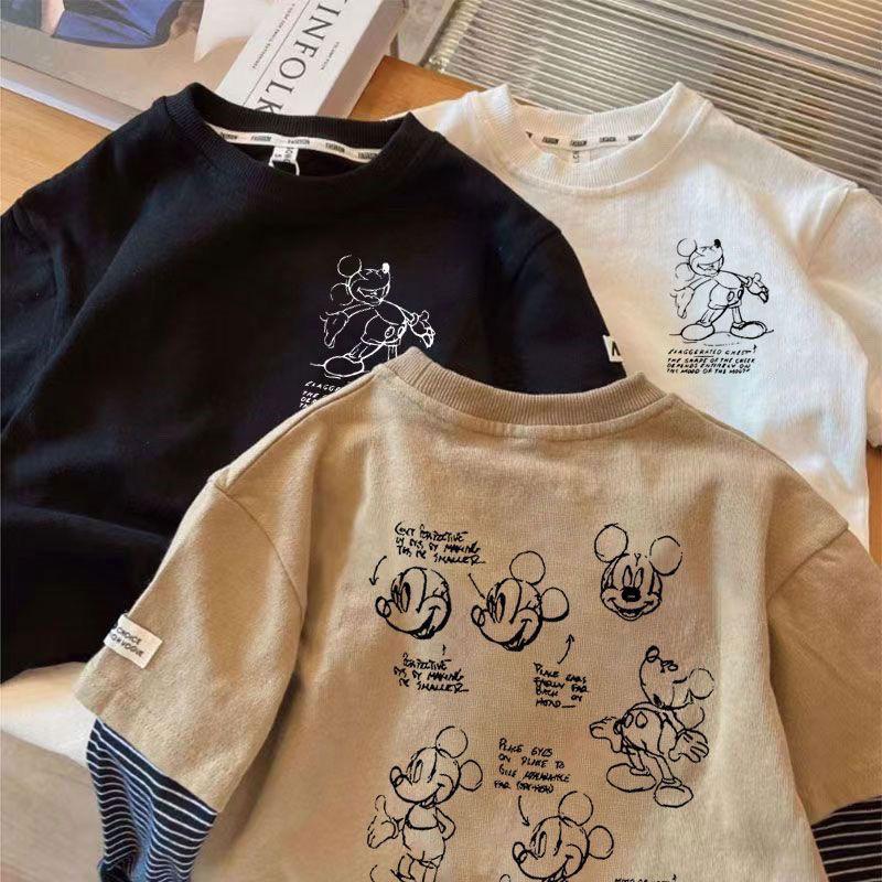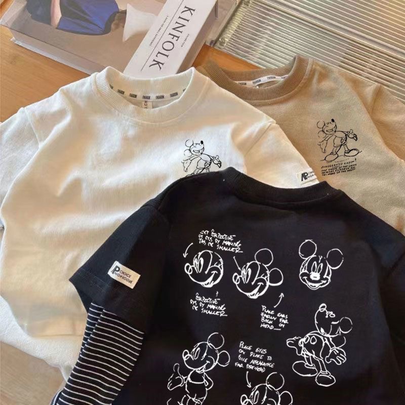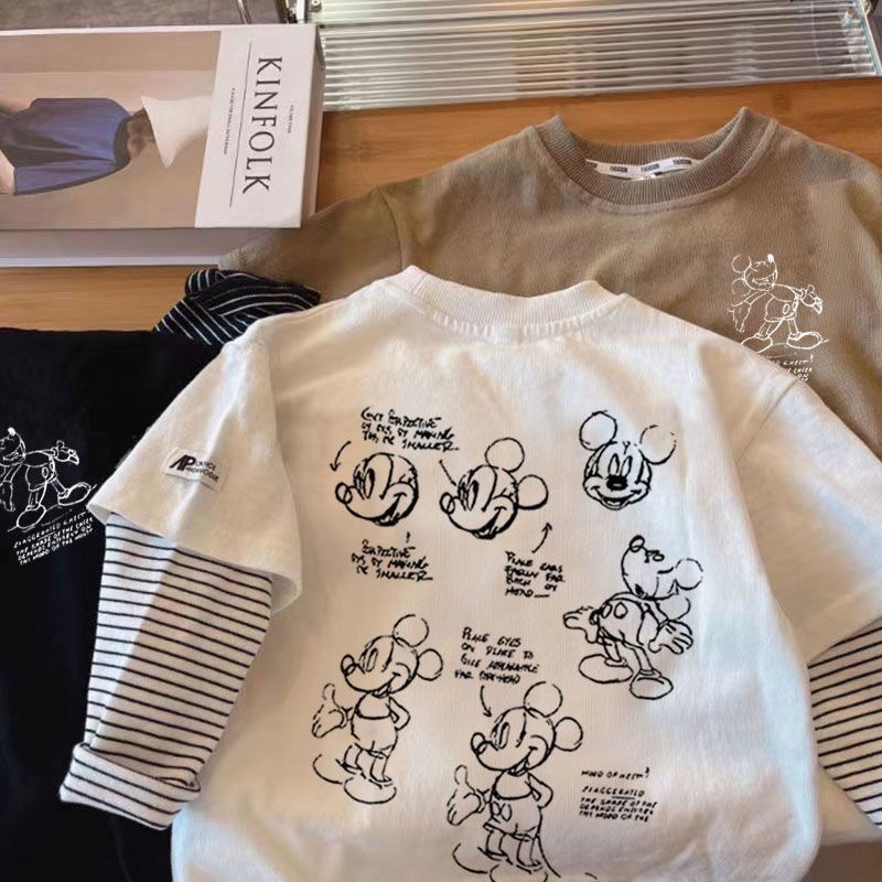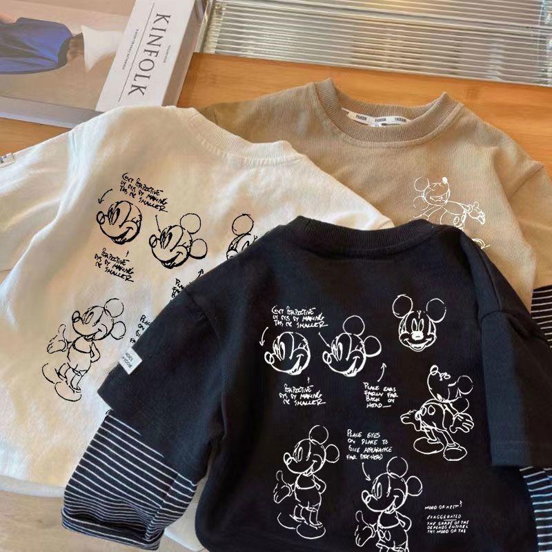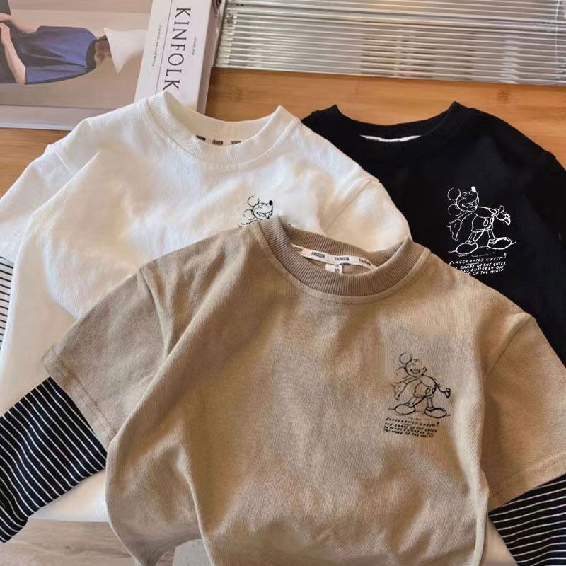 어린이 크루 넥 가짜 두 조각 긴 소매 인쇄 패치 워크 티셔츠 베이스-레이어 올 매치 캐주얼 베이비 풀오버 느슨한 한국 스타일스토어 가기
