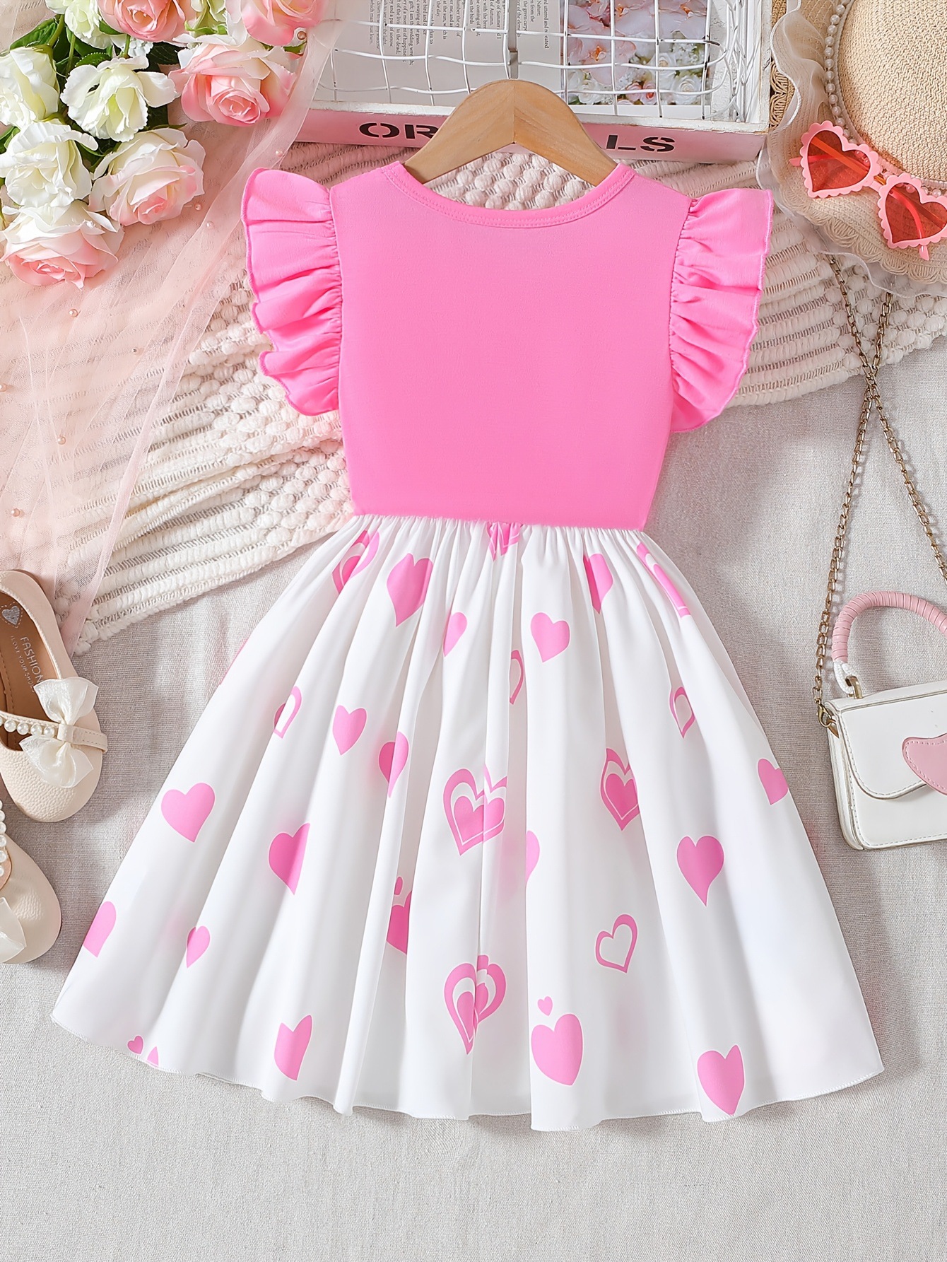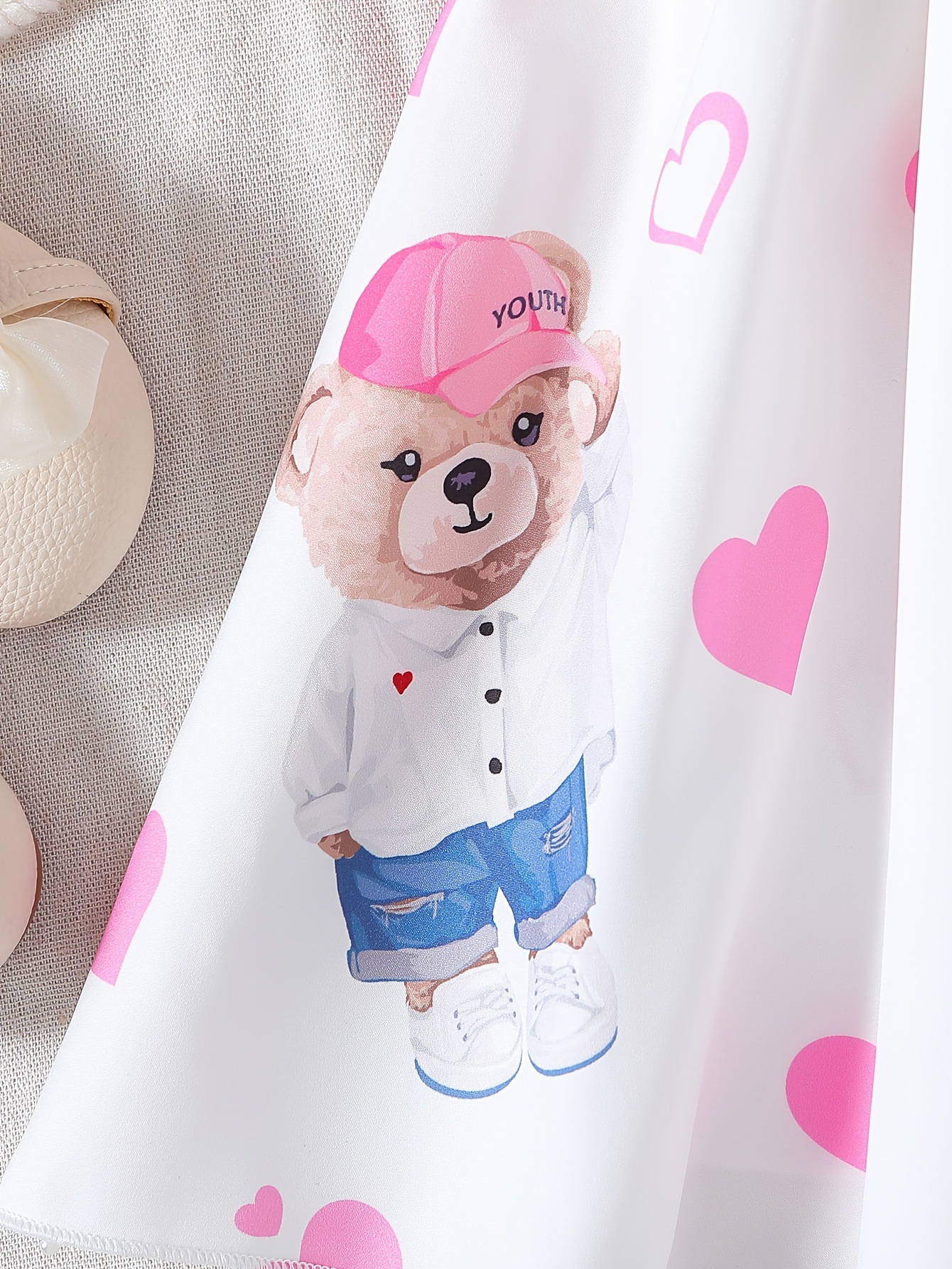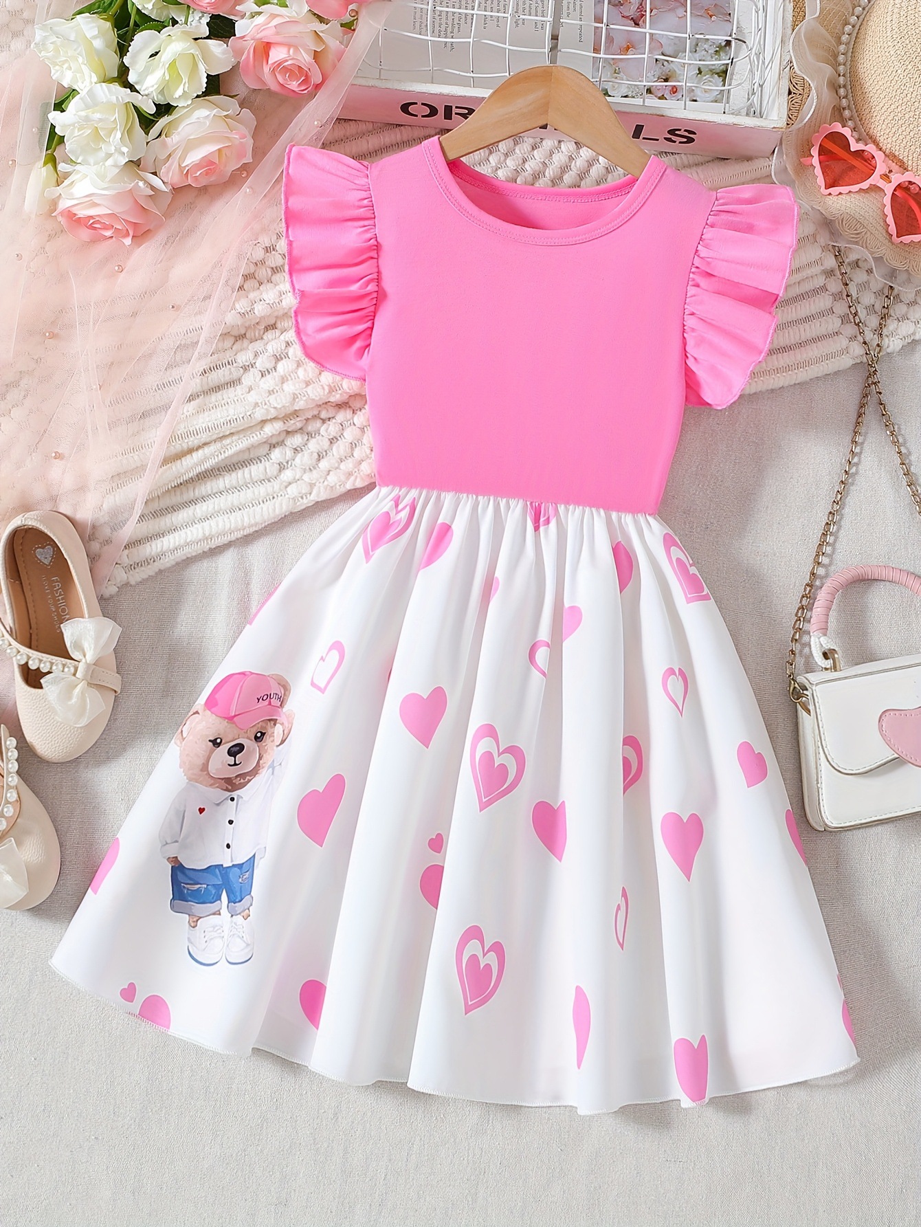 대외 무역 여름 소녀 핑크 비행 소매 원피스 사랑 인쇄 만화 곰 귀여운 어린이 패션 A 라인 스커트스토어 가기