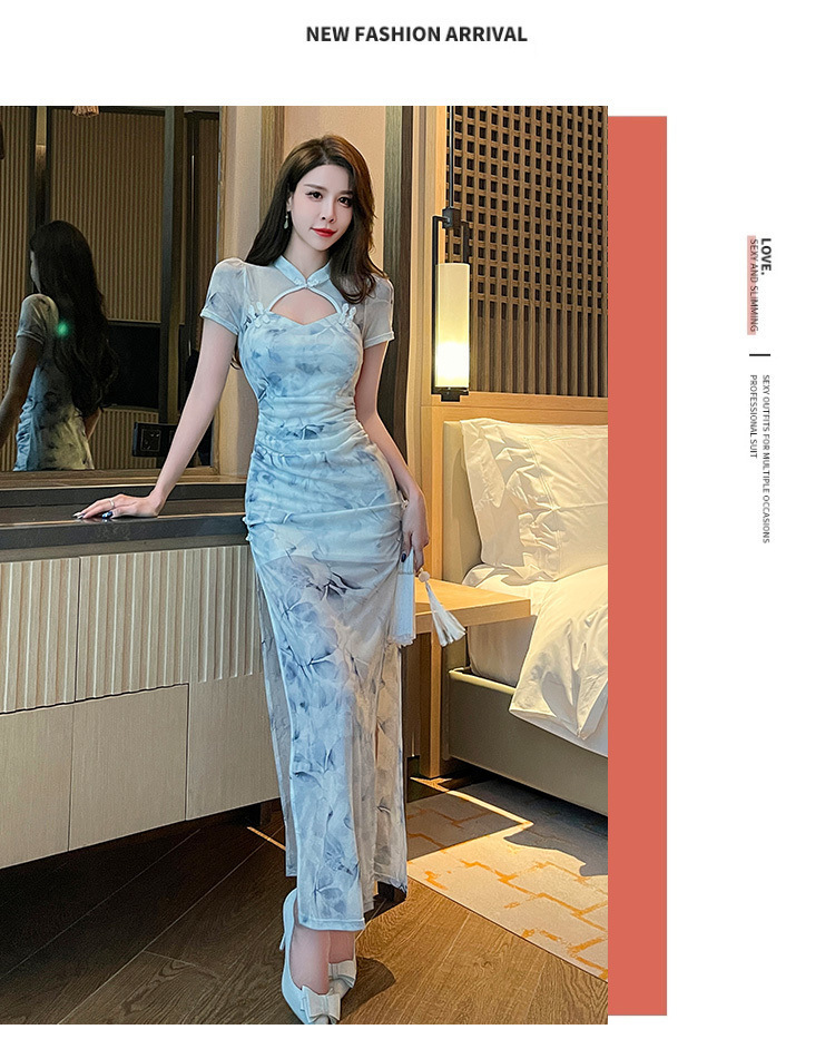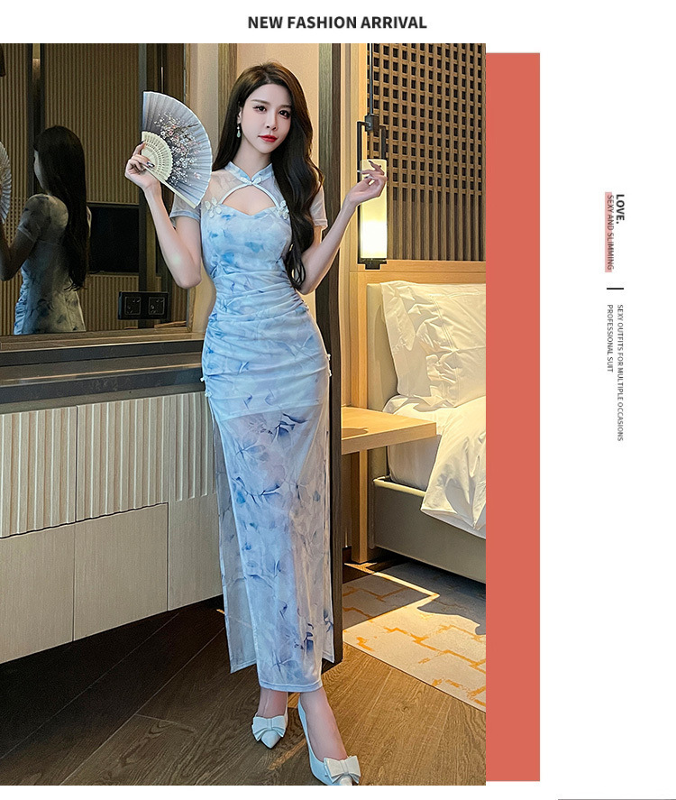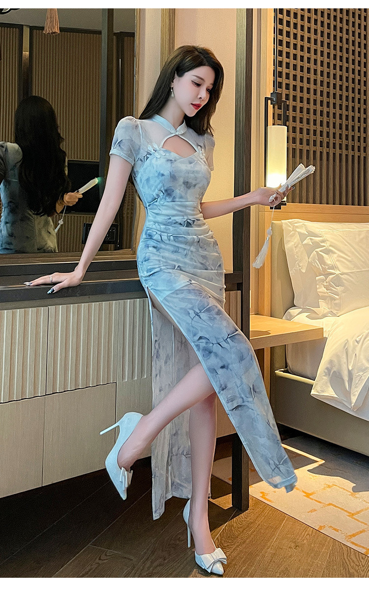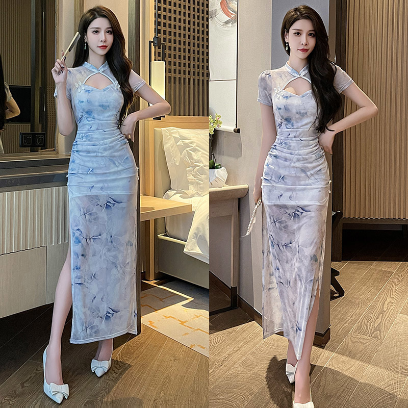패션 국가 스타일 개선 된 청삼 원피스 발 목욕 K 송 스파 소프트 기술자 작업복 섹시한 슬림 핏 배꼽 원피스