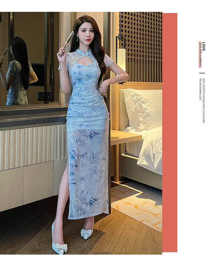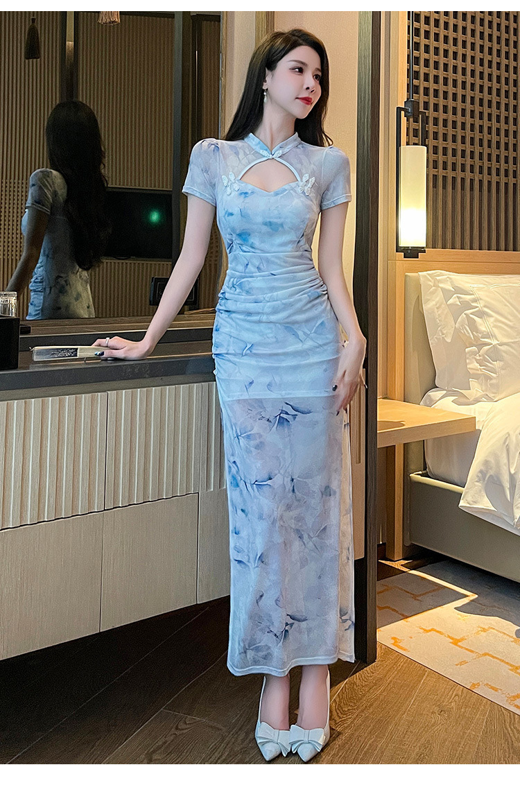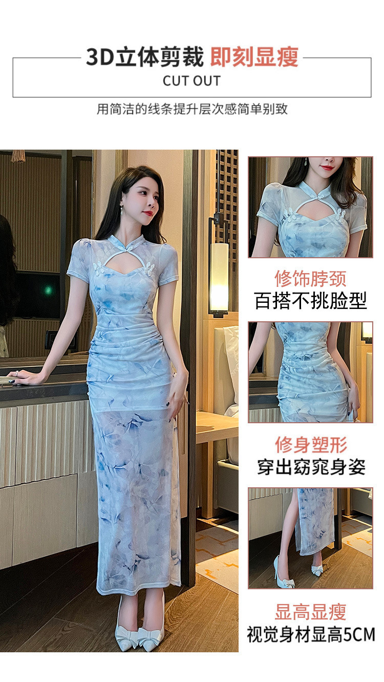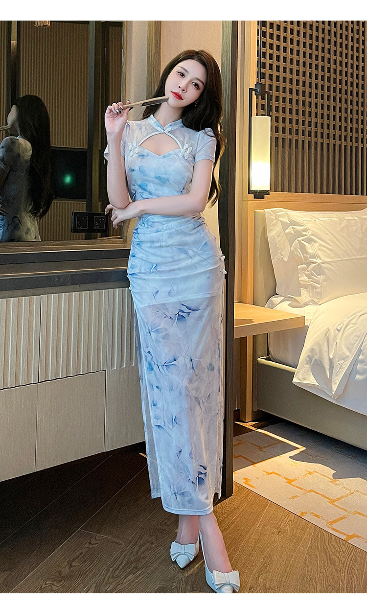 패션 국가 스타일 개선 된 청삼 원피스 발 목욕 K 송 스파 소프트 기술자 작업복 섹시한 슬림 핏 배꼽 원피스