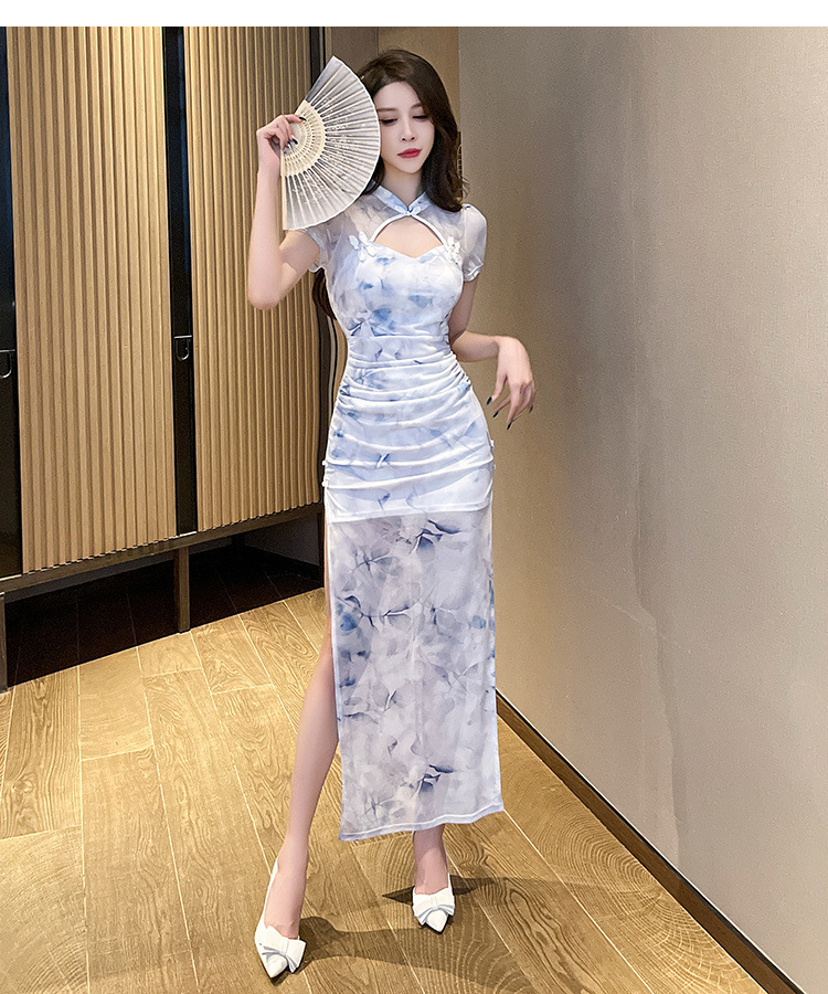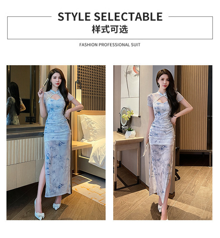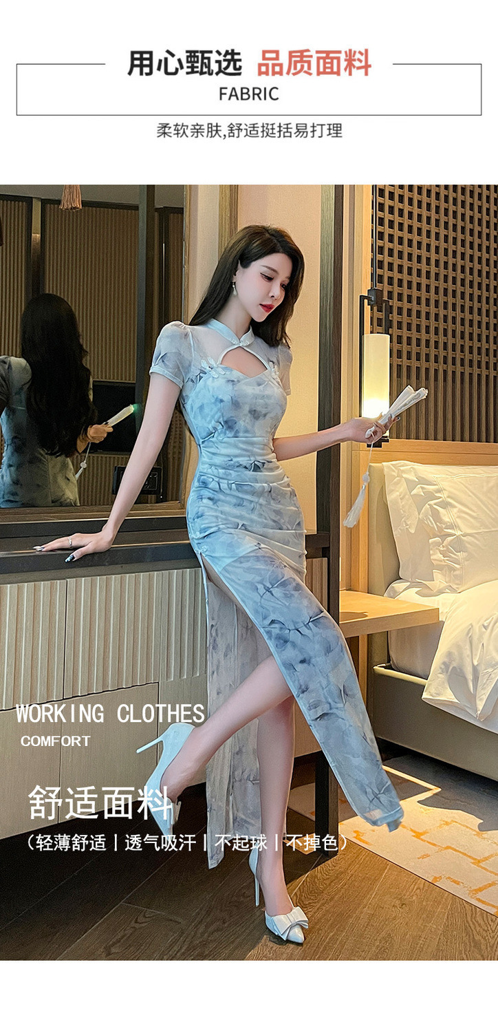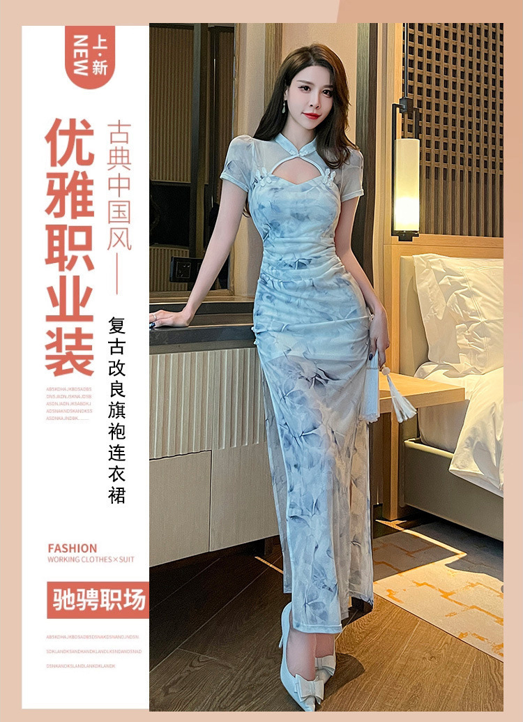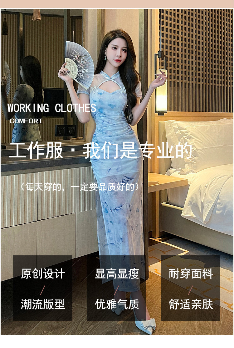 패션 국가 스타일 개선 된 청삼 원피스 발 목욕 K 송 스파 소프트 기술자 작업복 섹시한 슬림 핏 배꼽 원피스스토어 가기