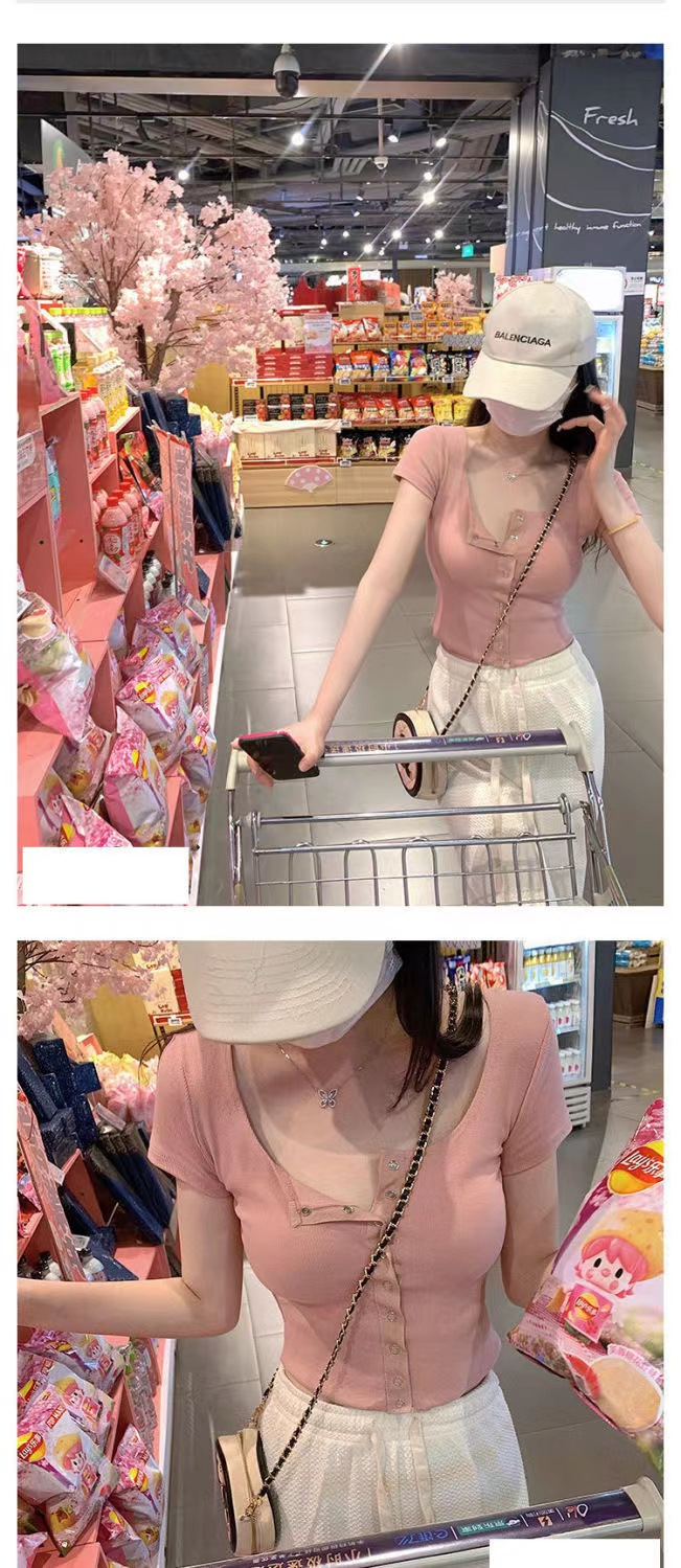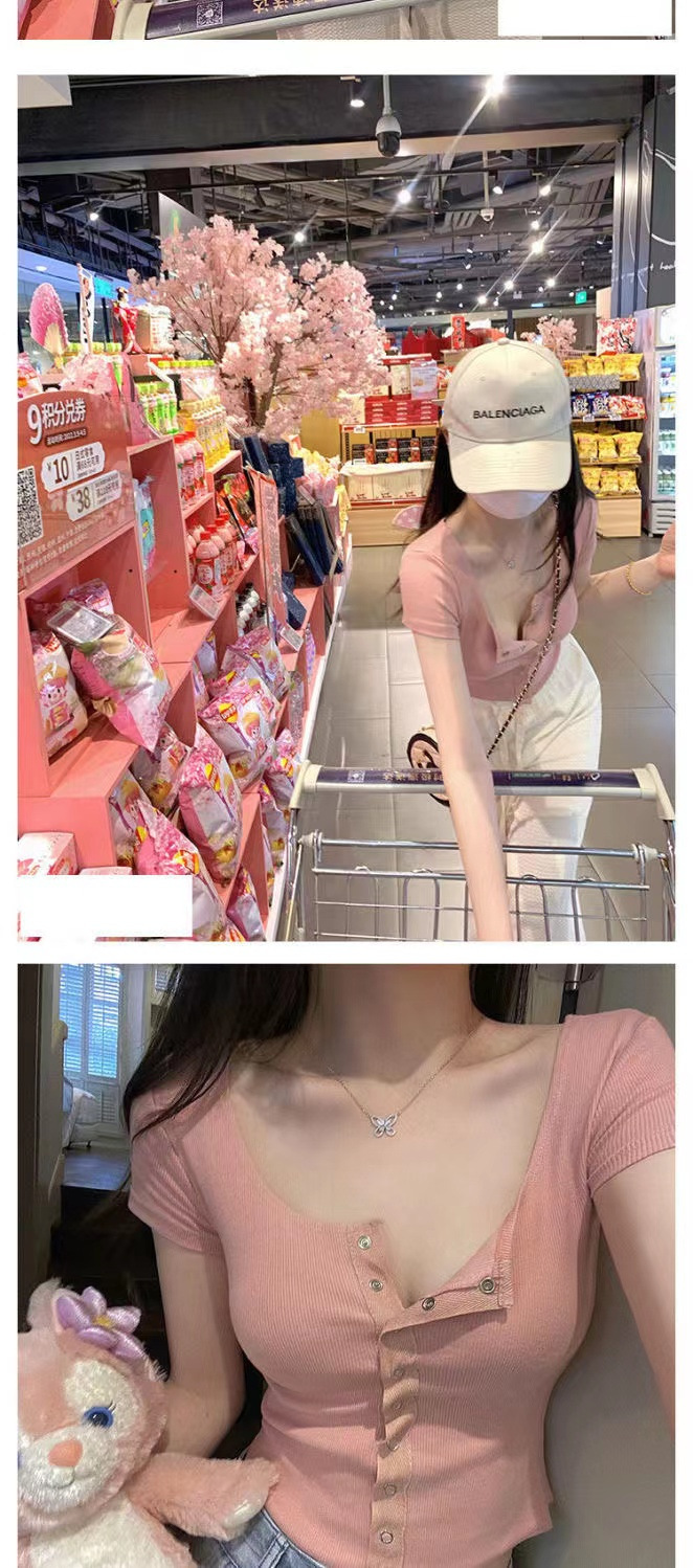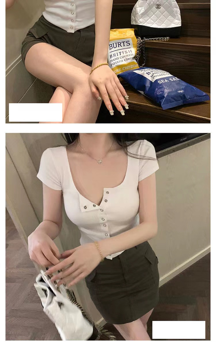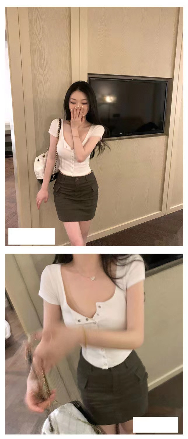 순수한 욕망 스타일 U-넥 반팔 티셔츠 여성 2025 년 여름 새로운 디자인 센스 슬림핏 베이스 셔츠 뜨거운 여자 섹시한 탑 쇼트스토어 가기