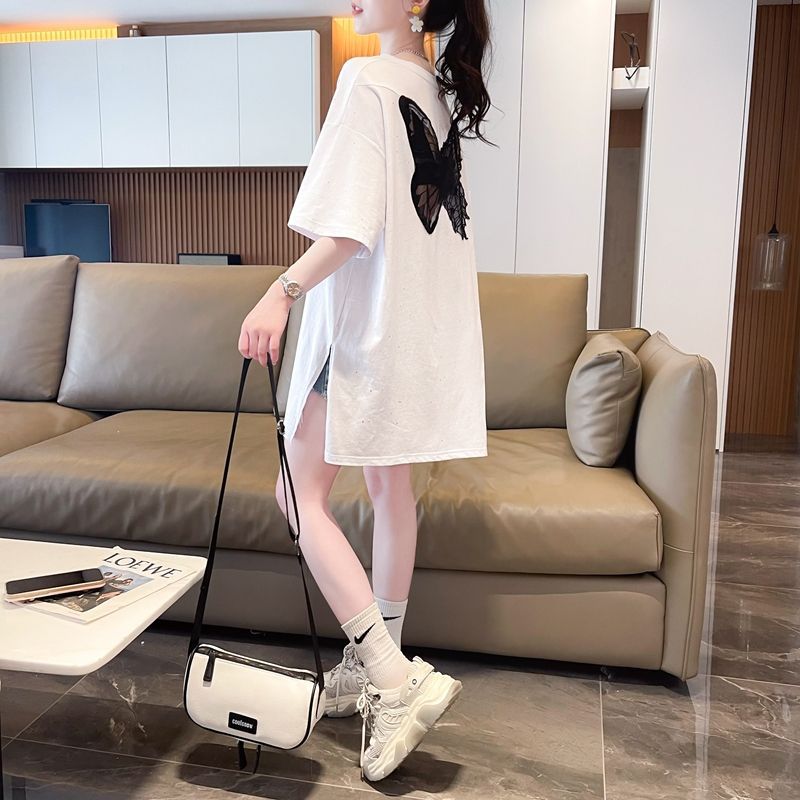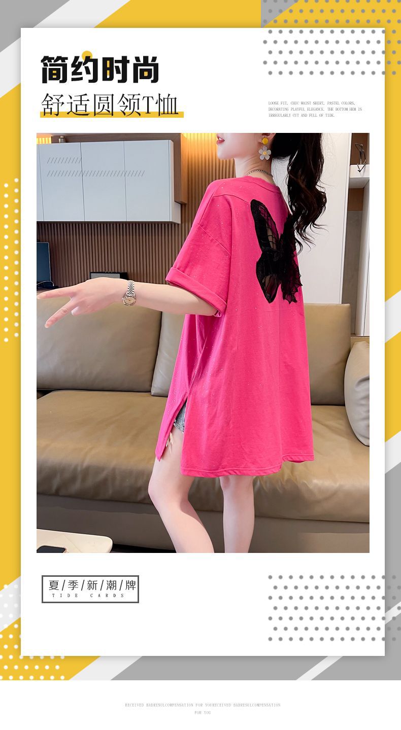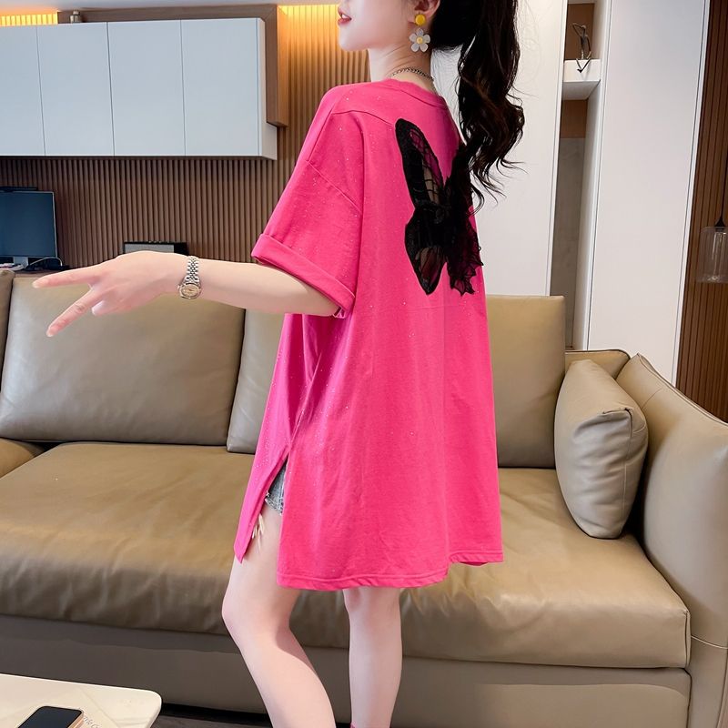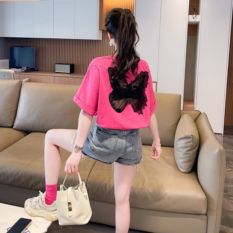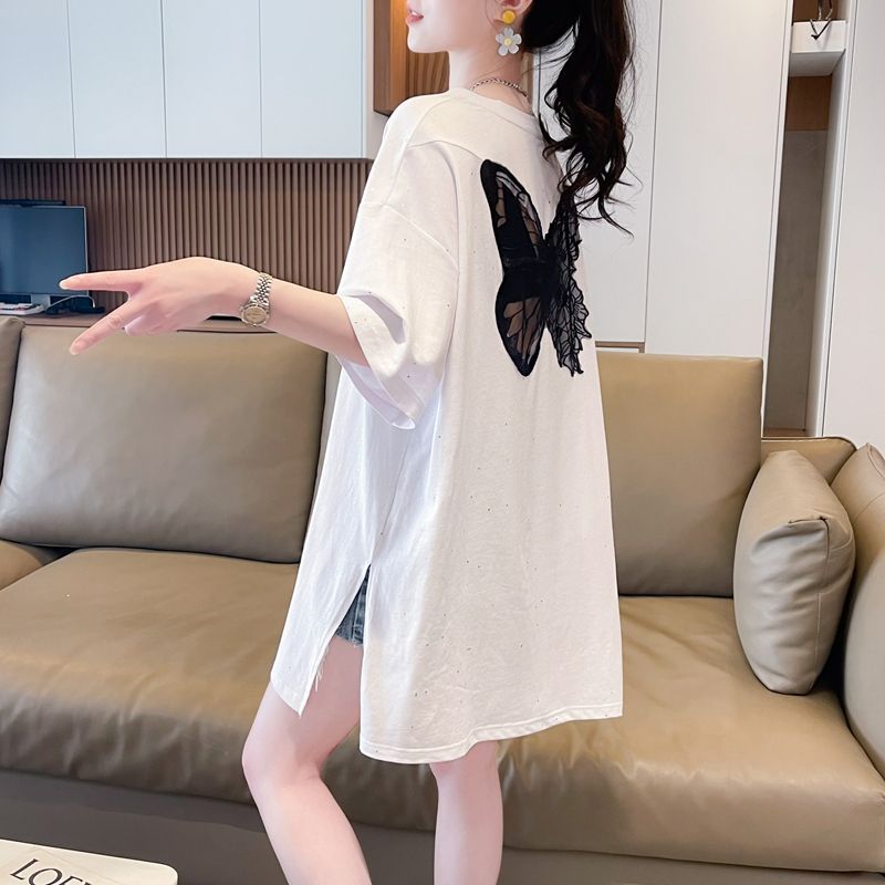 나비 메쉬 백리스 코튼 반팔 티셔츠 여성 여름 새로운 한국식 느슨한 플러스 사이즈 분할 디자인 탑스토어 가기