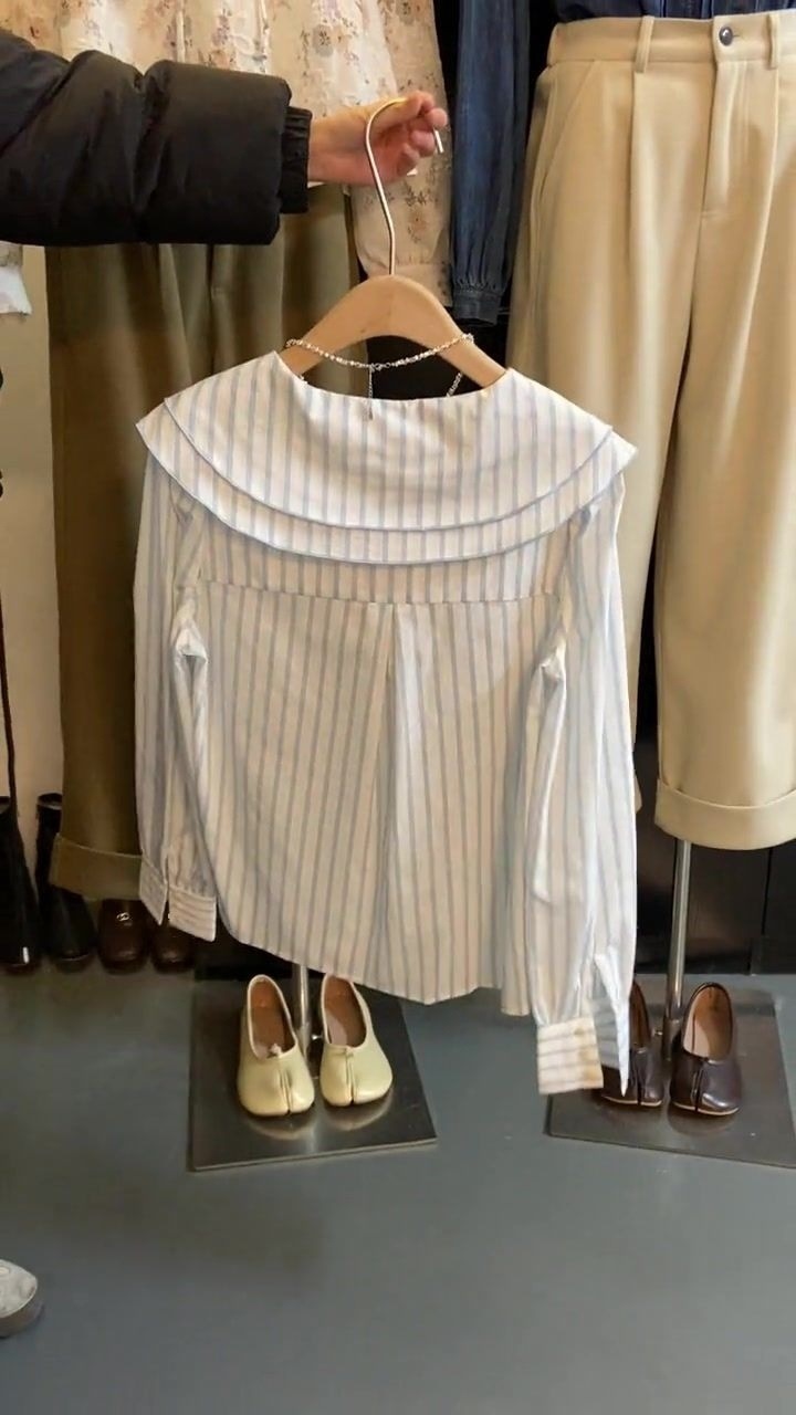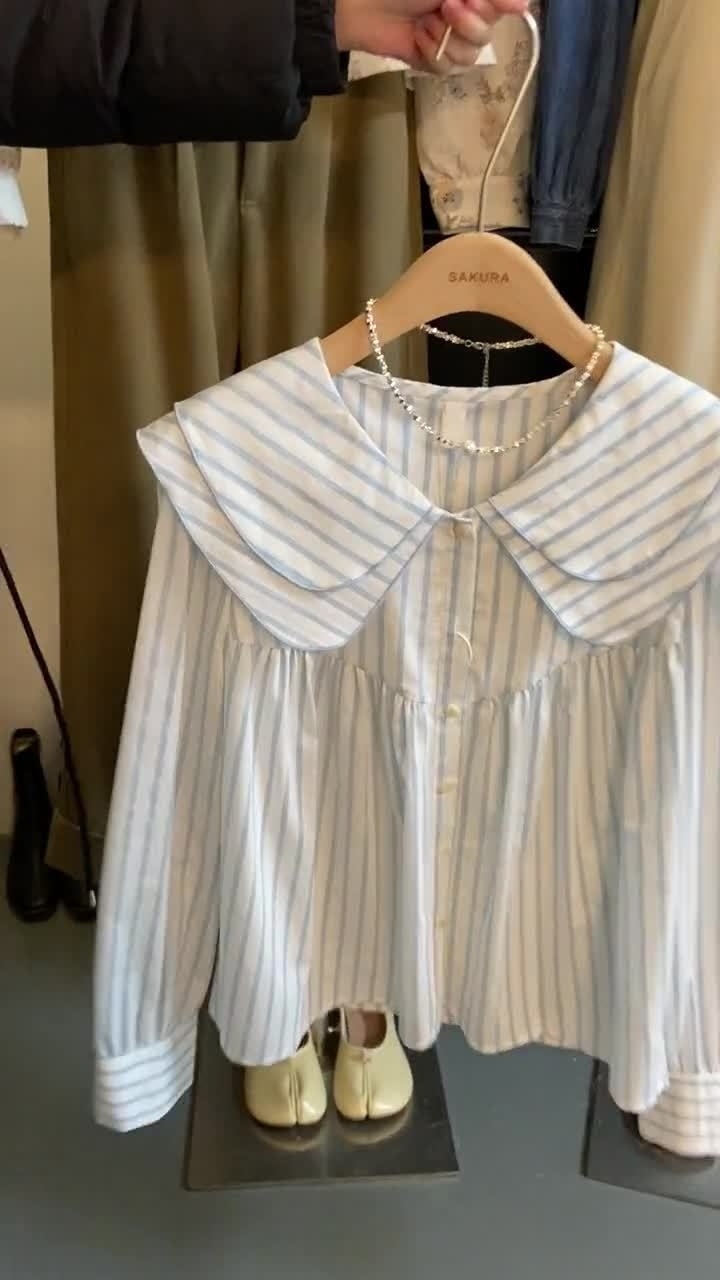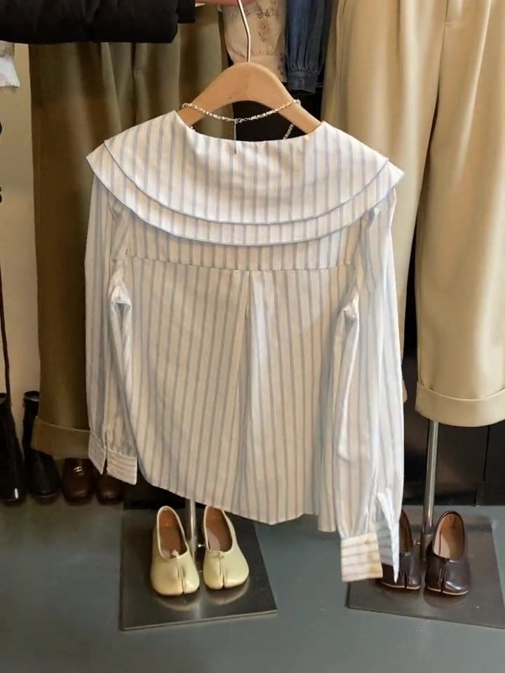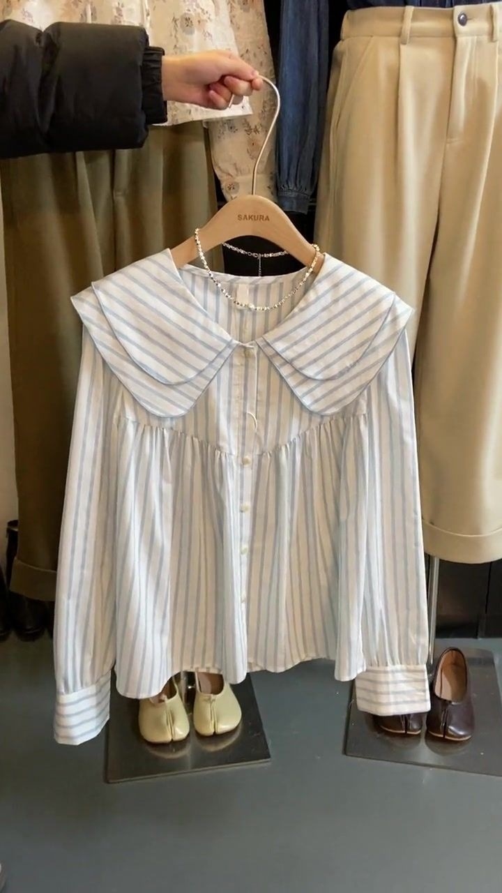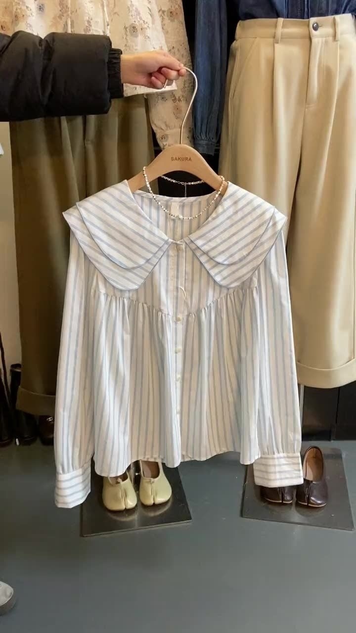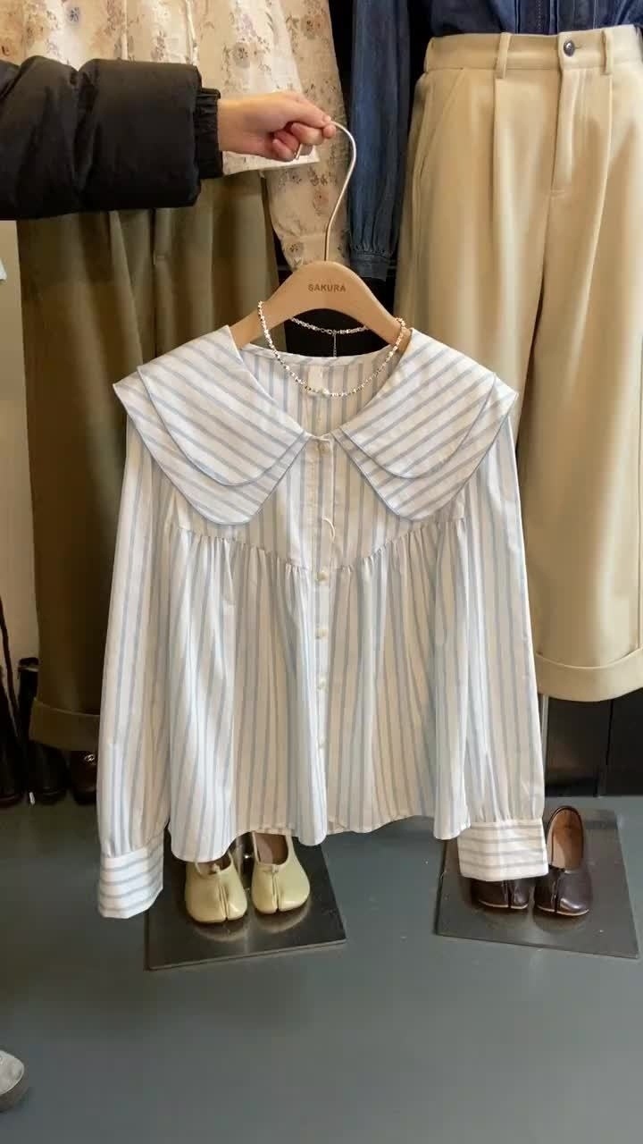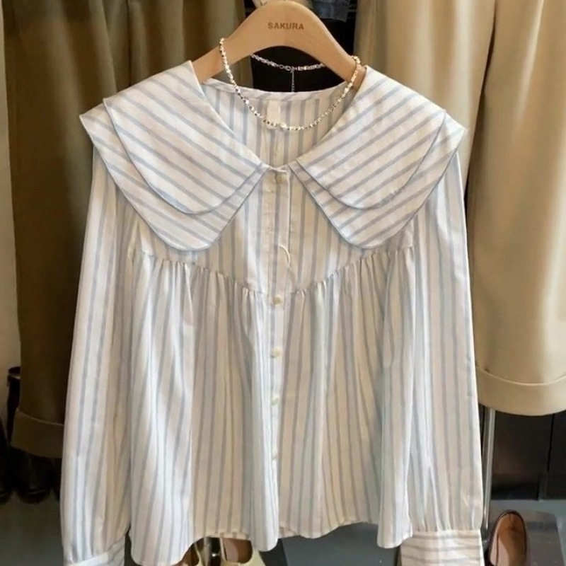프랑스 줄무늬 인형 칼라 셔츠 여성의 봄과 가을 디자인 센스 틈새 패션 연령 감소 독특한 세련된 긴 소매 탑스토어 가기