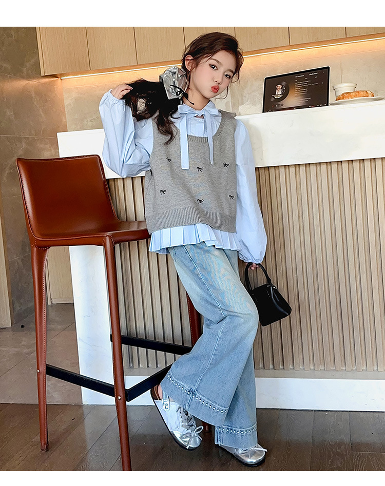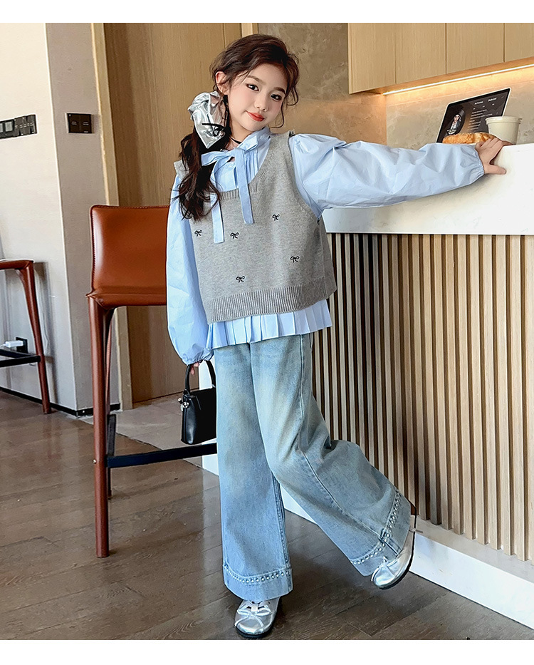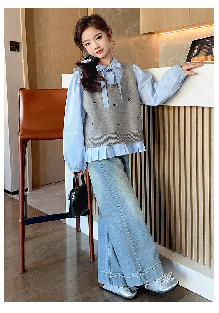 오렌지 호랑이 소녀 봄과 가을 세트 2025 유행 소녀 한국 스타일 어린이 서양 스웨터 조끼 셔츠스토어 가기