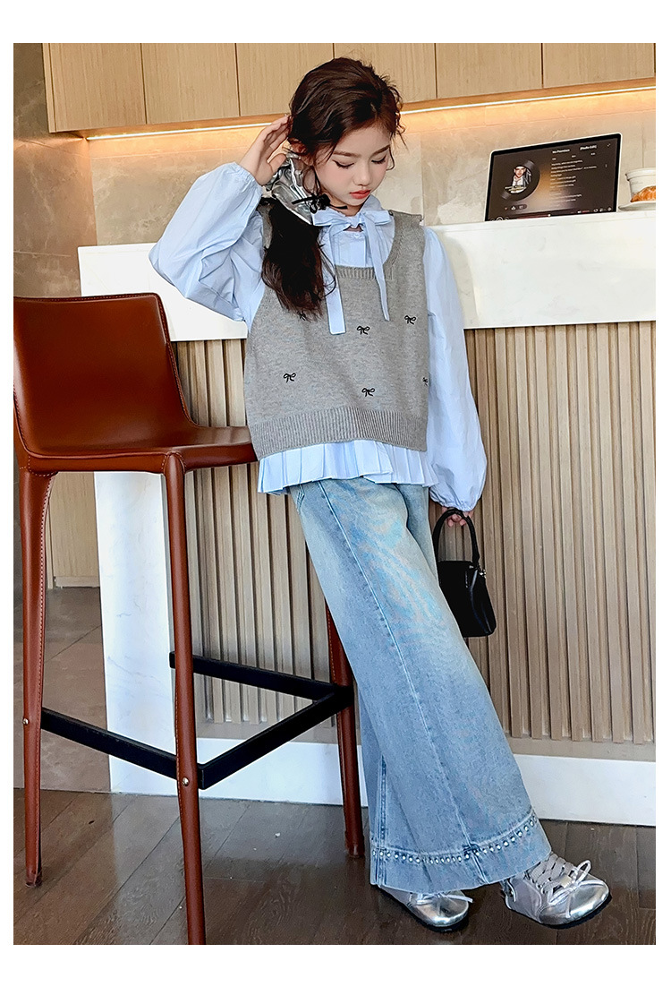 오렌지 호랑이 소녀 봄과 가을 세트 2025 유행 소녀 한국 스타일 어린이 서양 스웨터 조끼 셔츠