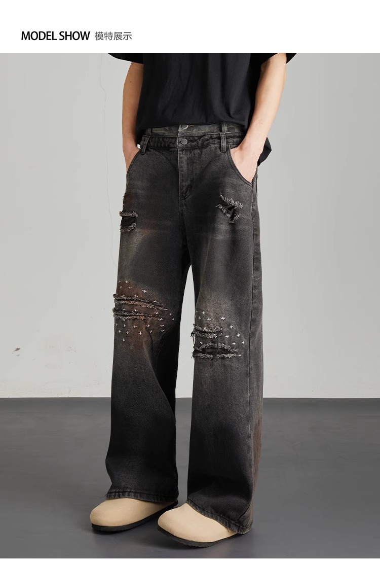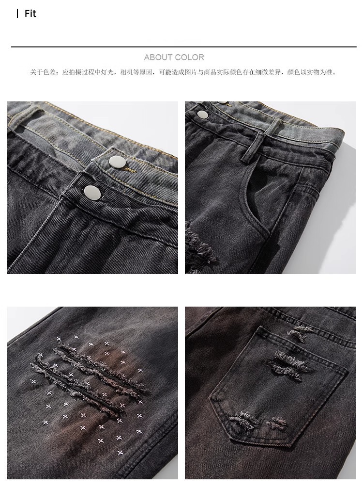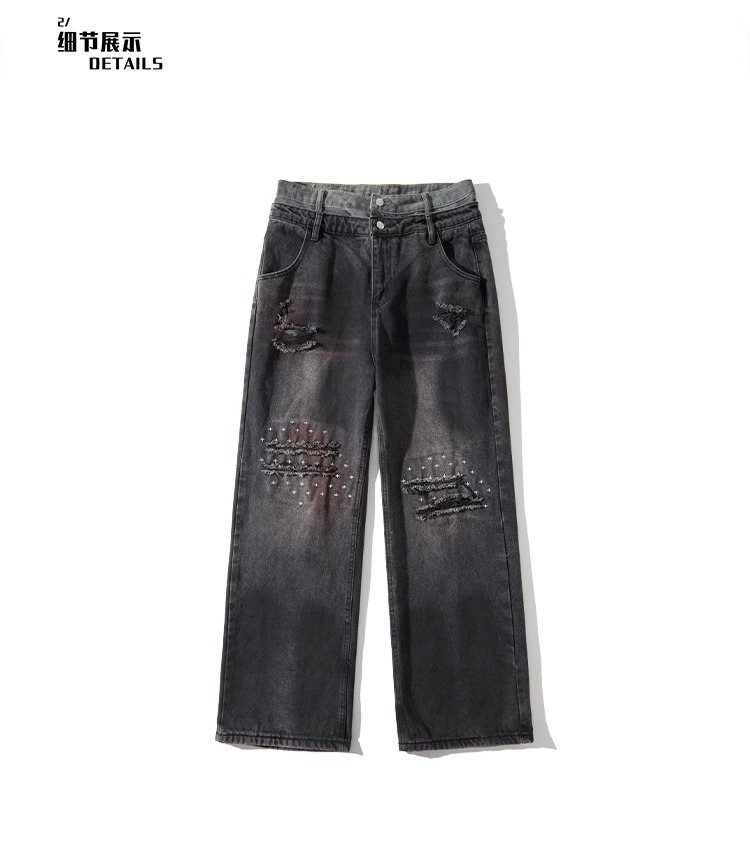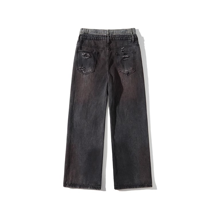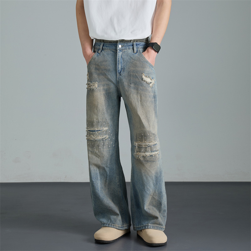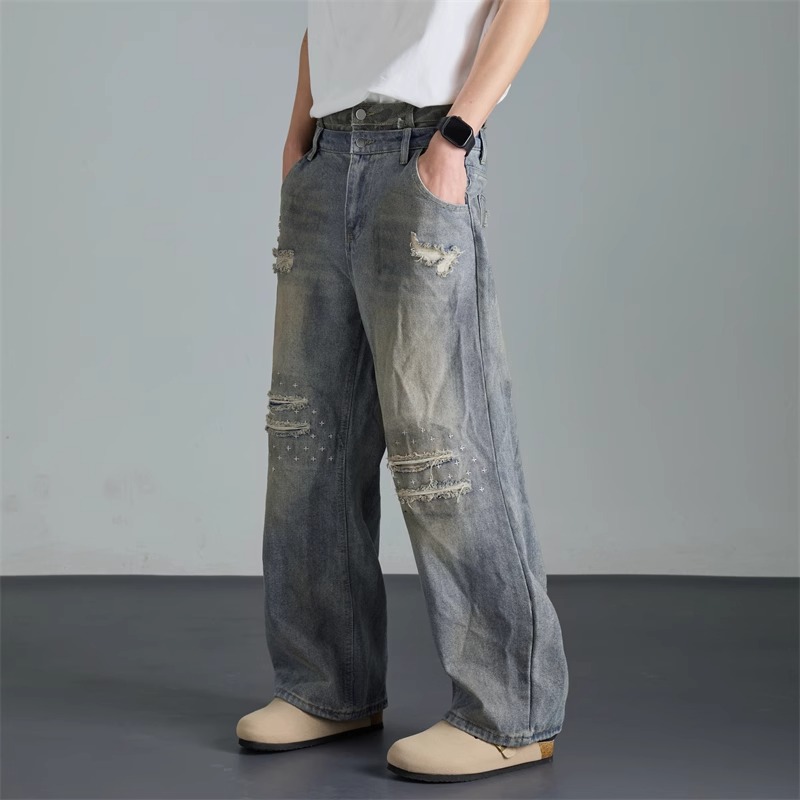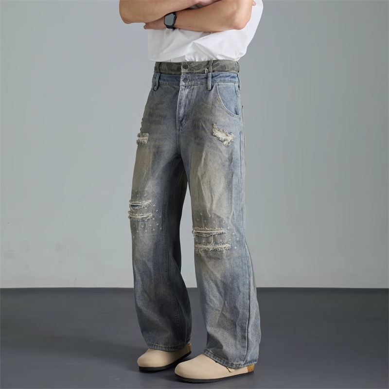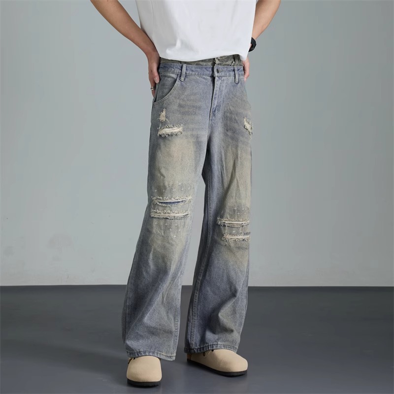 라이트 블루 아메리칸 스타일 높은 허리 찢어진 청바지 남성과 여성의 봄과 가을은 스트레이트 Distinctive 느슨한 넓은 다리 바지스토어 가기