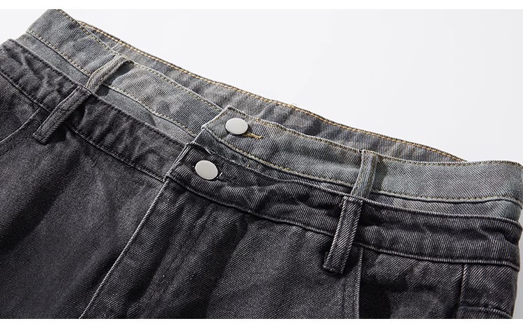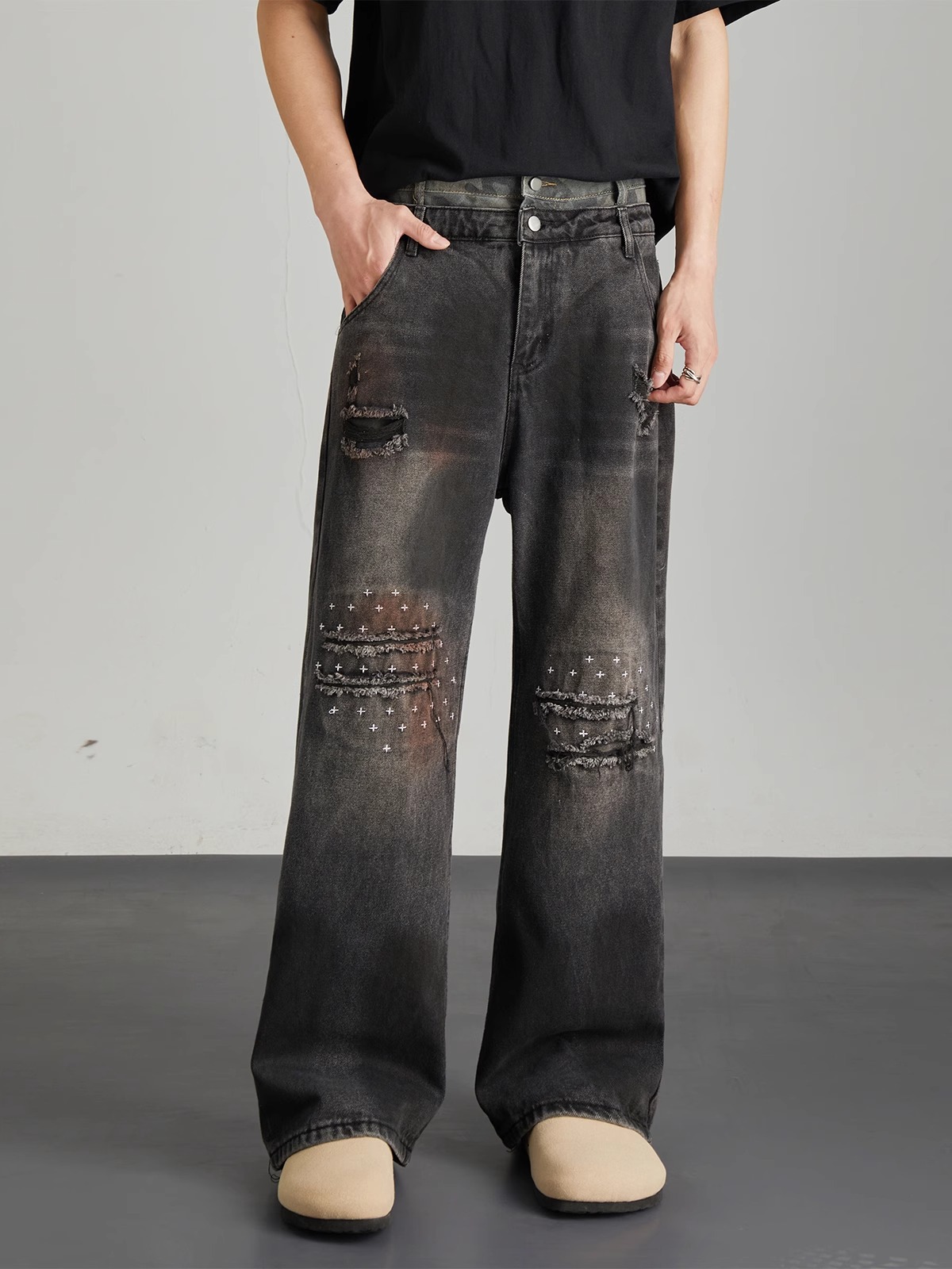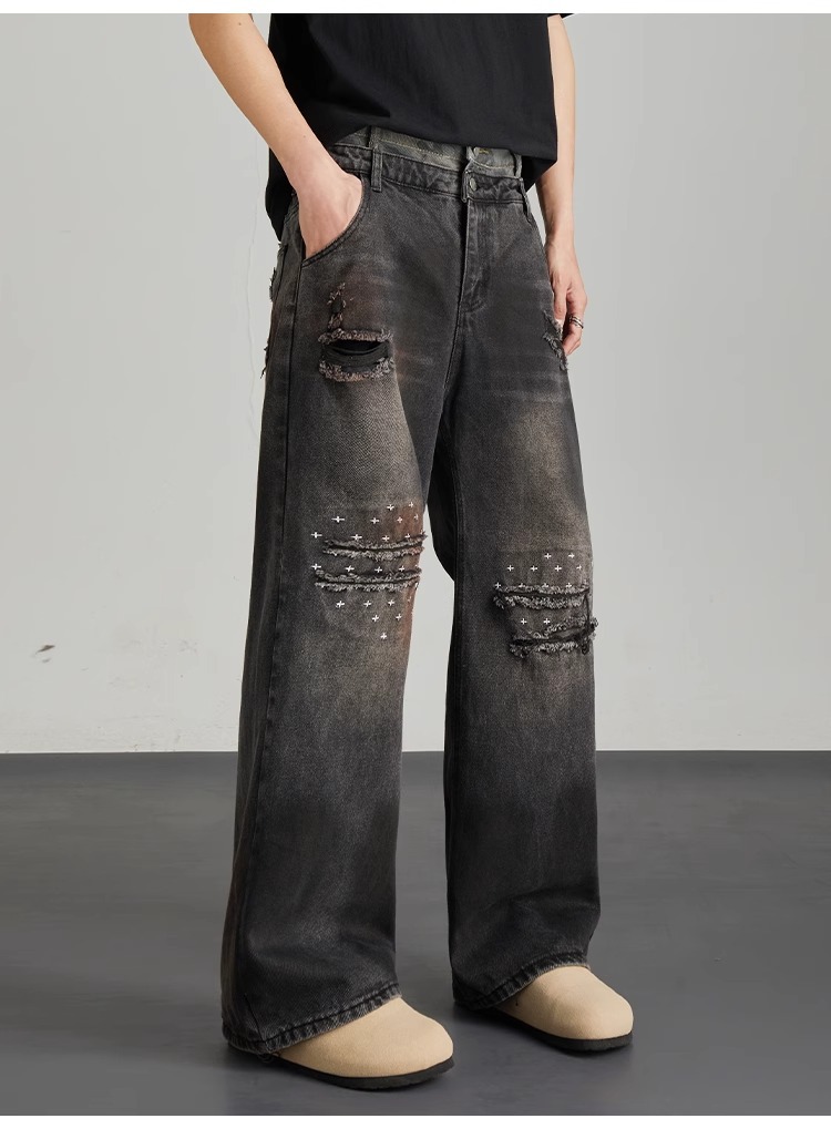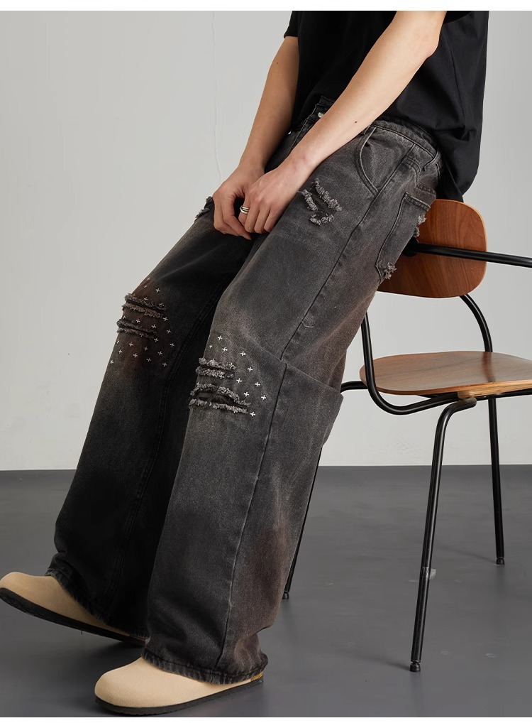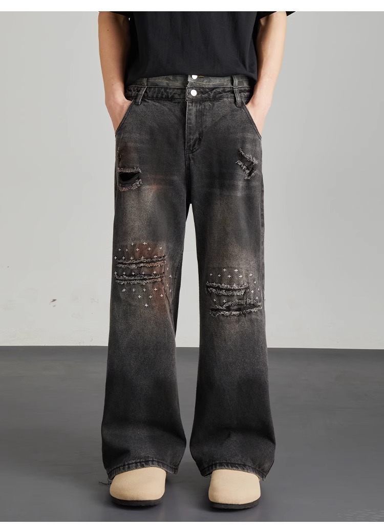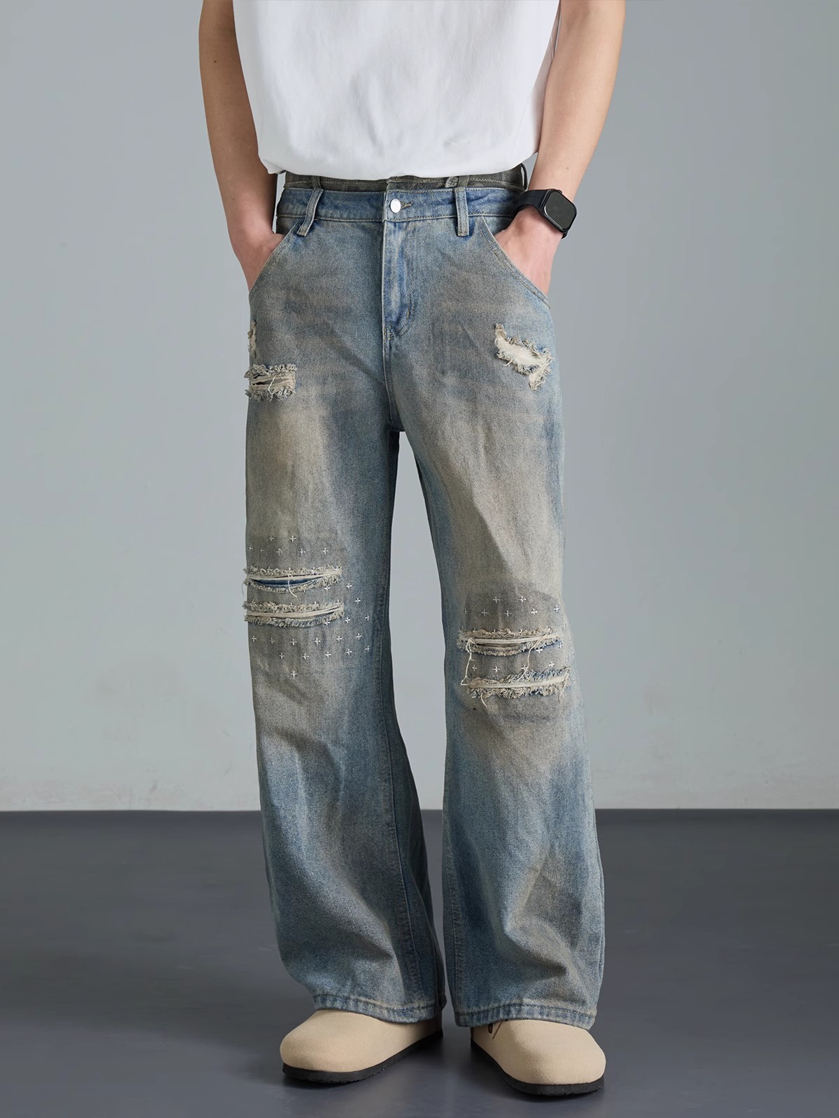 라이트 블루 아메리칸 스타일 높은 허리 찢어진 청바지 남성과 여성의 봄과 가을은 스트레이트 Distinctive 느슨한 넓은 다리 바지스토어 가기