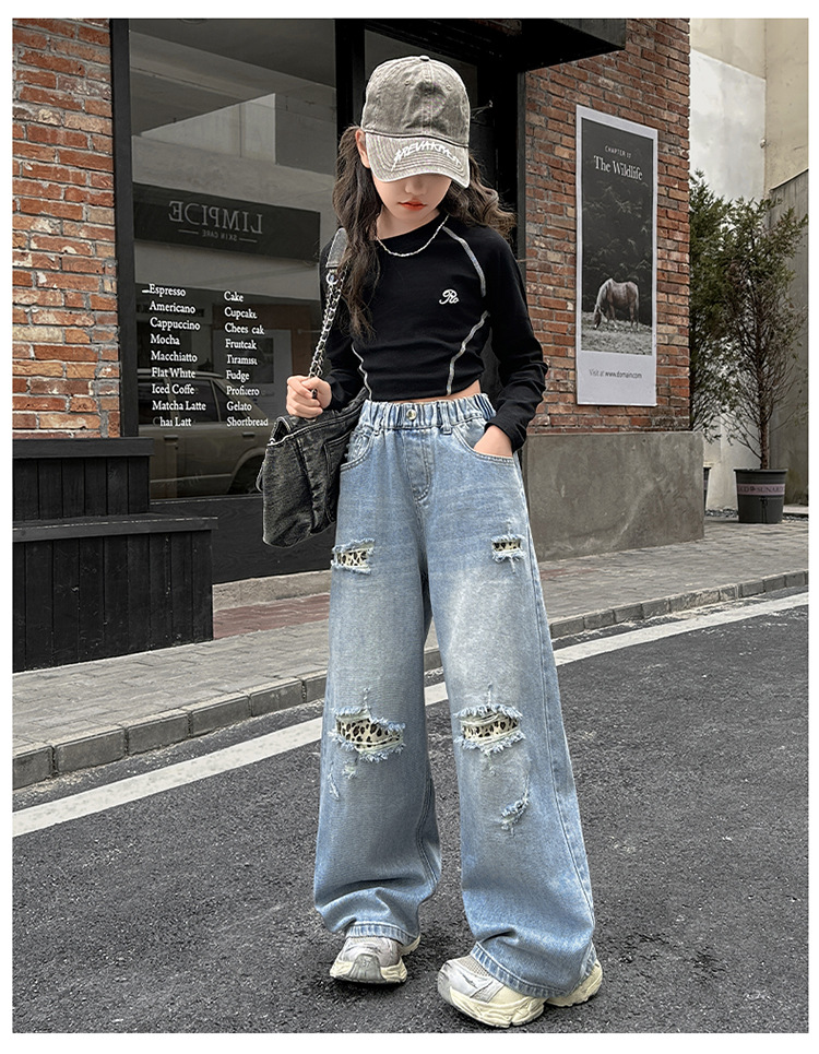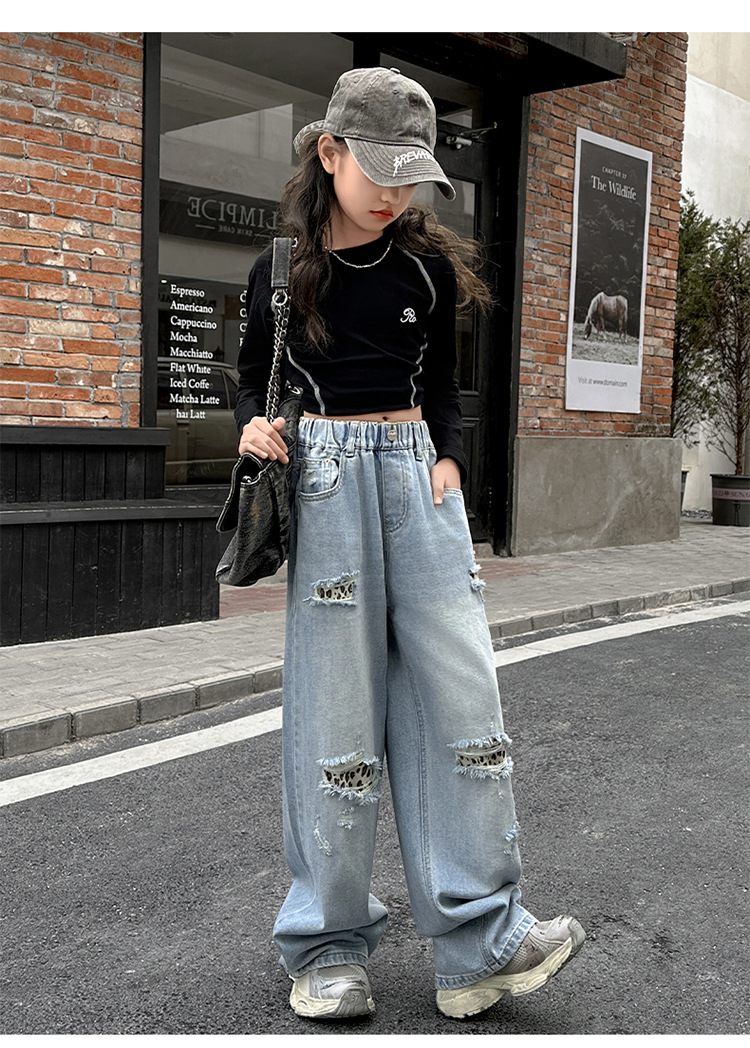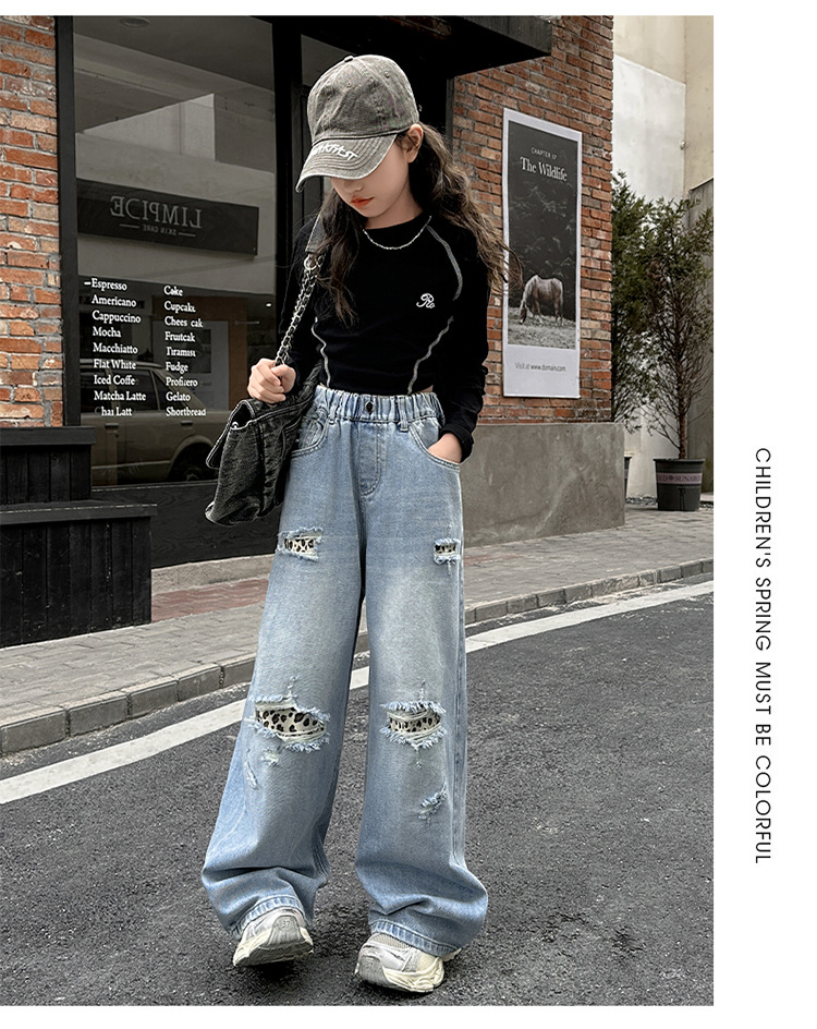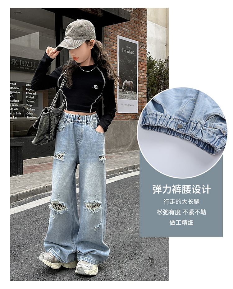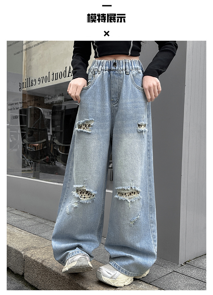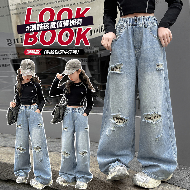 소녀 찢어진 청바지 봄 새로운 2025 서양식 대형 어린이 레오파드 무늬 청바지 도매 트렌디스토어 가기