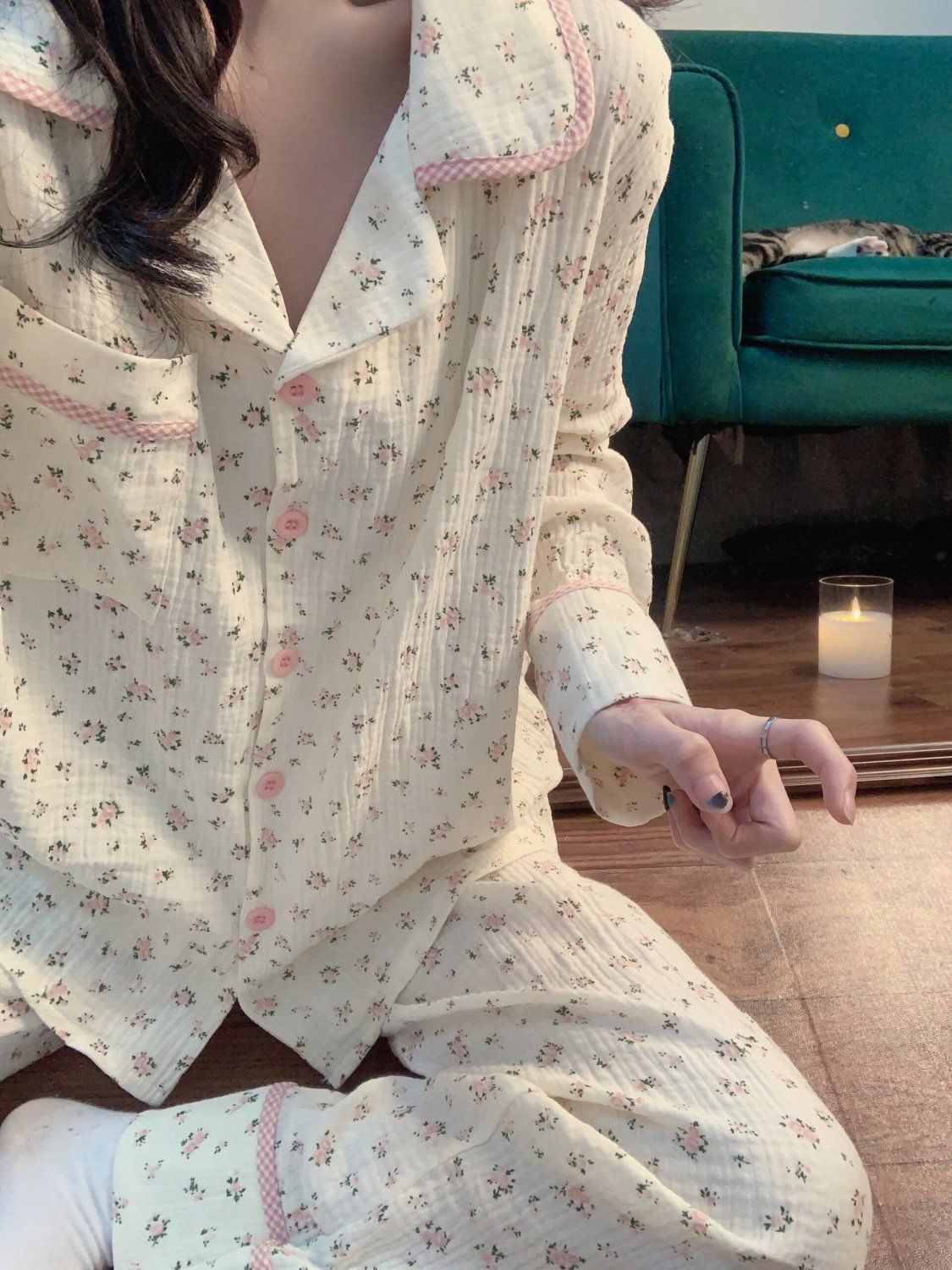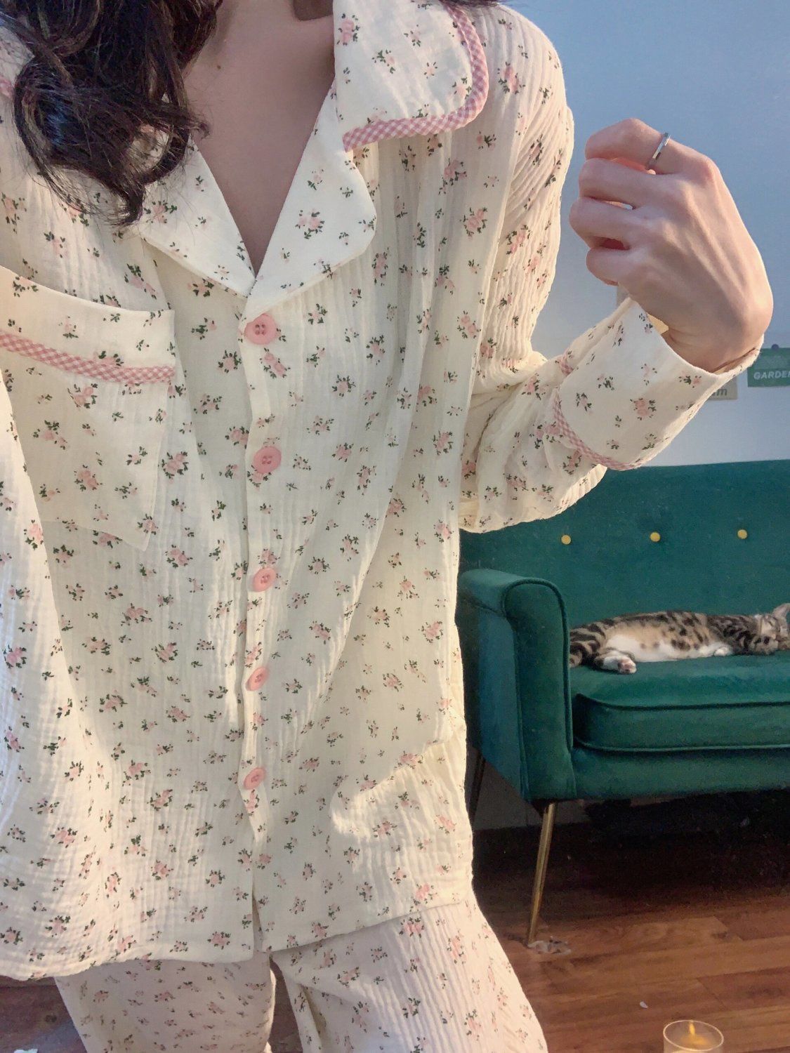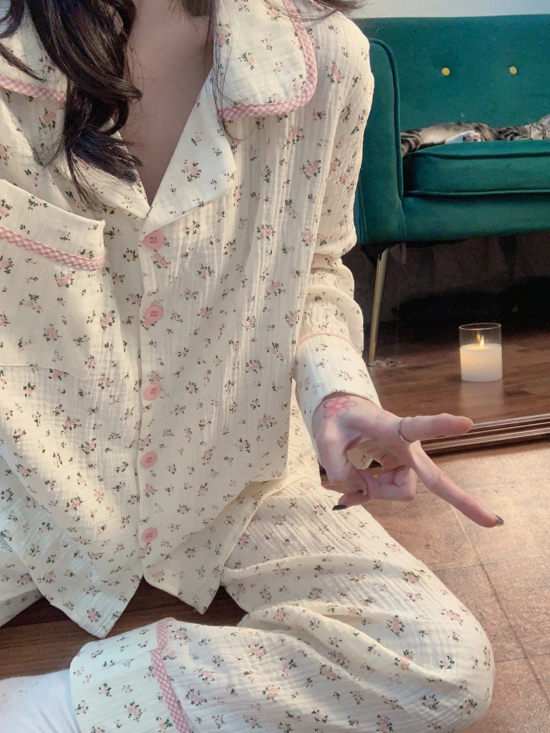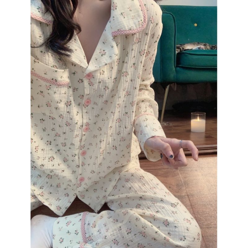 달콤한 꽃 파자마 여성의 봄과 가을 새로운 긴 소매 바지 Ins 일본 스타일 간단한 학생 홈 의류 세트 외부 착용스토어 가기