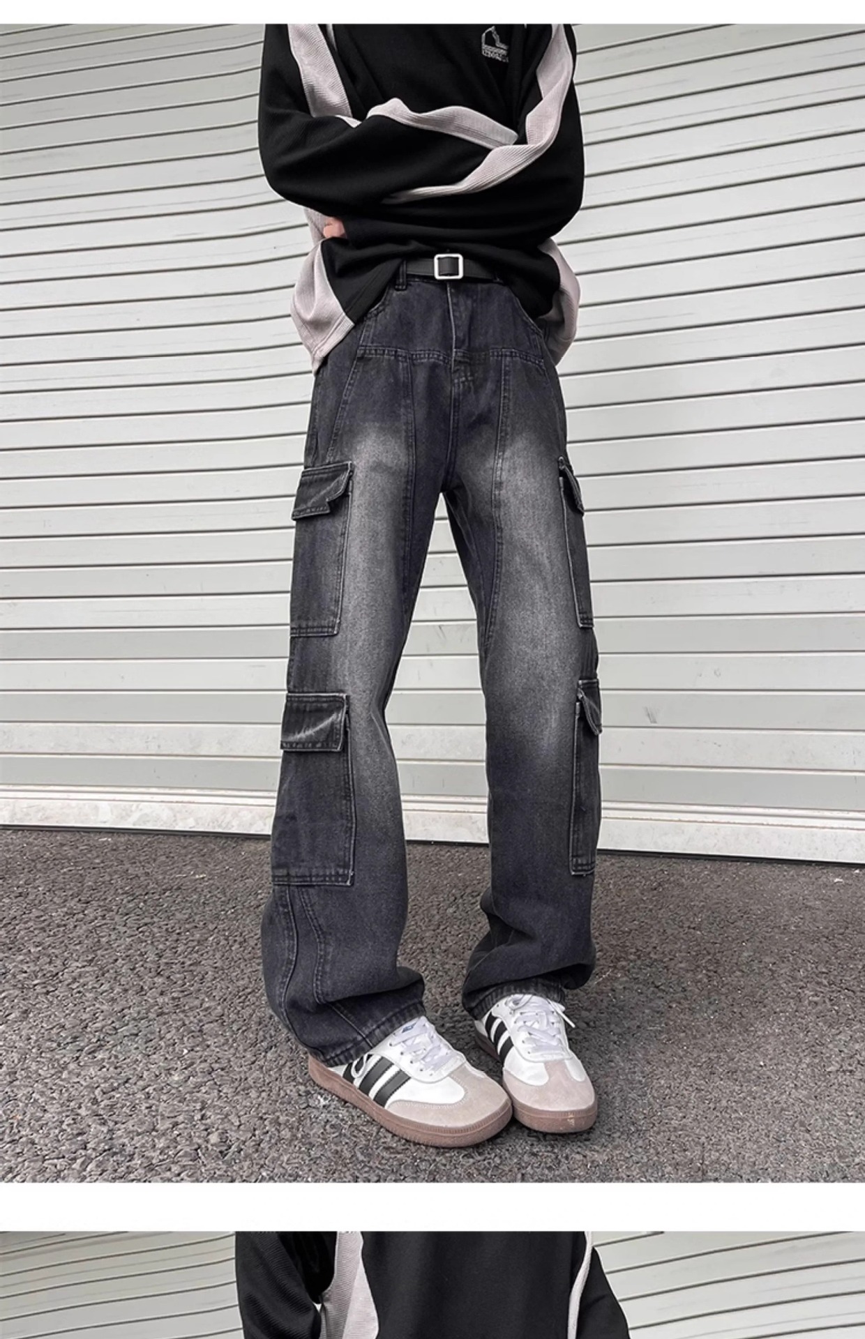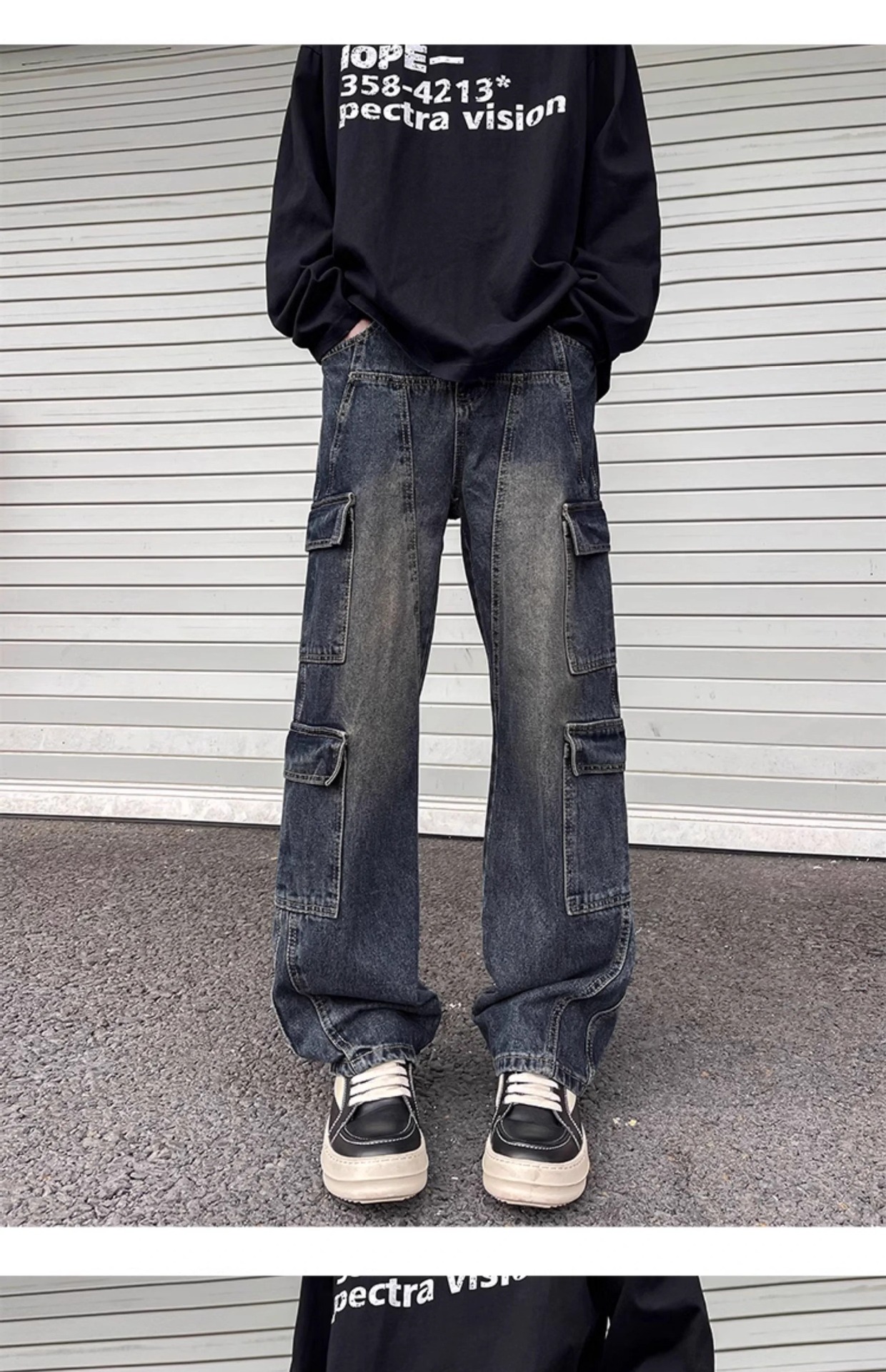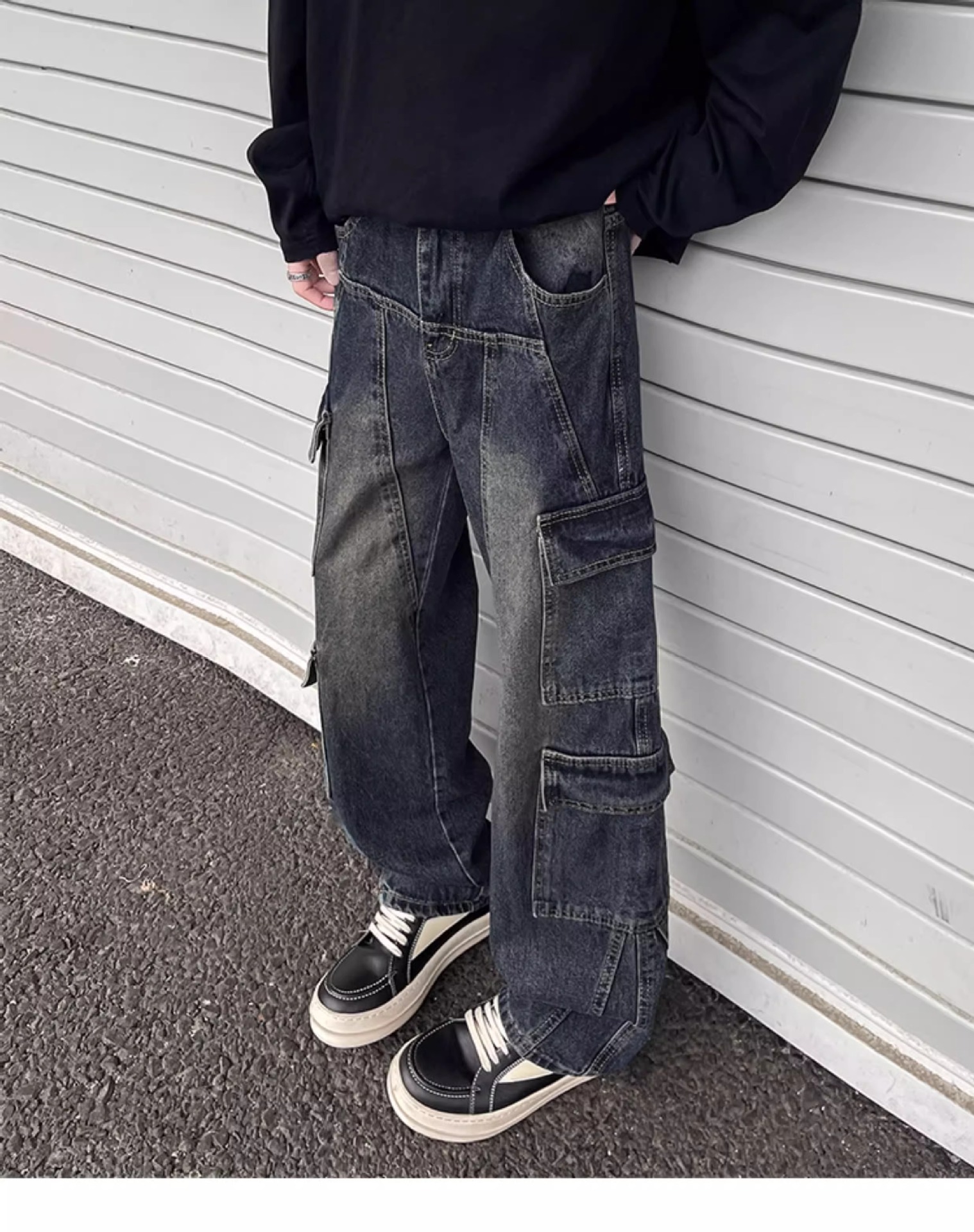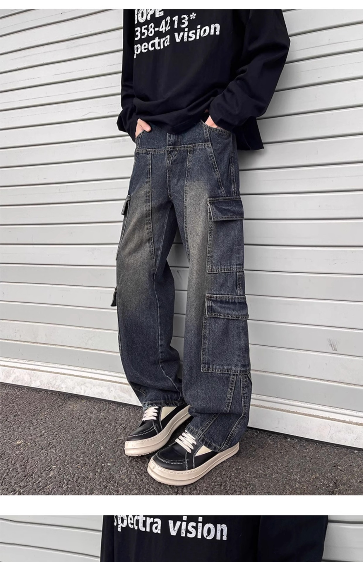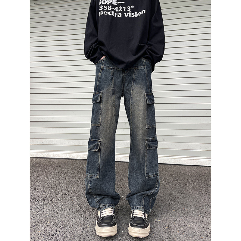 툴링 청바지 남성 봄과 가을 새로운 미국 스타일 하이 스트리트 워시 빈티지 더피 핸섬 멀티 포켓 느슨한 스트레이트 롱 바지스토어 가기