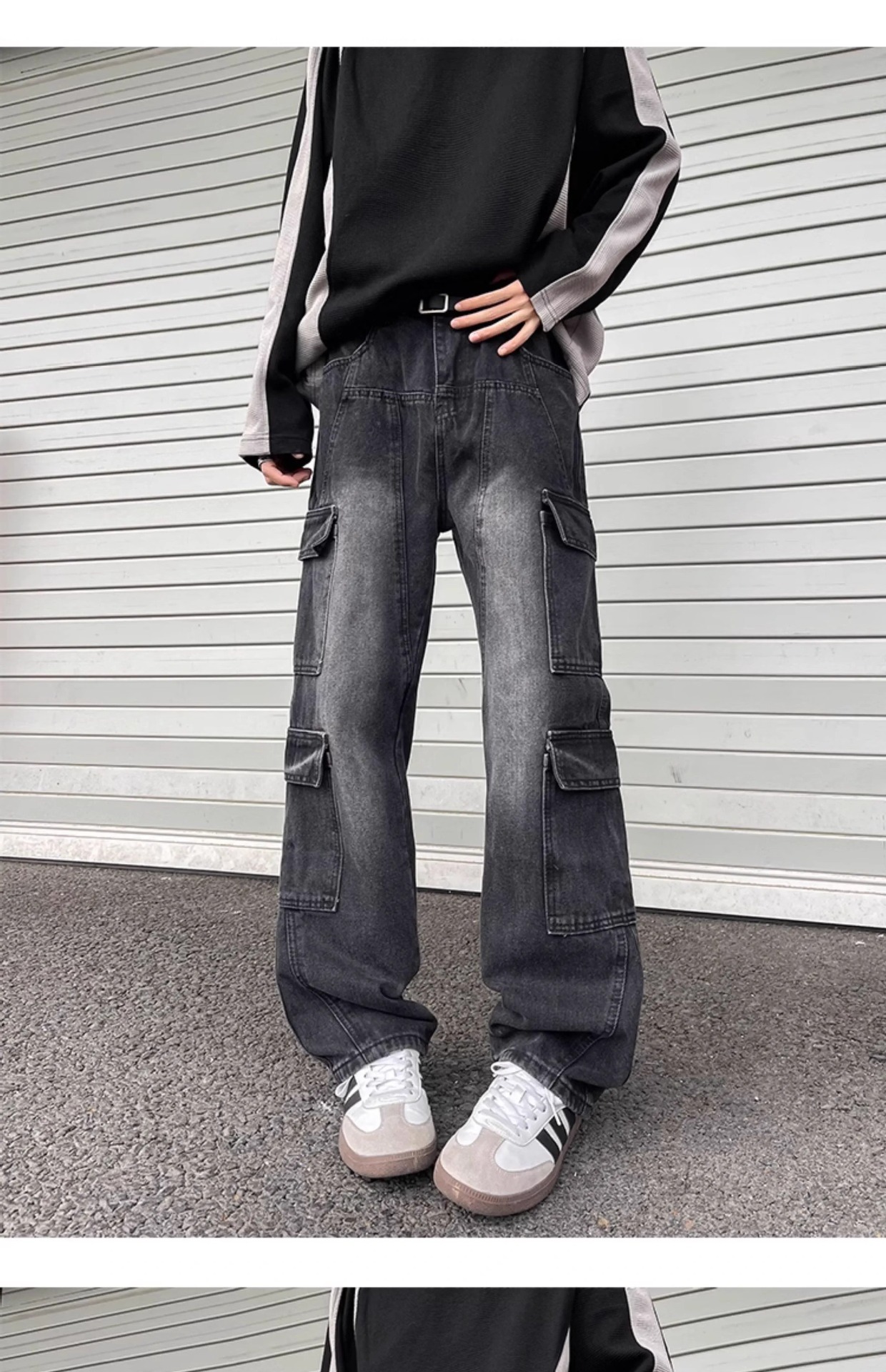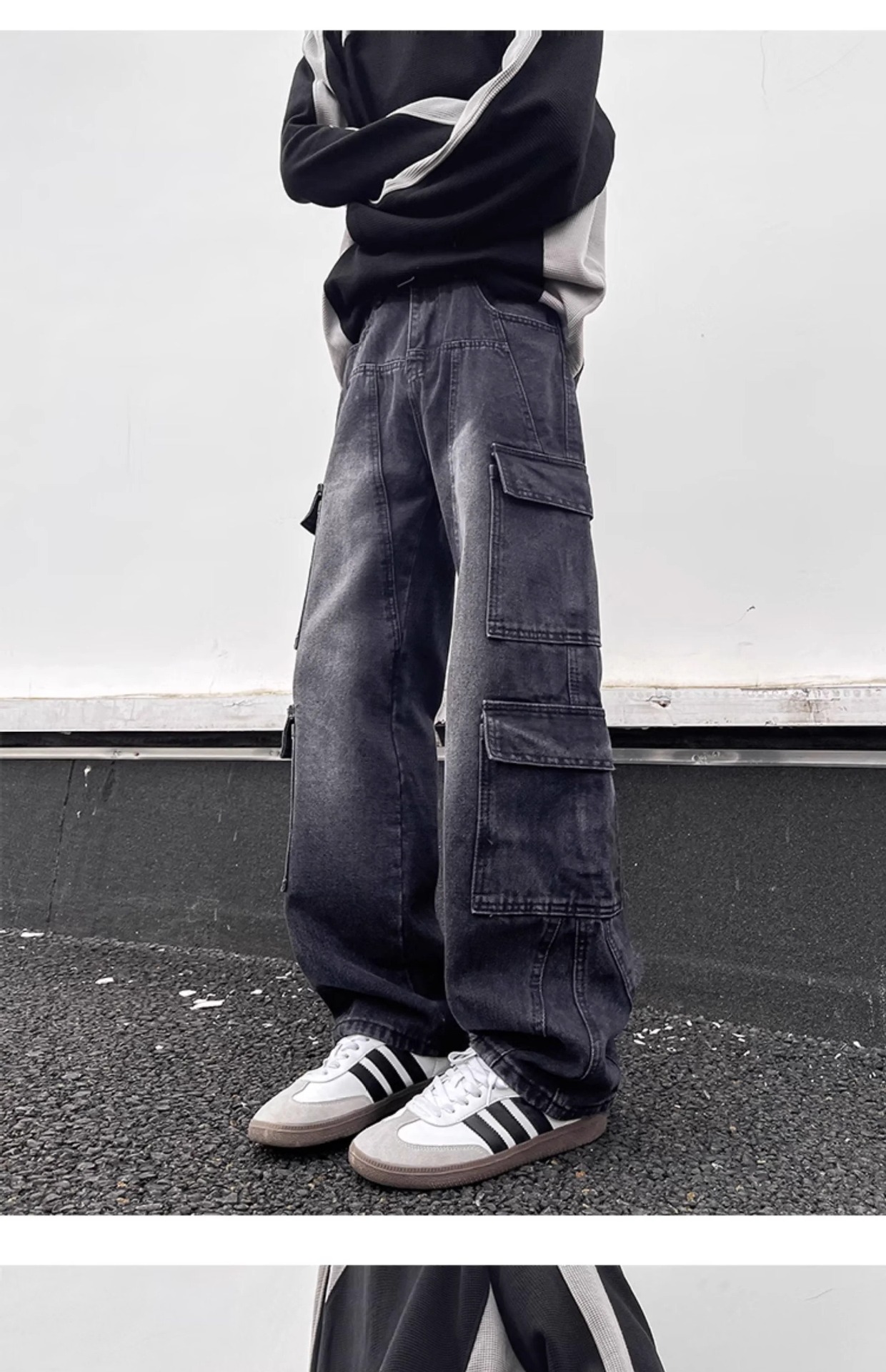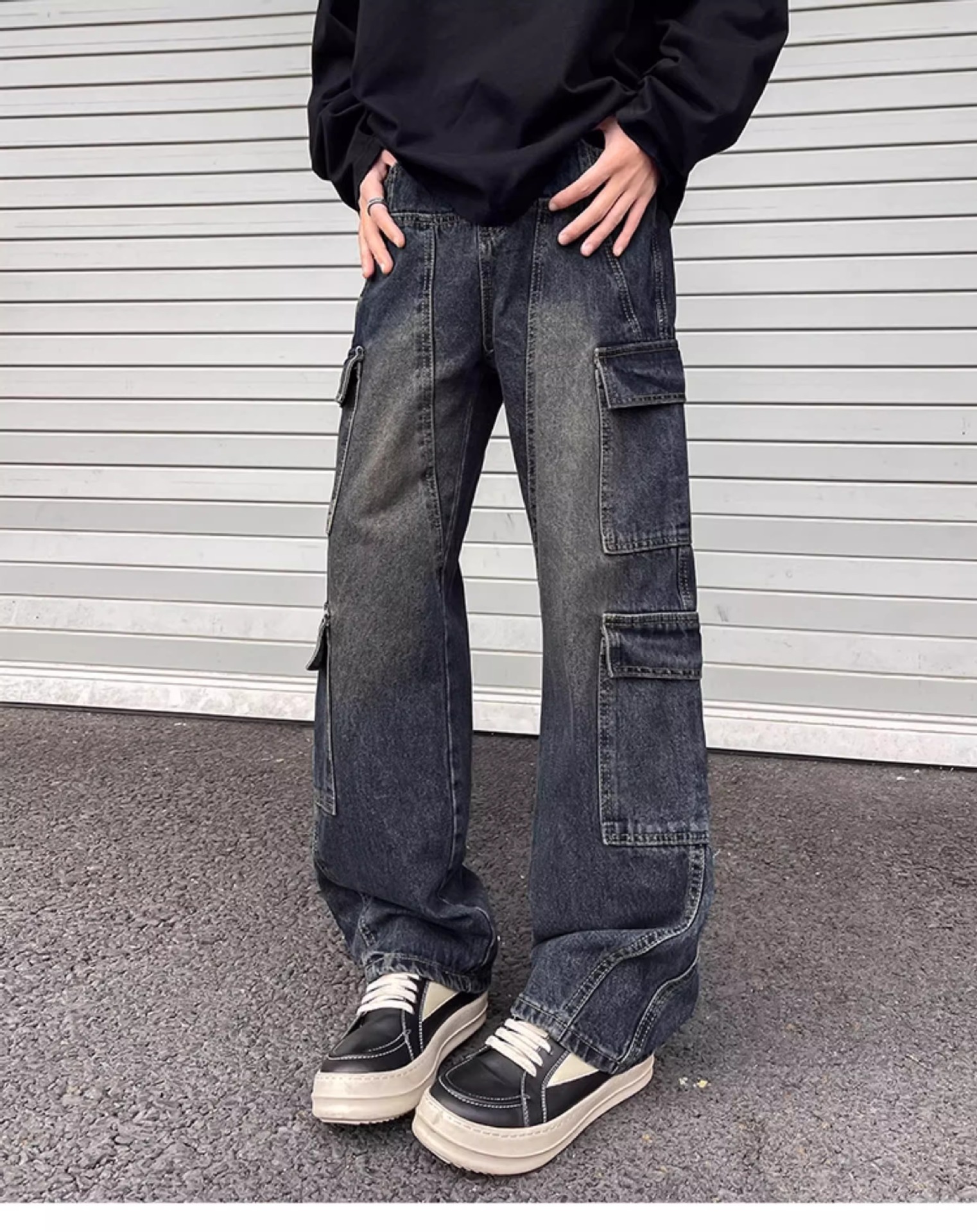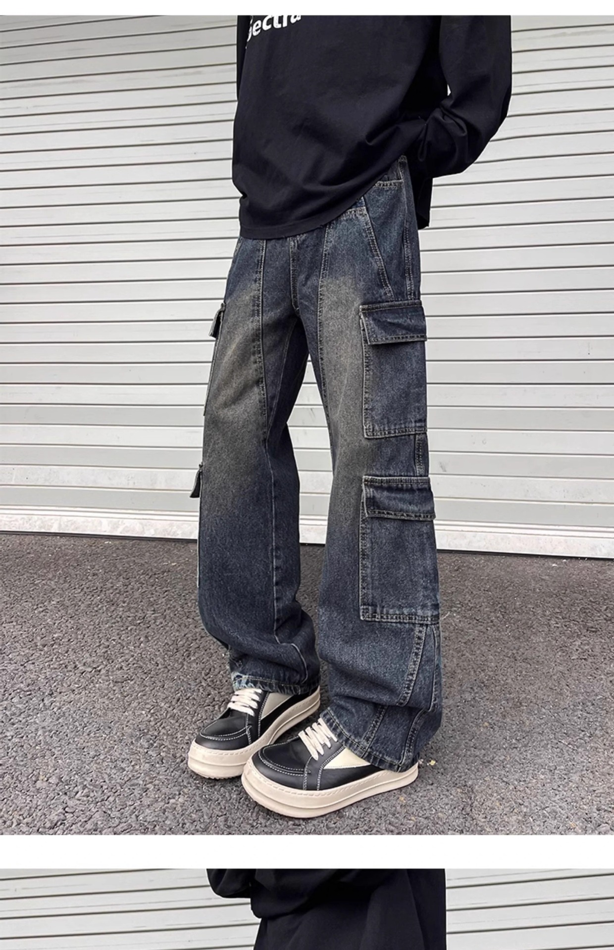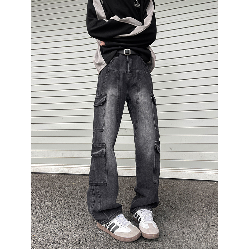 툴링 청바지 남성 봄과 가을 새로운 미국 스타일 하이 스트리트 워시 빈티지 더피 핸섬 멀티 포켓 느슨한 스트레이트 롱 바지스토어 가기