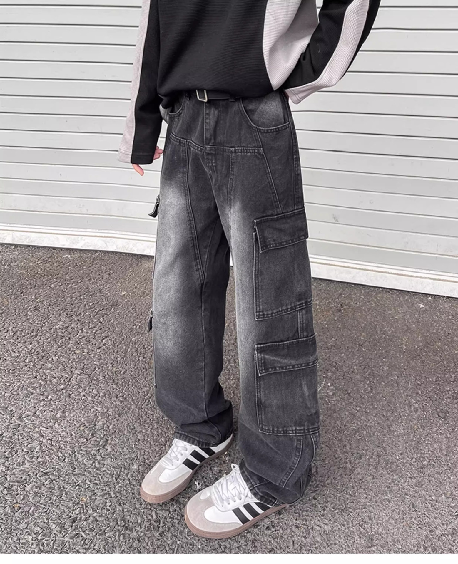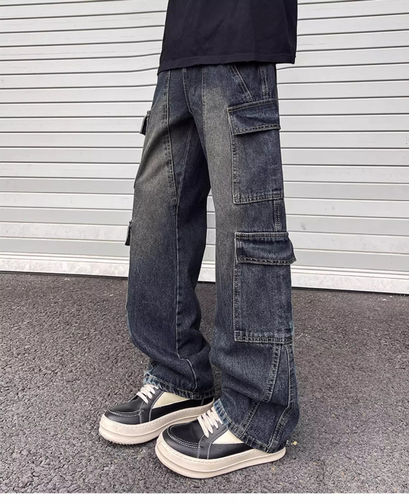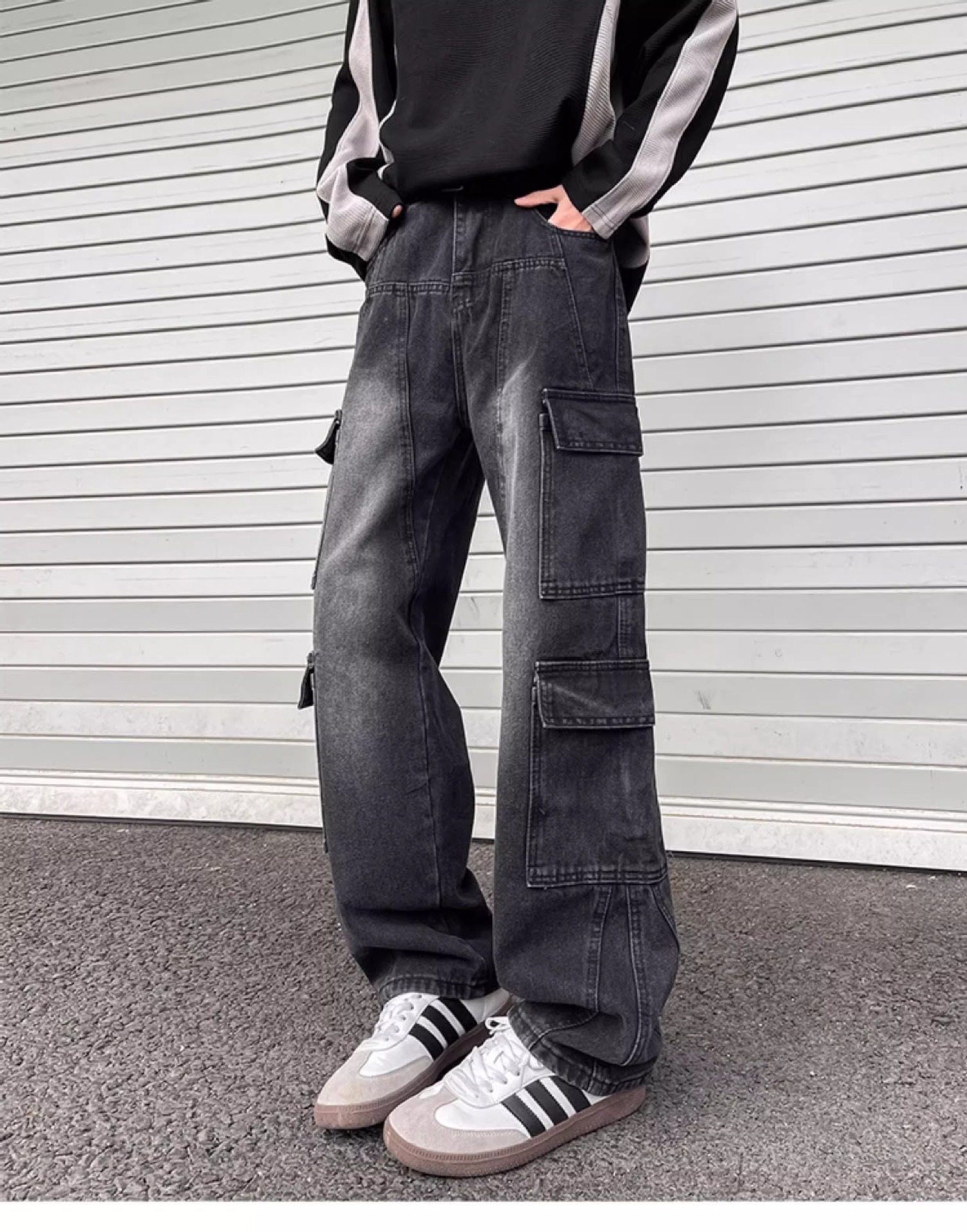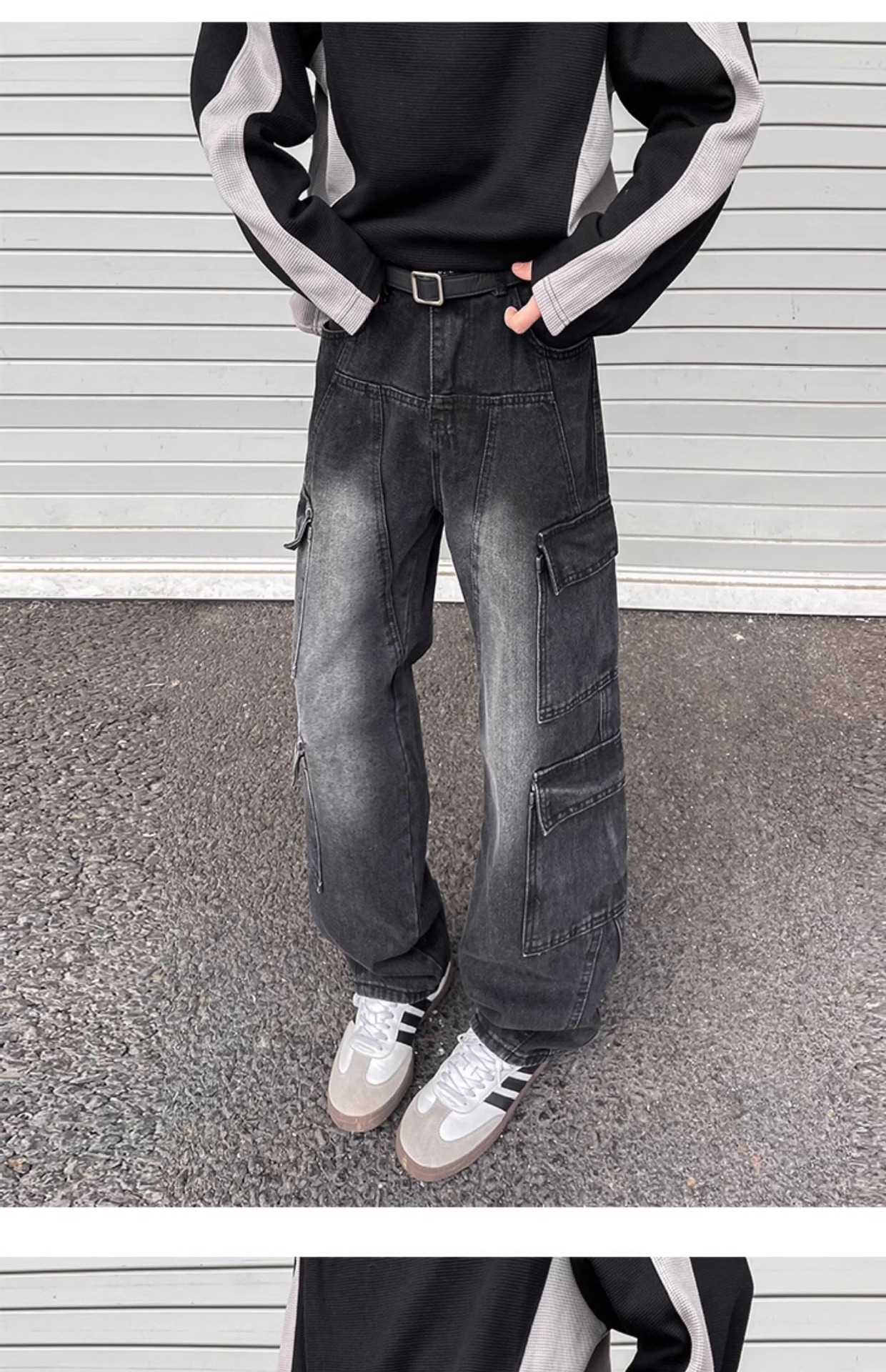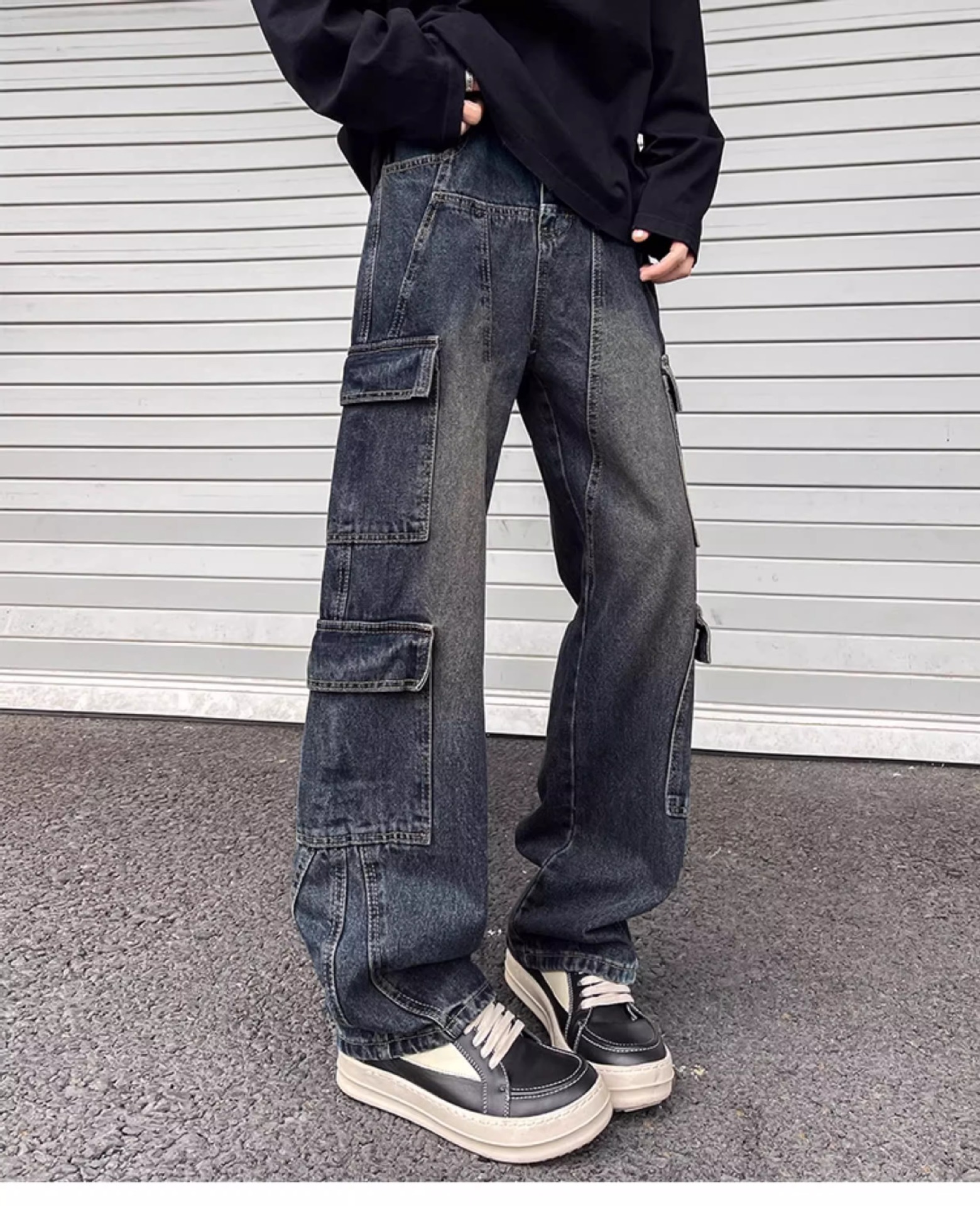 툴링 청바지 남성 봄과 가을 새로운 미국 스타일 하이 스트리트 워시 빈티지 더피 핸섬 멀티 포켓 느슨한 스트레이트 롱 바지스토어 가기