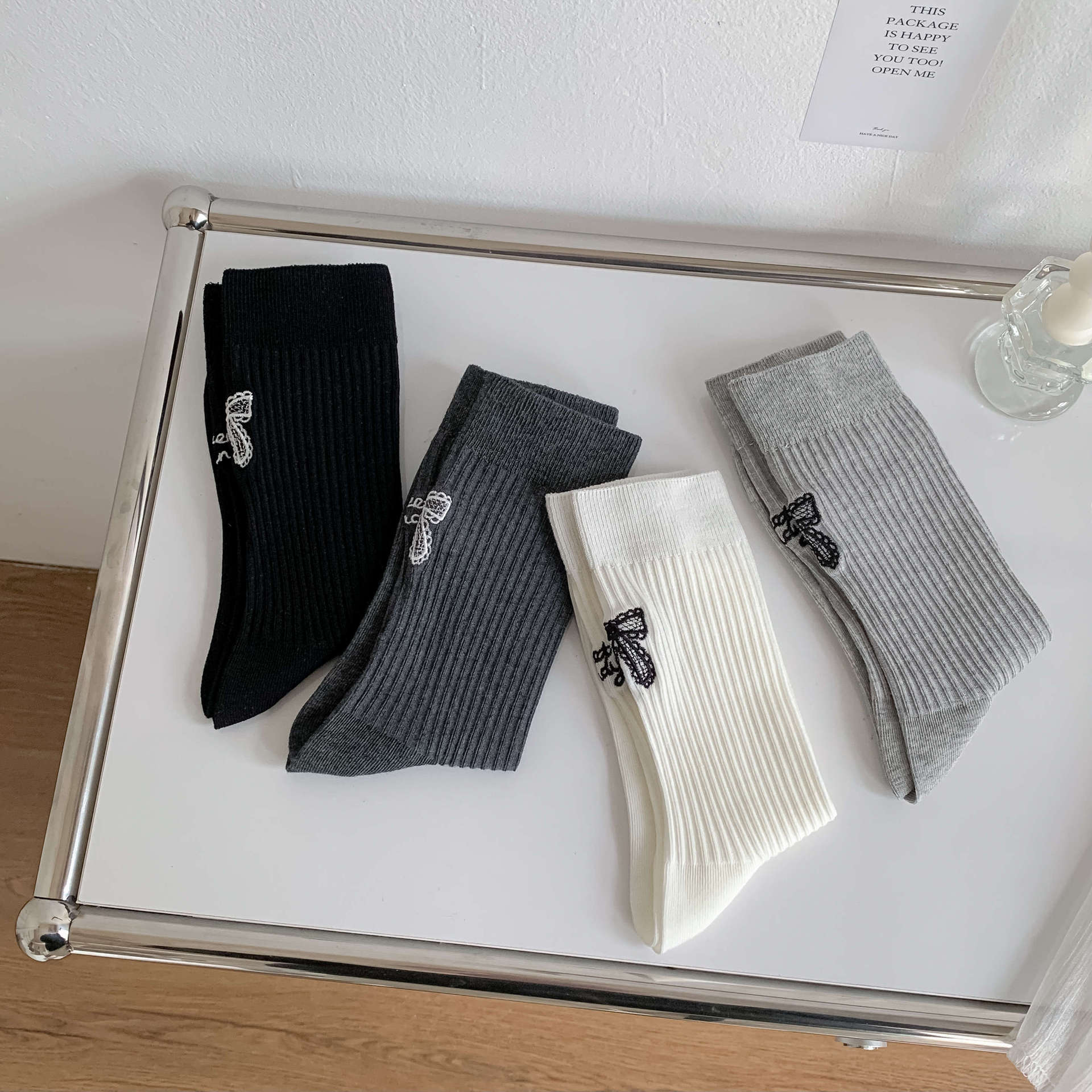 봄 · 여름 새 한국식 AB 좌우 발 수놓은 편지 활면 양말 여성 중견스토어 가기