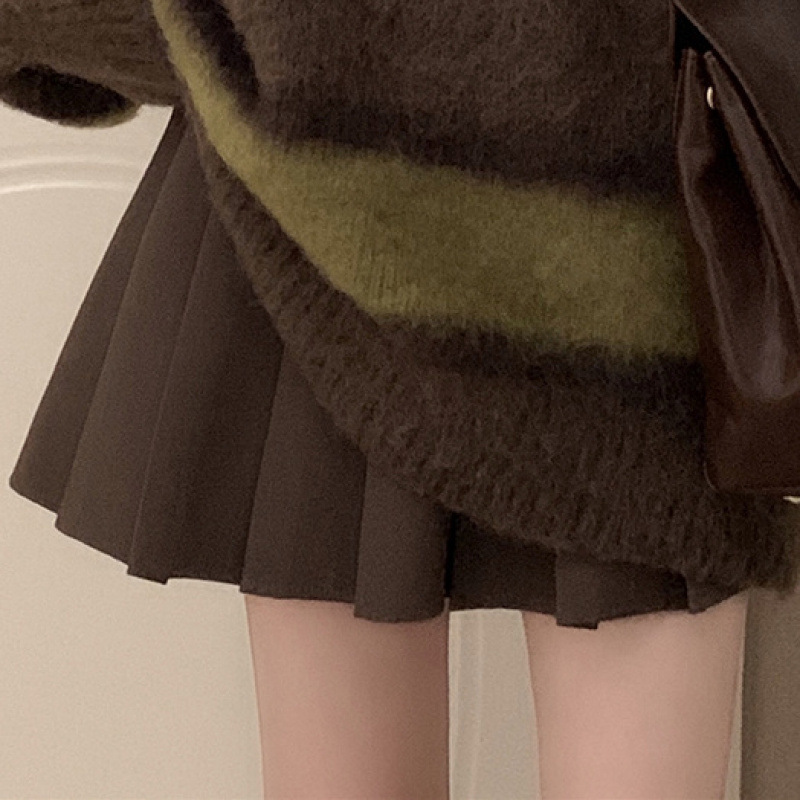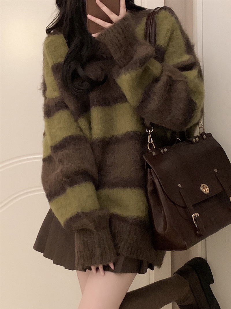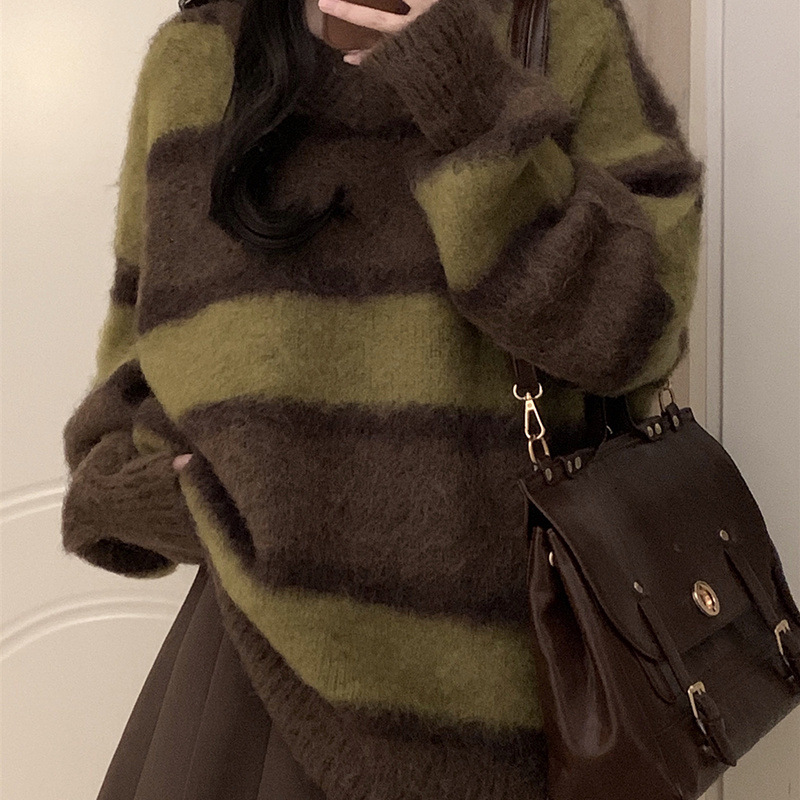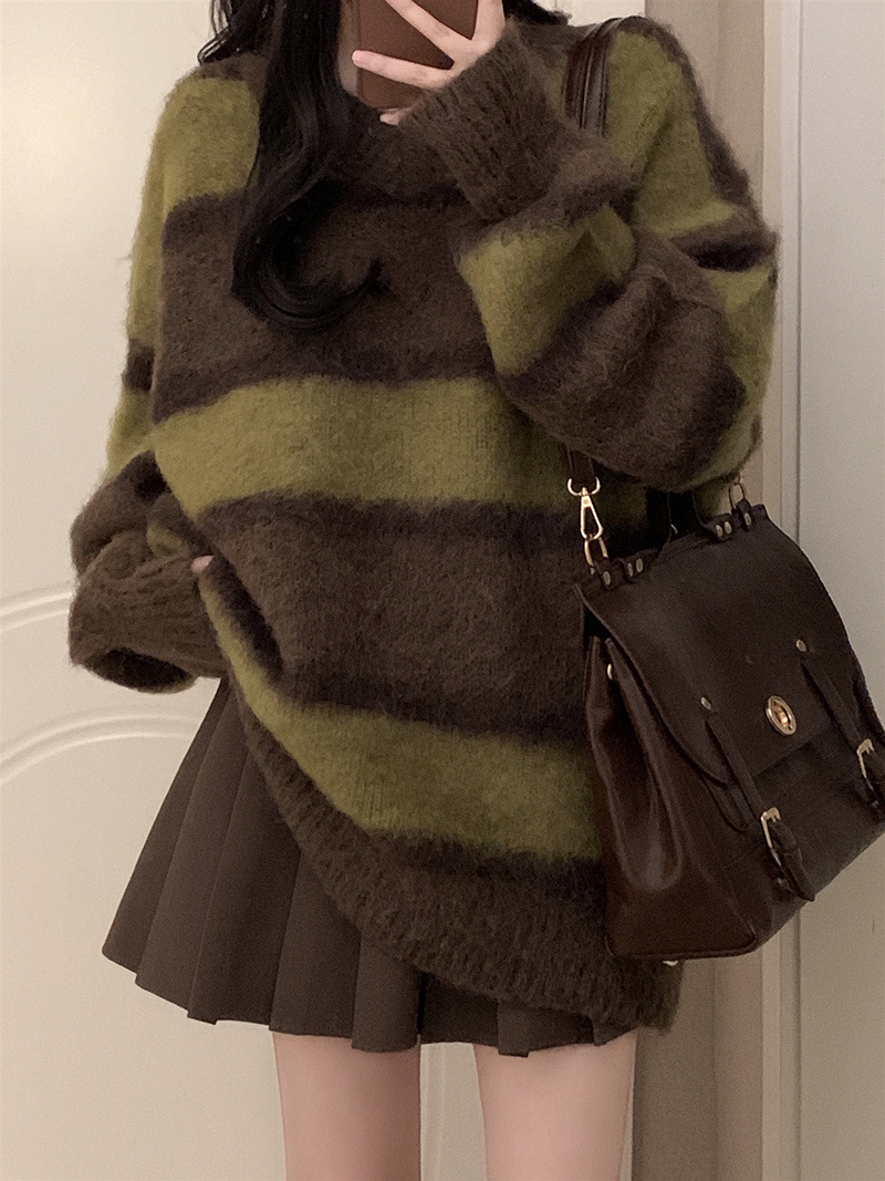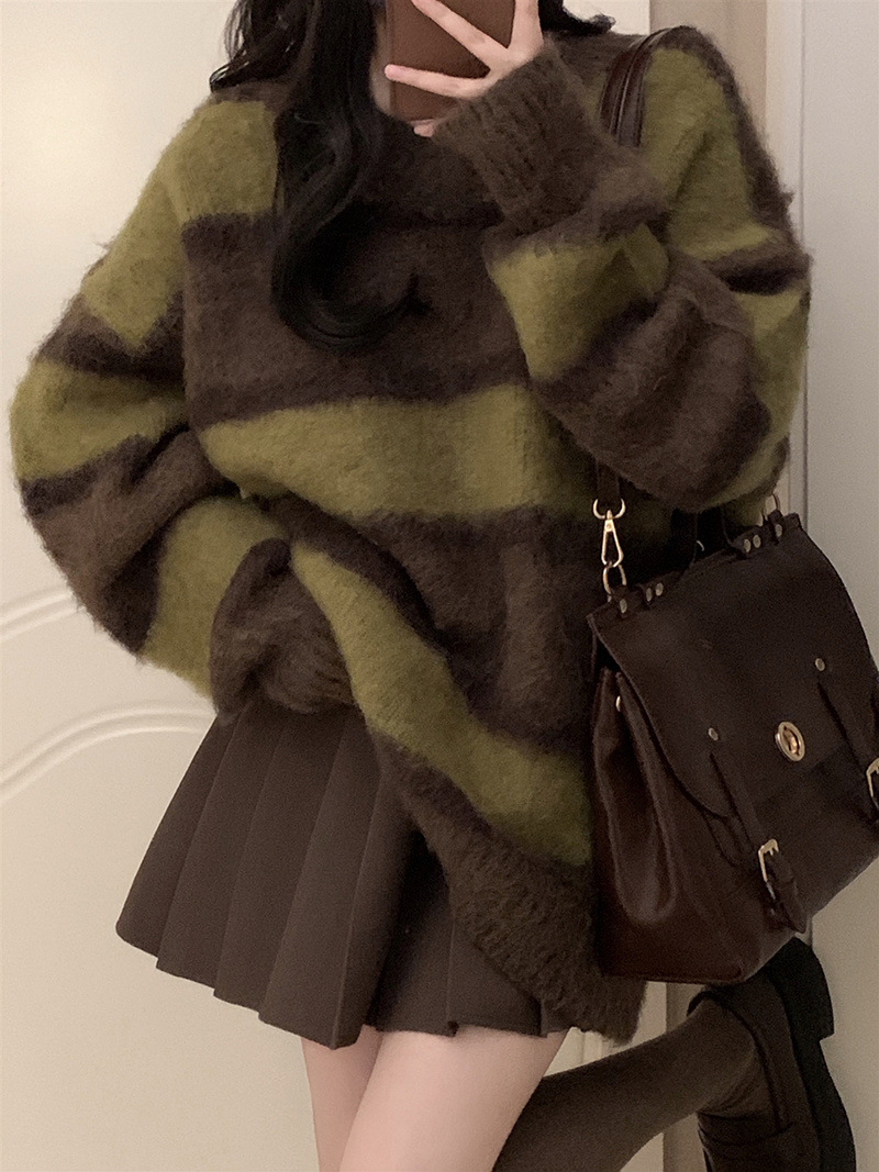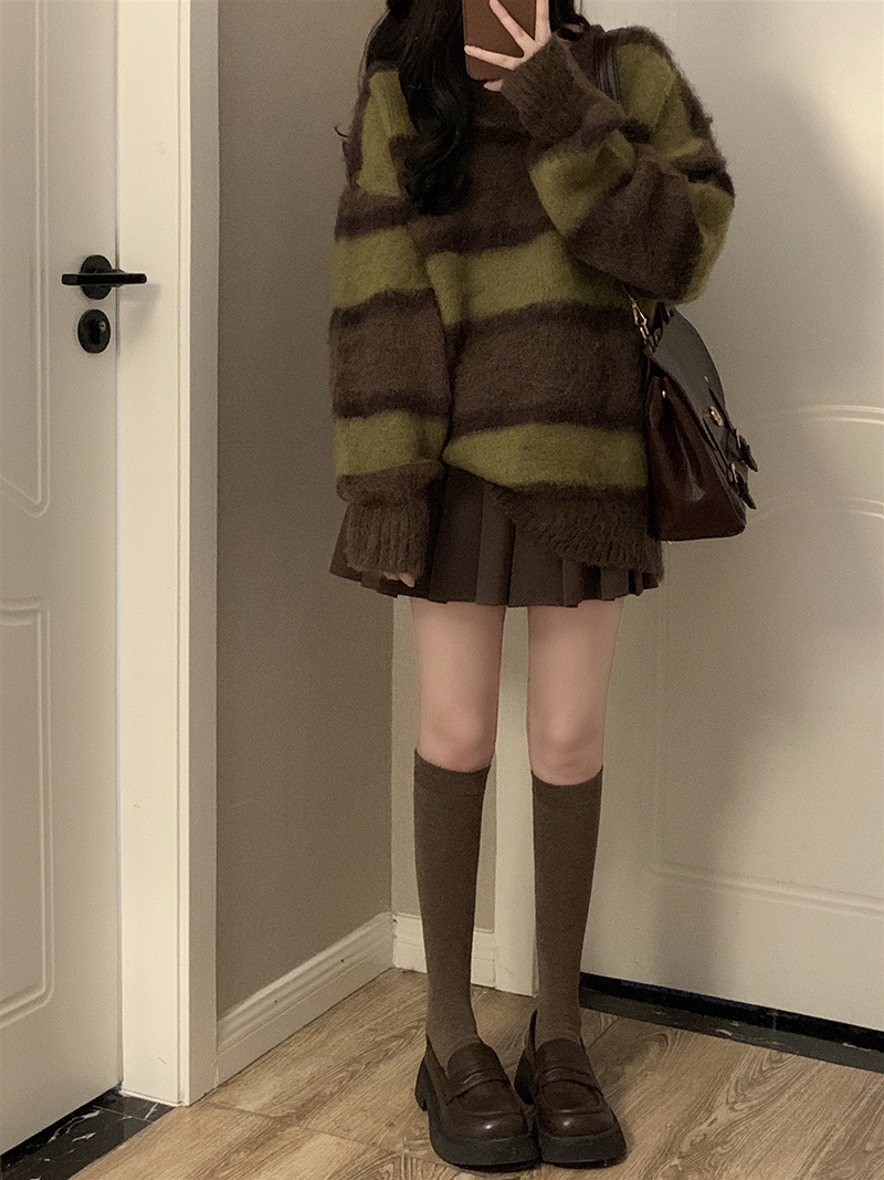 가을 겨울 작은 여성용 스트라이프 대비 부드러운 밀랍 스웨터 주름 스커트 게으른 스타일 여성용 투피스 슈트스토어 가기