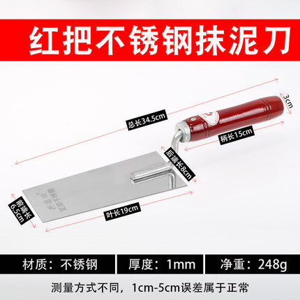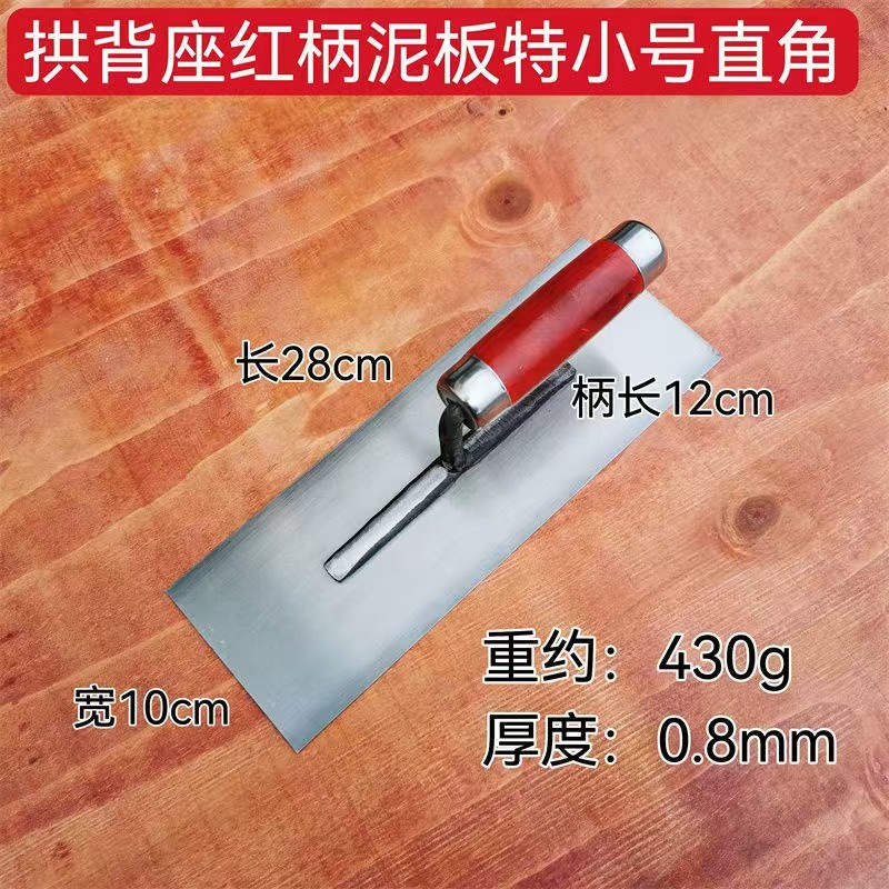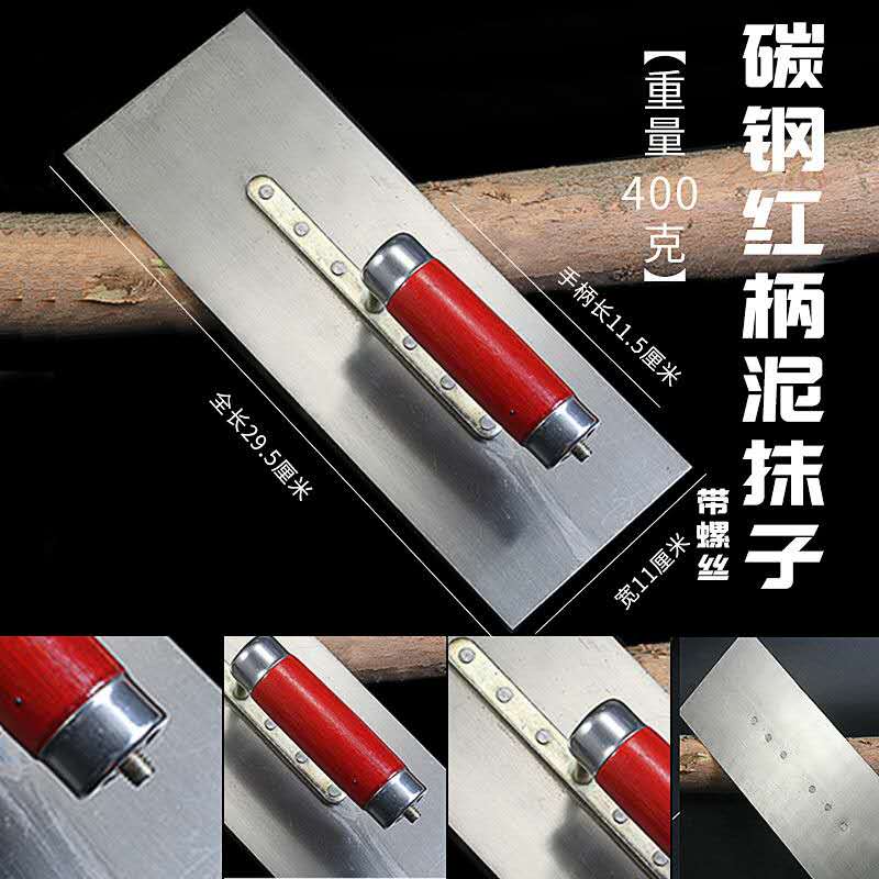 • 빨간색 손잡이, 한쪽 끝이 뾰족한 탄소강 벽돌 진흙 흙손, 바닥에 리벳 포함