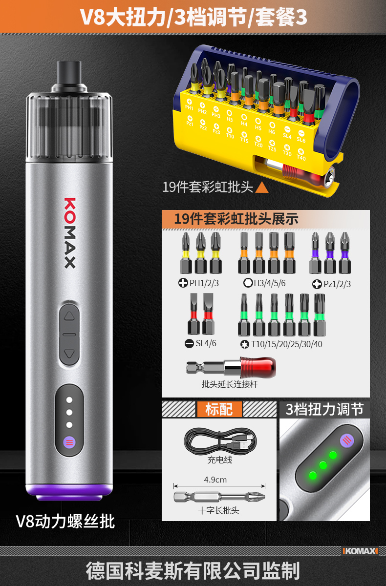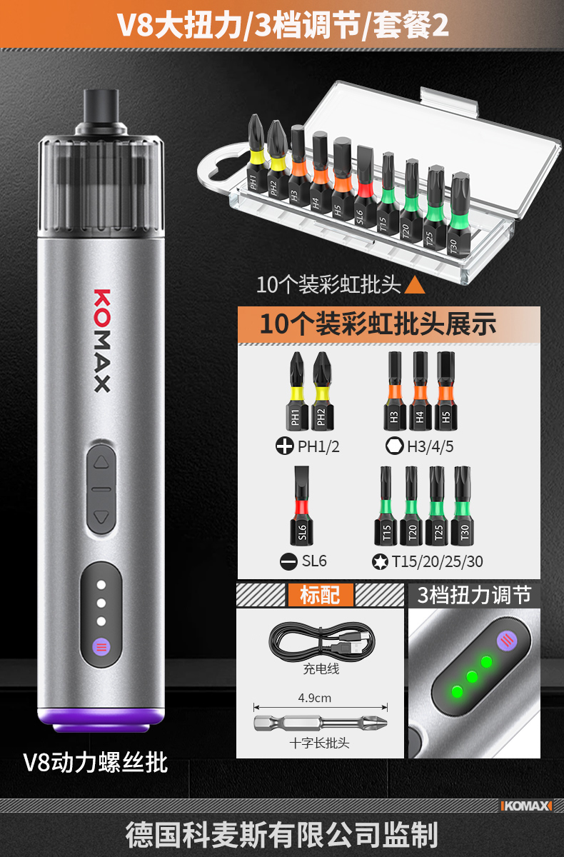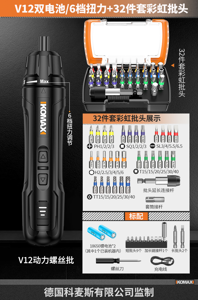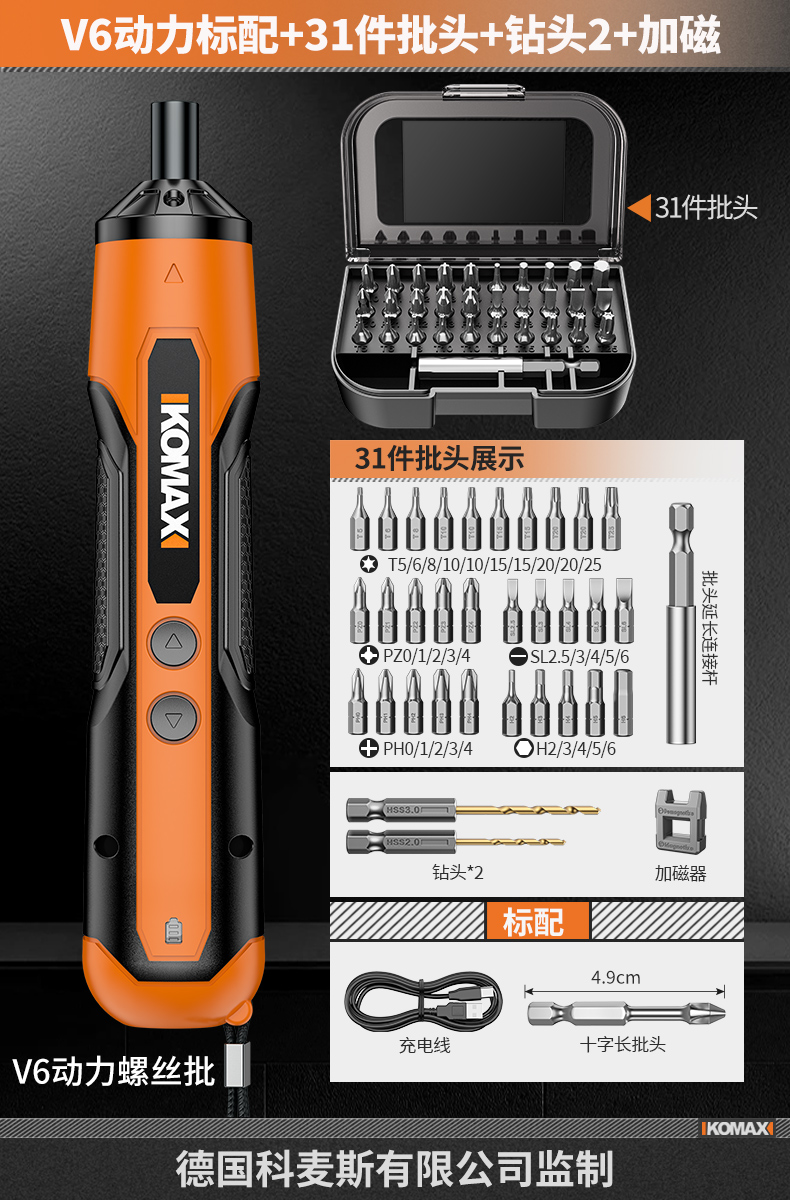 • V6 전원 표준 구성 + 비트 31개 + 드릴 비트 2개 + 자화 + 슬리브 9 + 유연한 샤프트 + 확장 비트 2