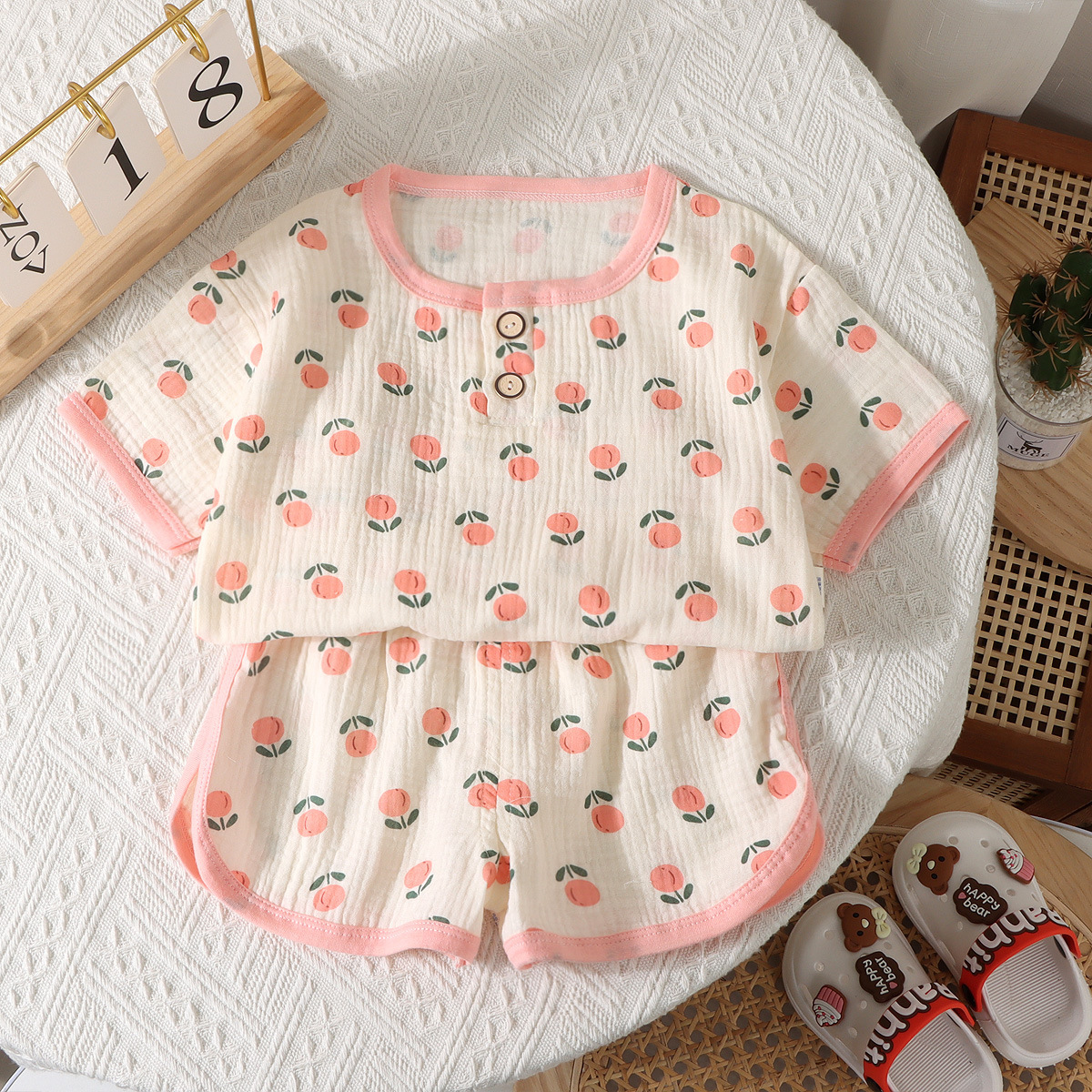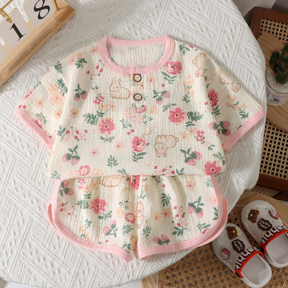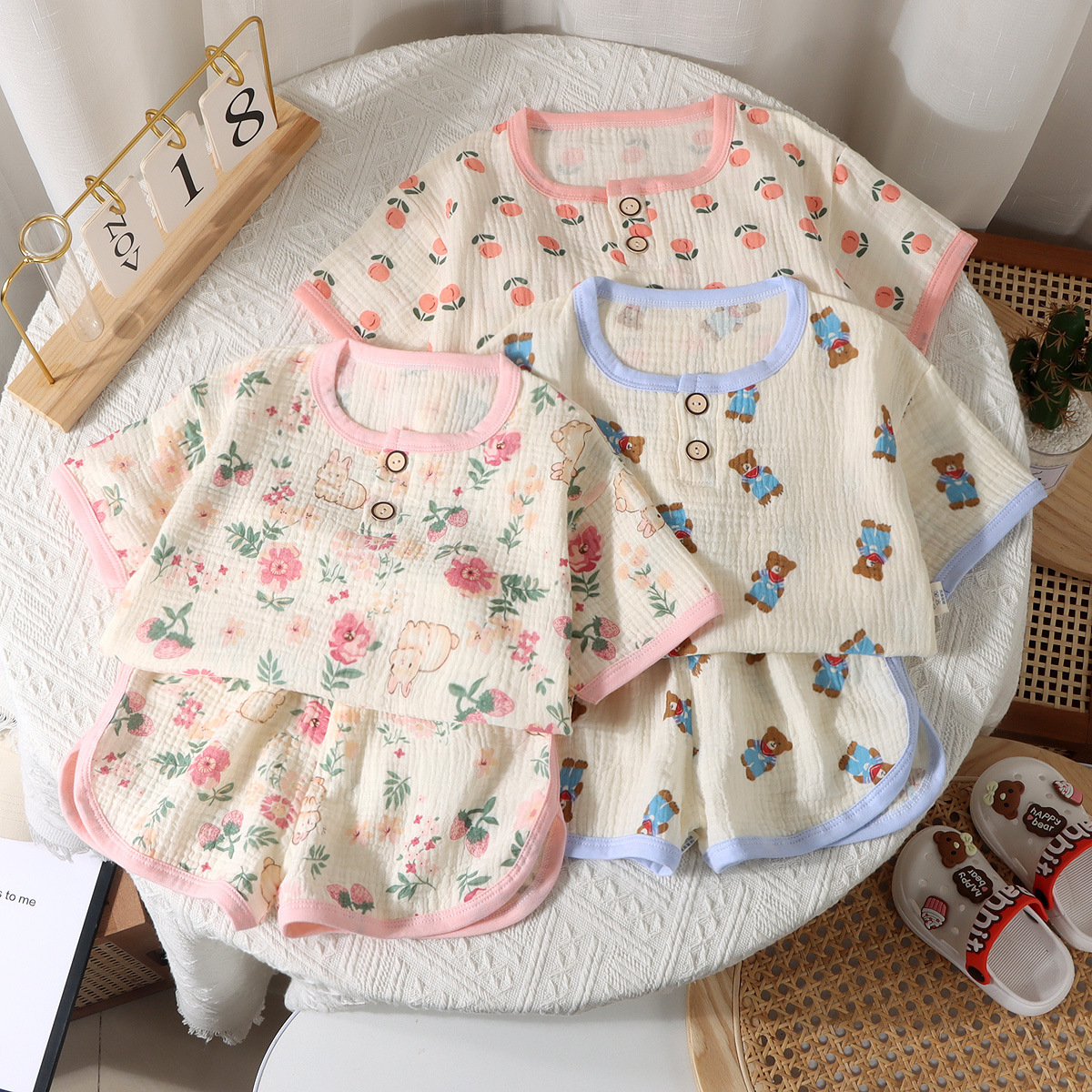 소년 소녀를위한 새로운 어린이 더블 레이어 거즈 반바지 반팔 파자마 여름 얇은 면 홈 의류 세트