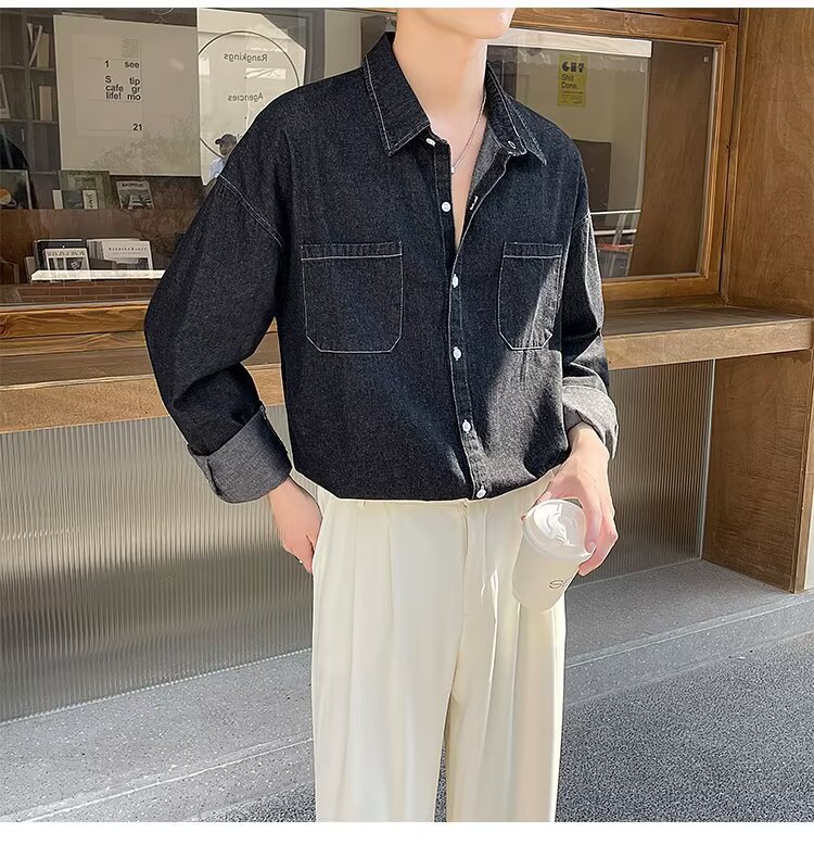 일본식 레트로 데님 셔츠 남자의 봄과 가을 트렌디 브랜드 Ins 느슨한 긴팔 셔츠 홍콩 스타일 잘 생긴 캐주얼 코트 T스토어 가기