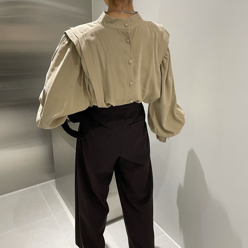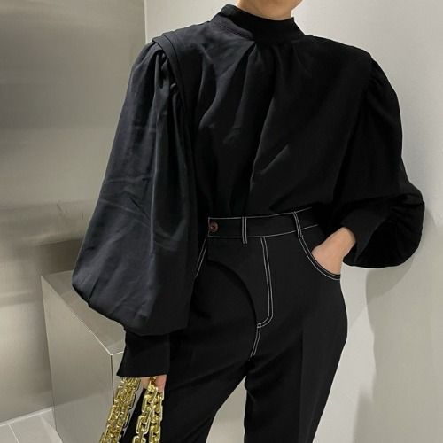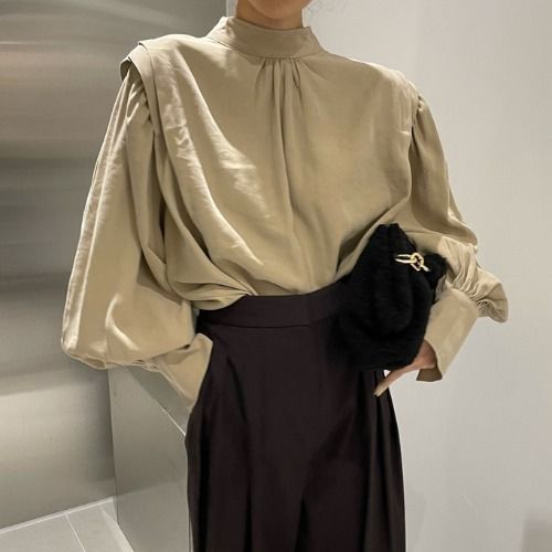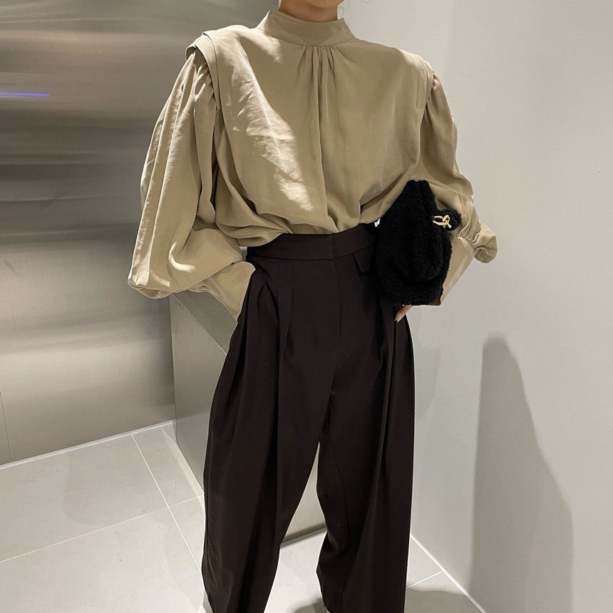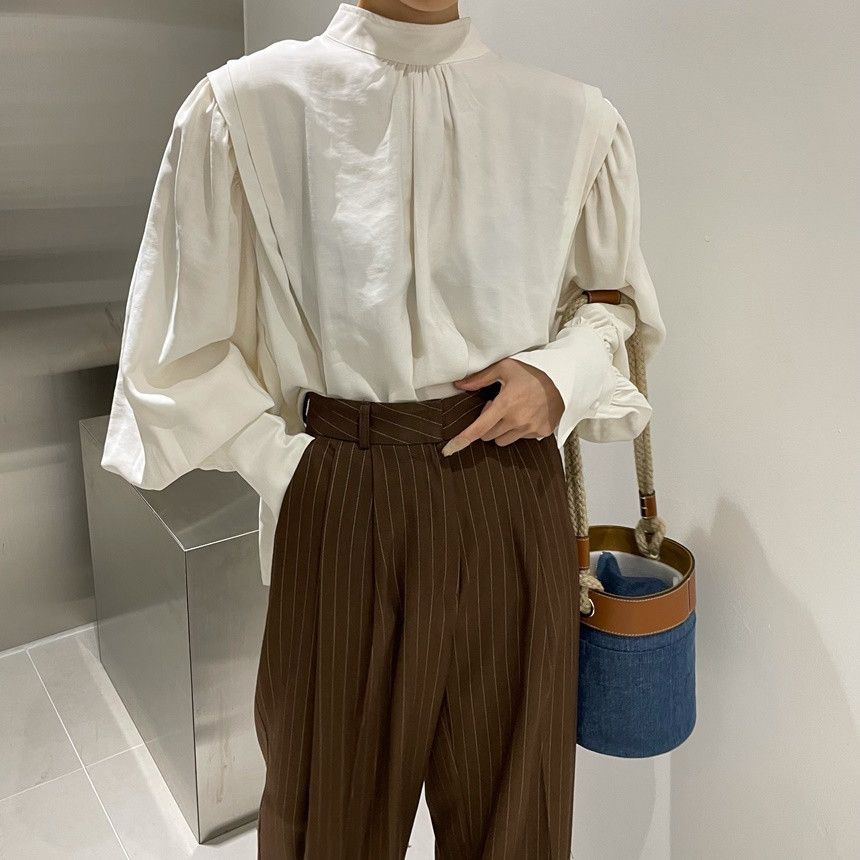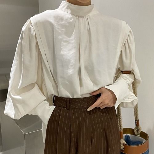 봄 한국 프렌치 하프 하이 칼라 백 버튼 디자인 틈새 패션 랜턴 슬리브 셔츠 최고 여성스토어 가기