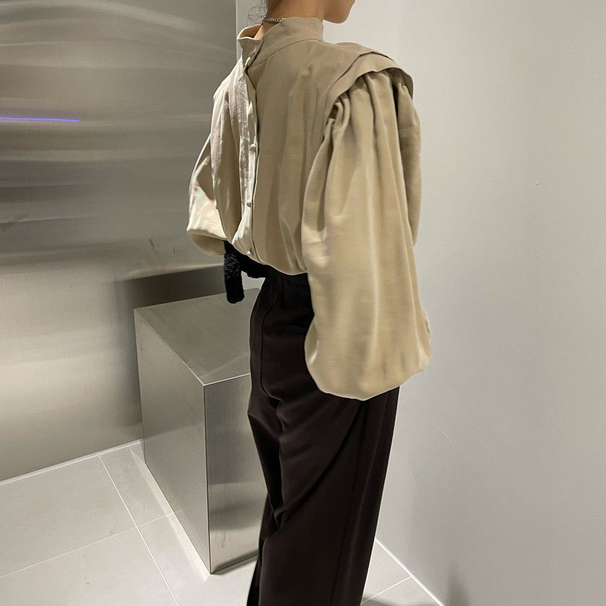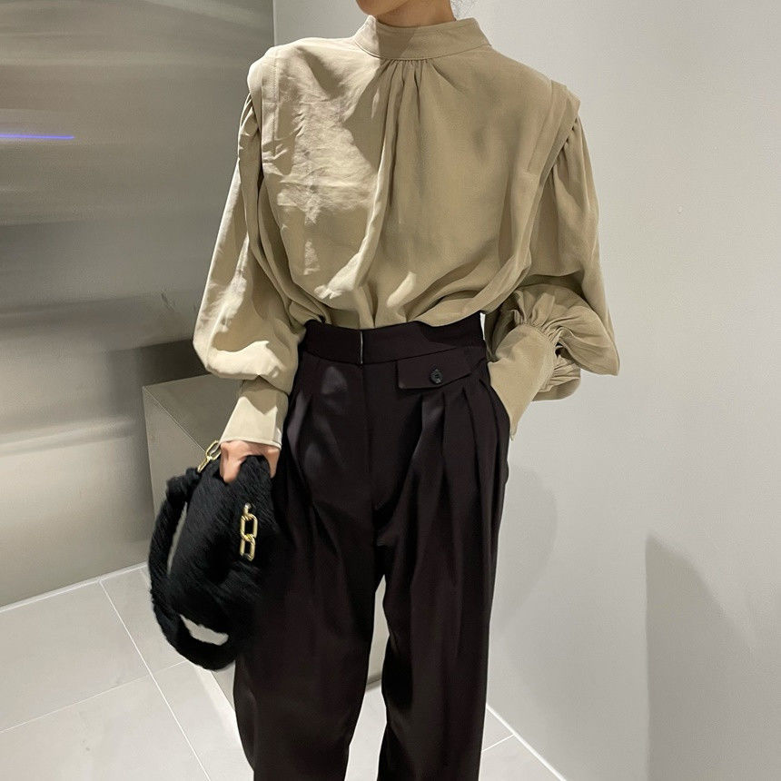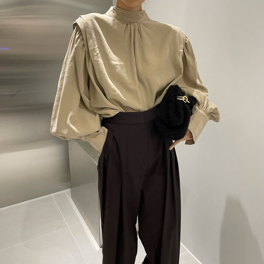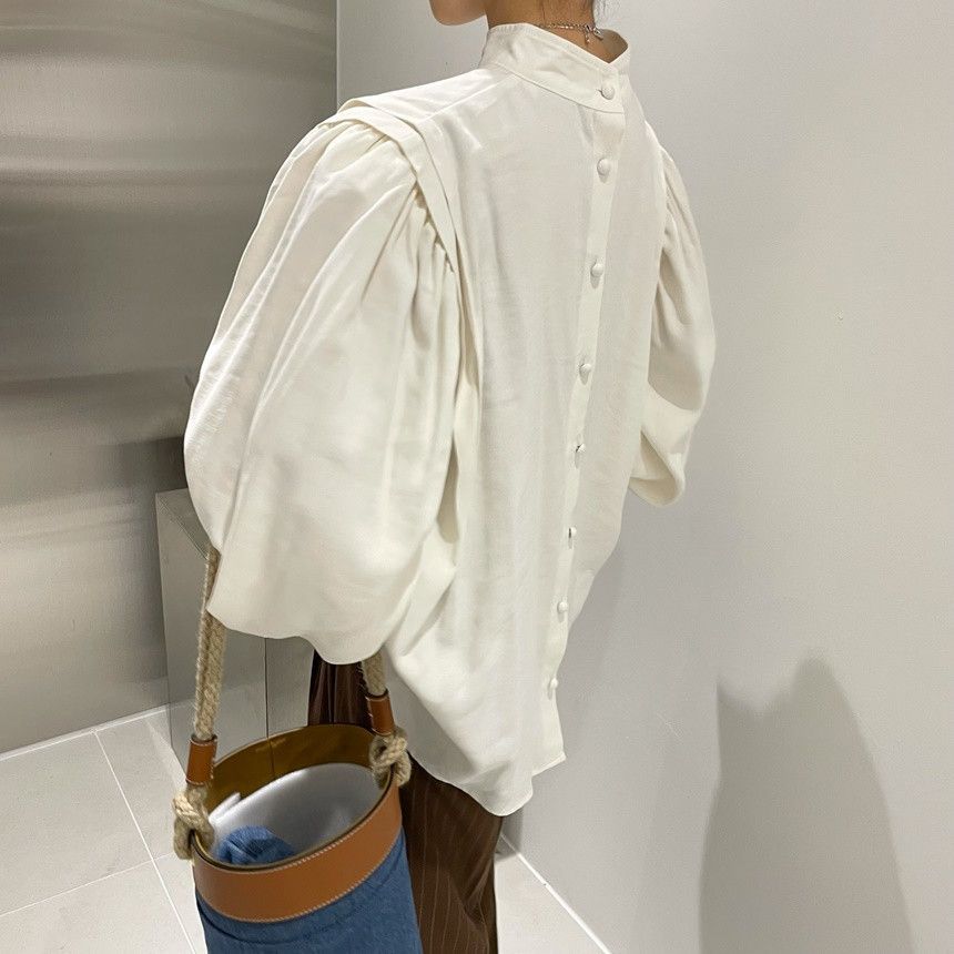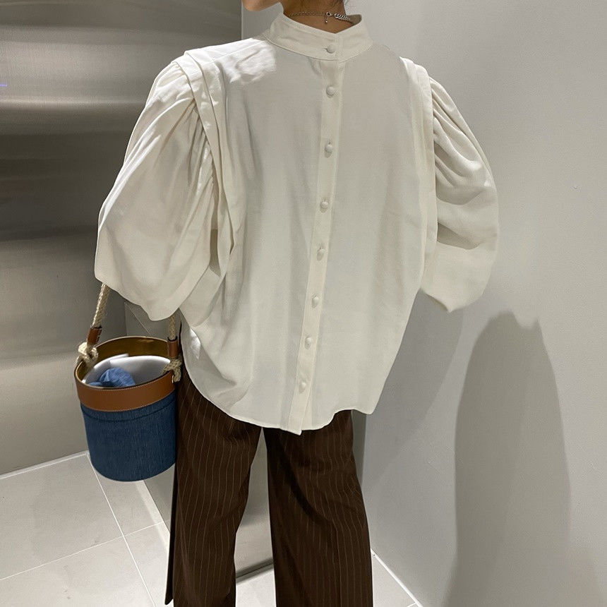 봄 한국 프렌치 하프 하이 칼라 백 버튼 디자인 틈새 패션 랜턴 슬리브 셔츠 최고 여성