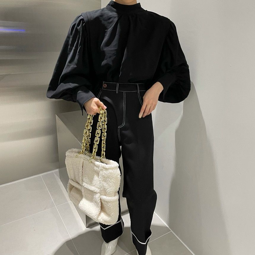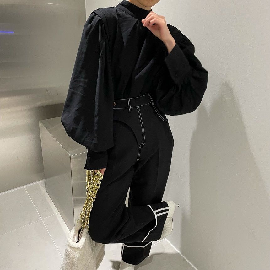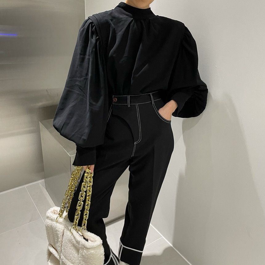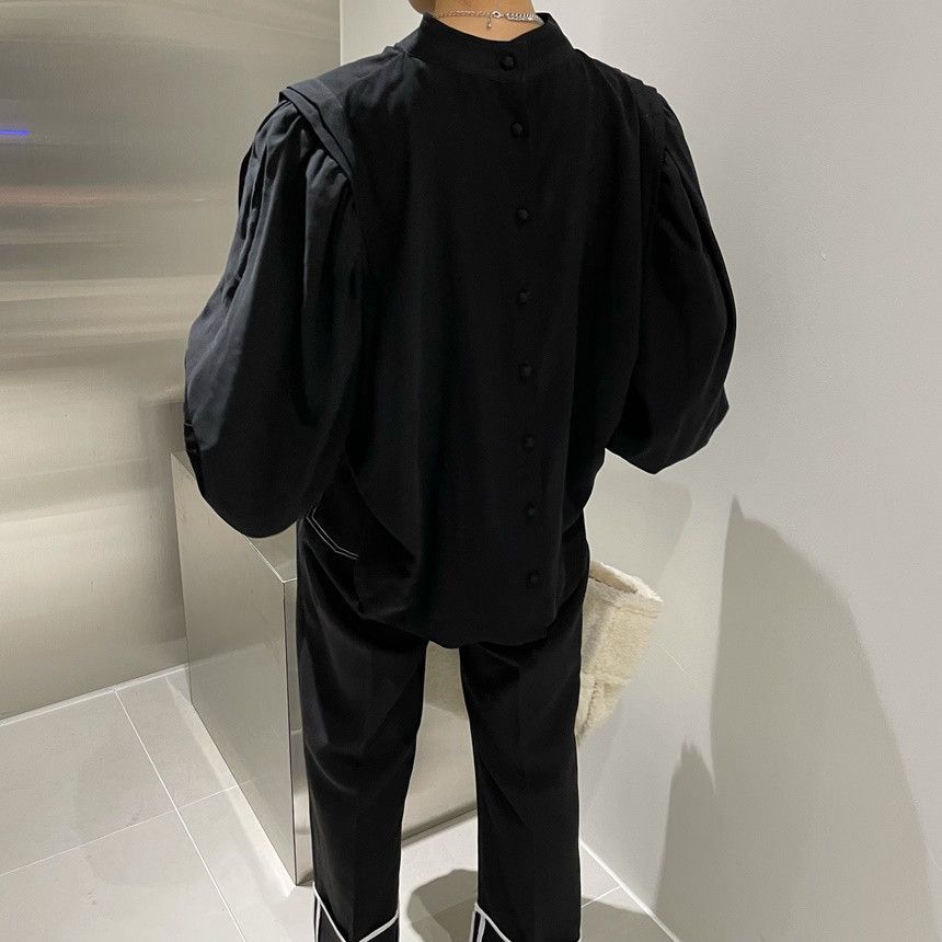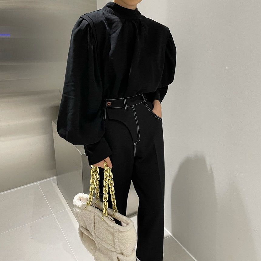 봄 한국 프렌치 하프 하이 칼라 백 버튼 디자인 틈새 패션 랜턴 슬리브 셔츠 최고 여성