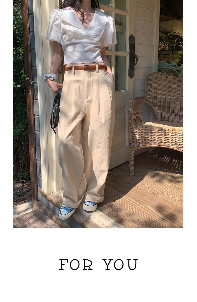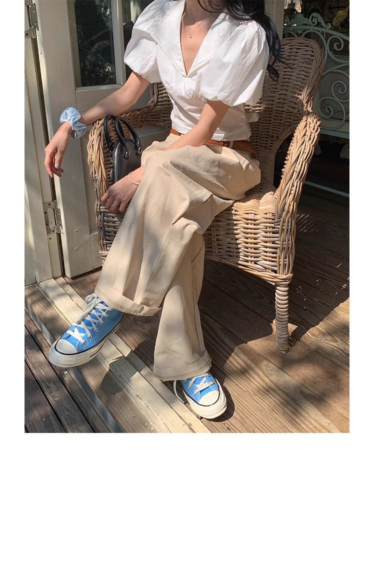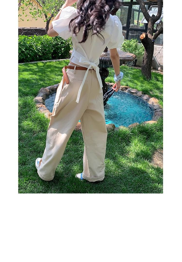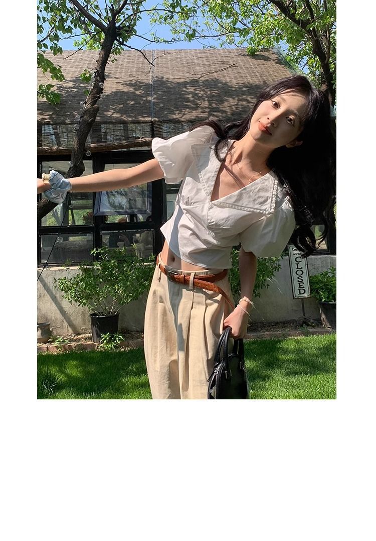 홈 메이드 프렌치 브넥 퍼프 슬리브 탑 쇼트 웨이스트 셔츠 여성용 백 스트랩 보우 셔츠