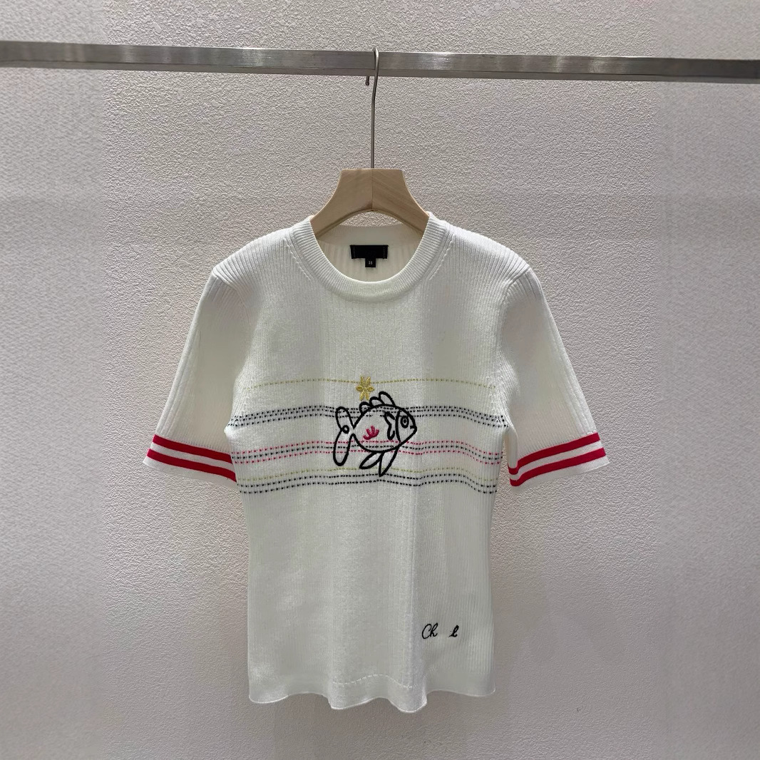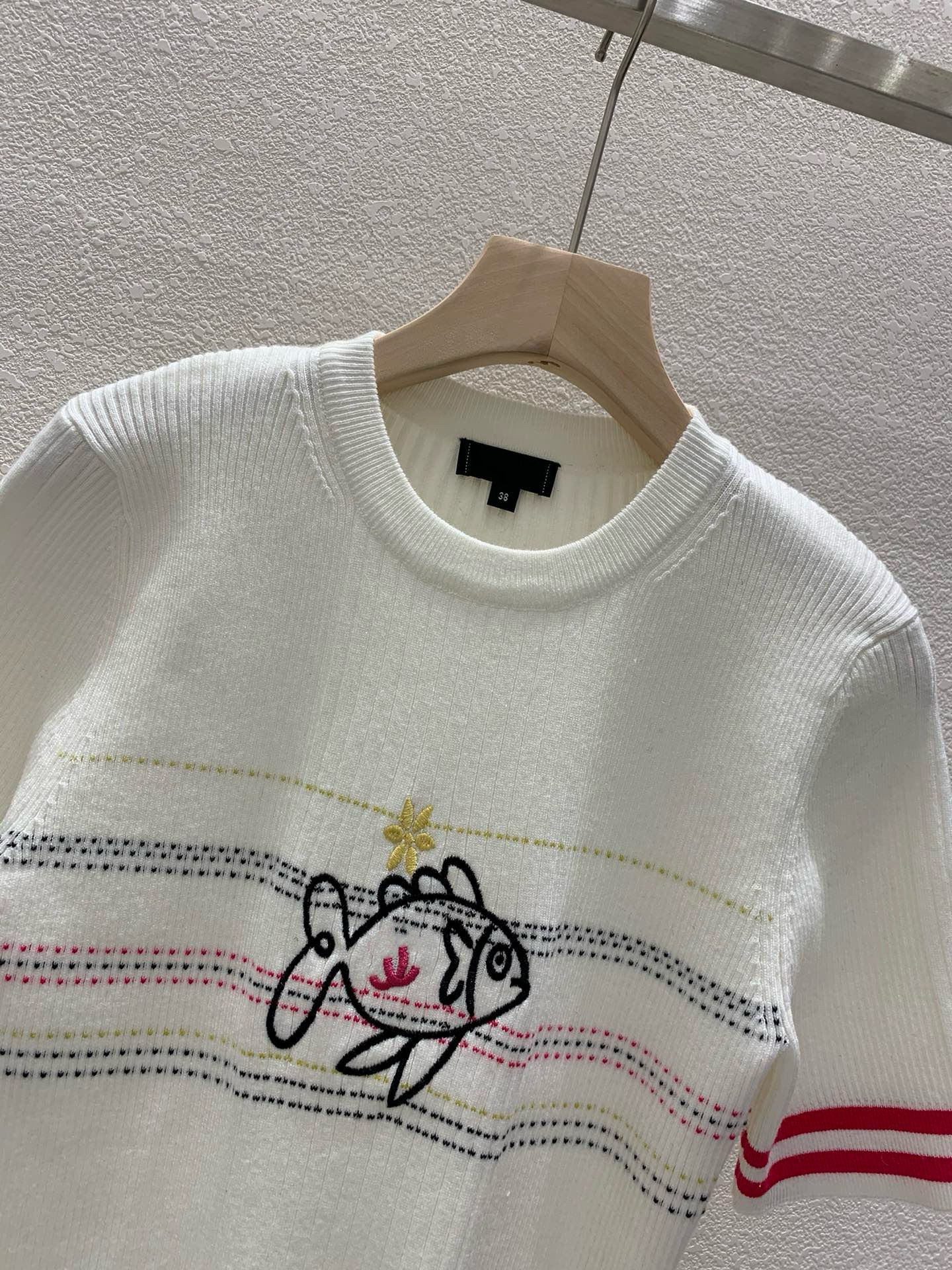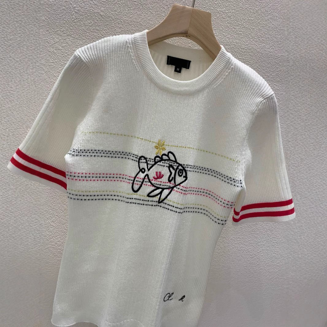 CH 홈 24 가을과 겨울 간단한 자수 작은 물고기 라인 대비 컬러 니트 짧은 소매 슬림
