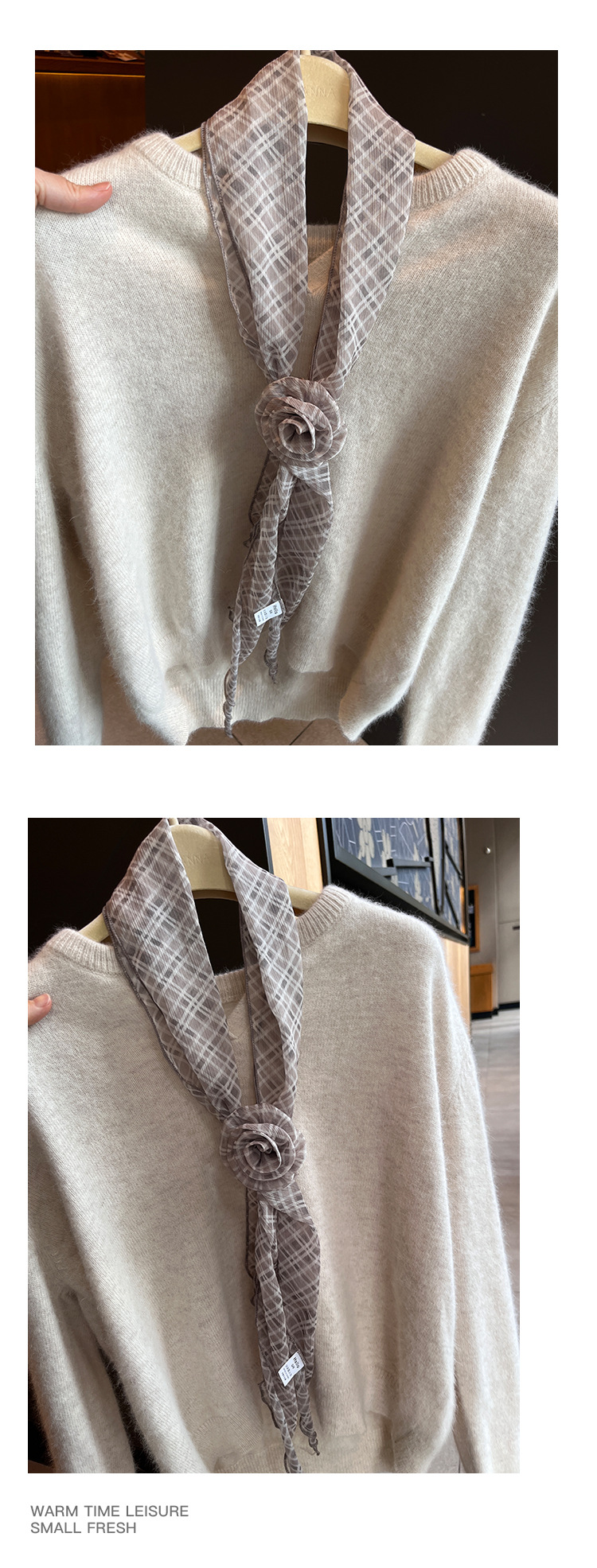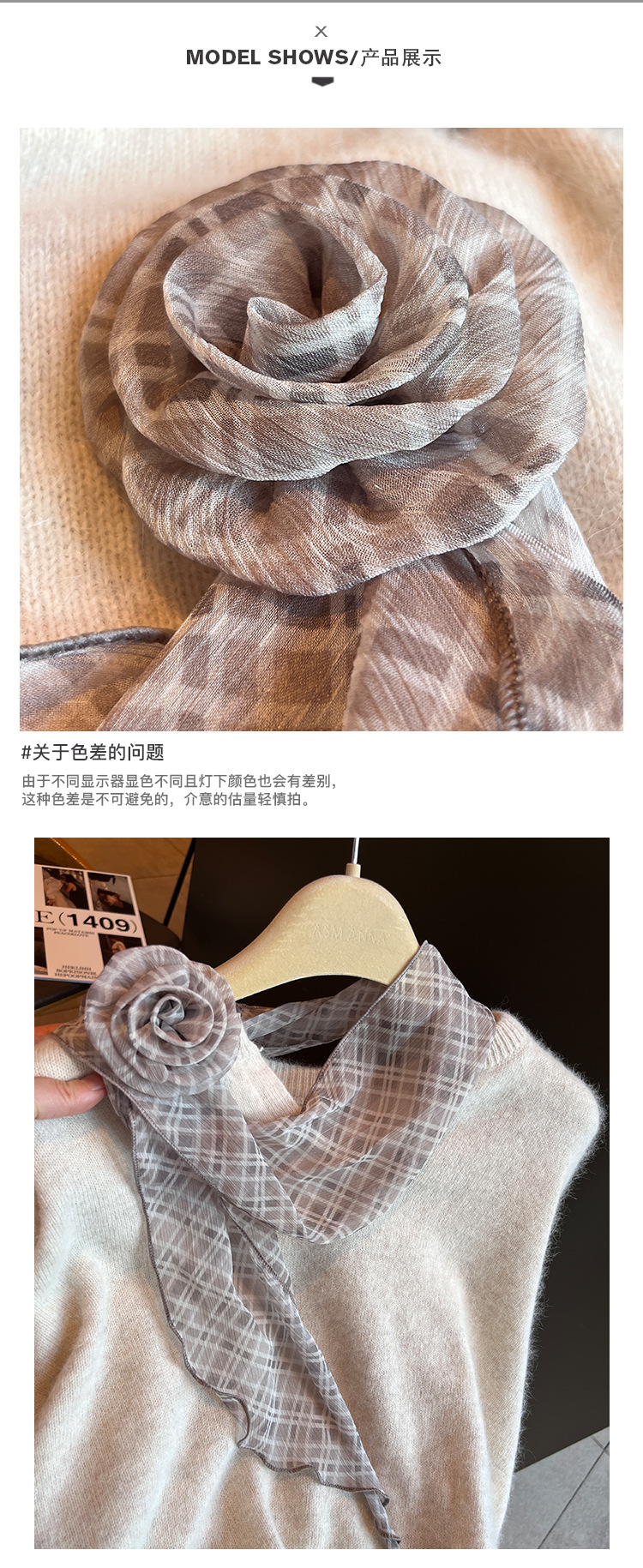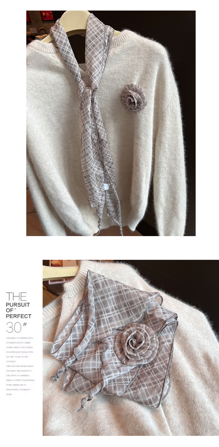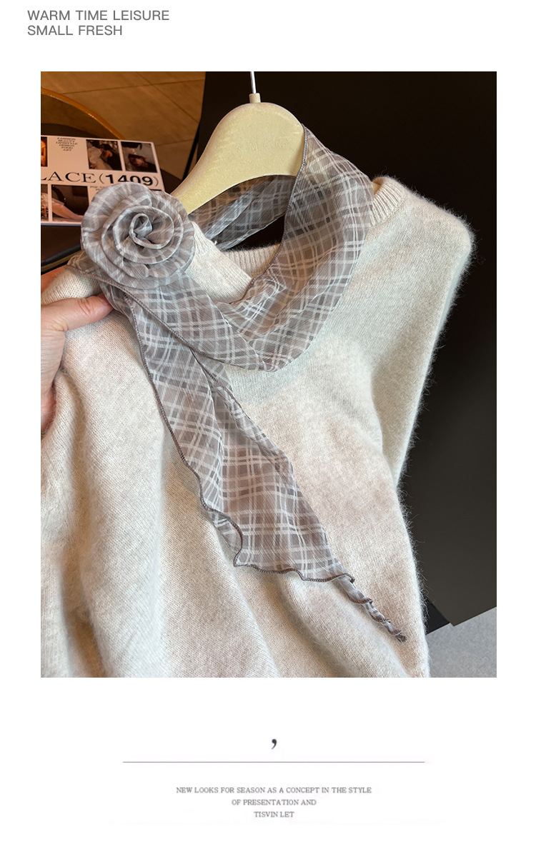 2025春季法式慵懒风长条围巾百搭系脖立体花朵配饰丝巾两件套飘带