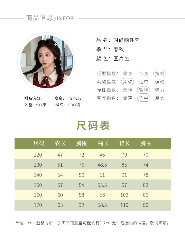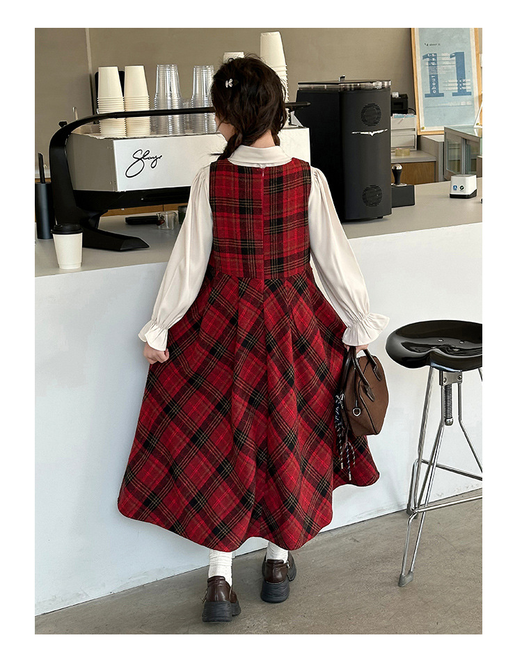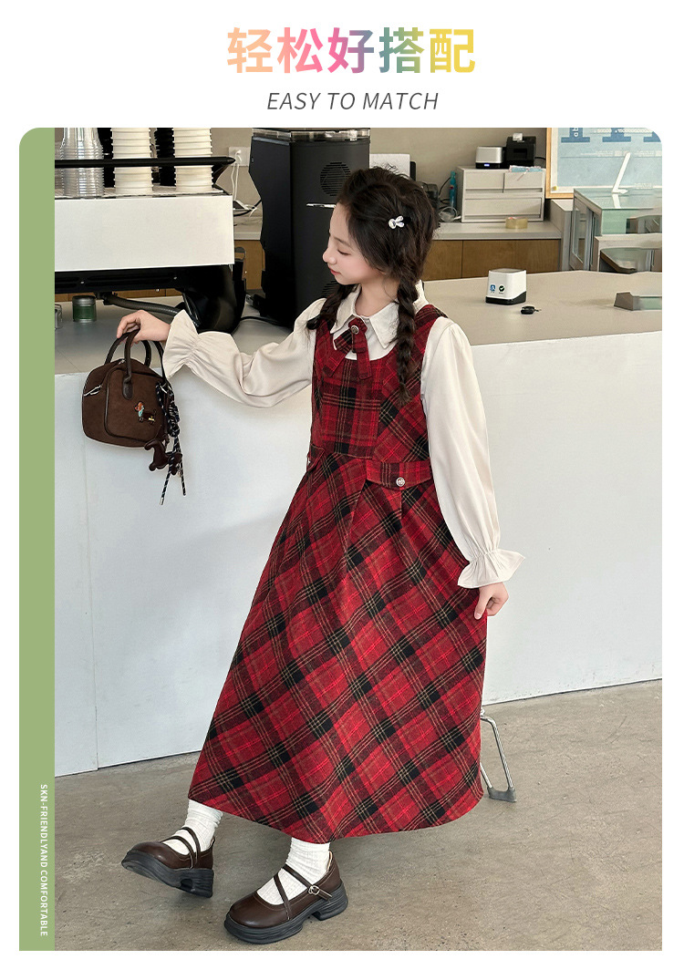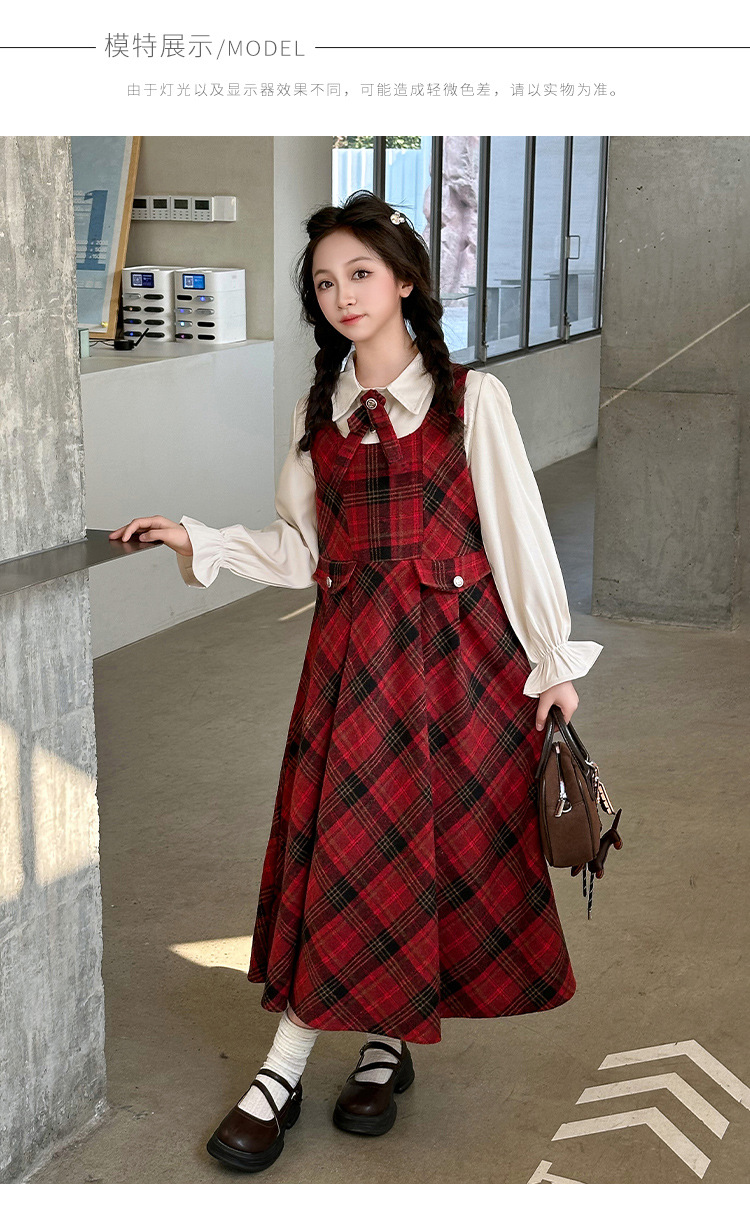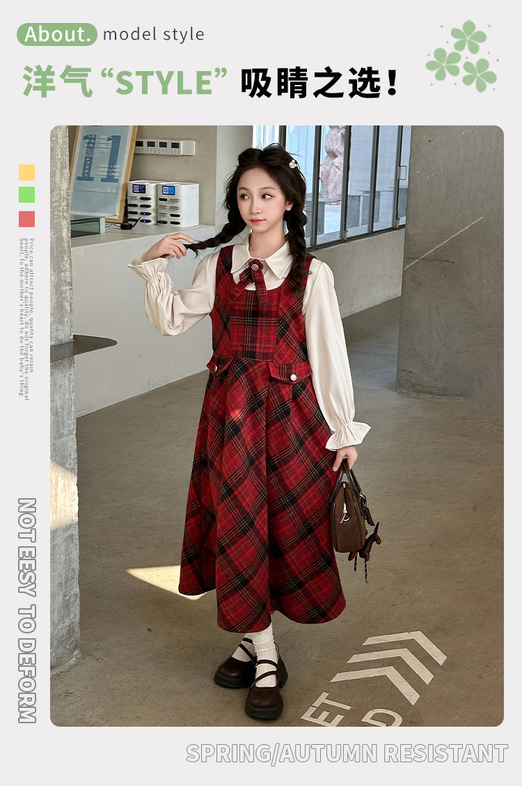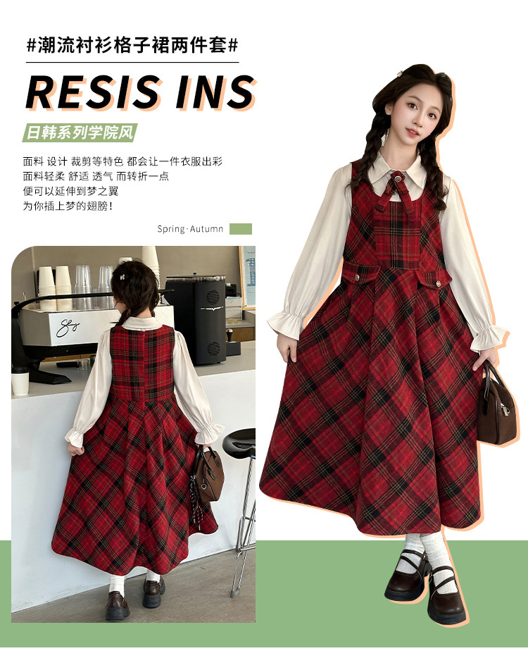 여자 대학 스타일 빨간 격자 무늬 스트랩 원피스 2025 봄과 가을 중학교 어린이를위한 새로운 달콤한 셔츠 2 피스 세트스토어 가기