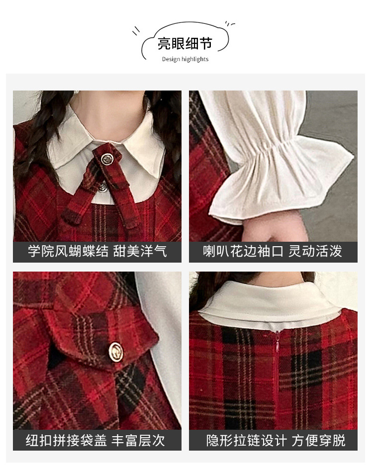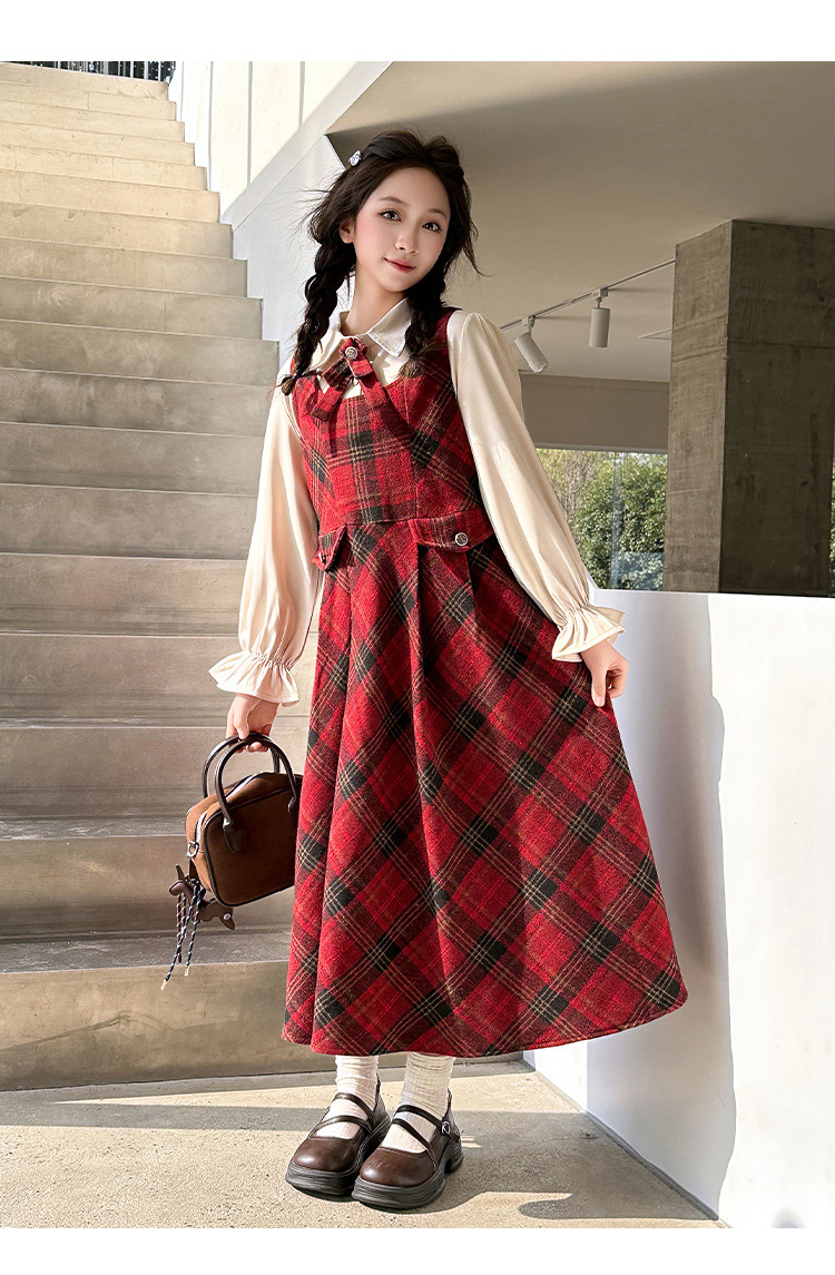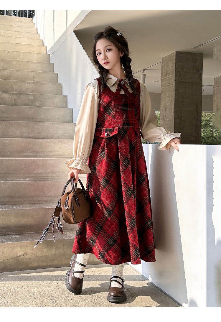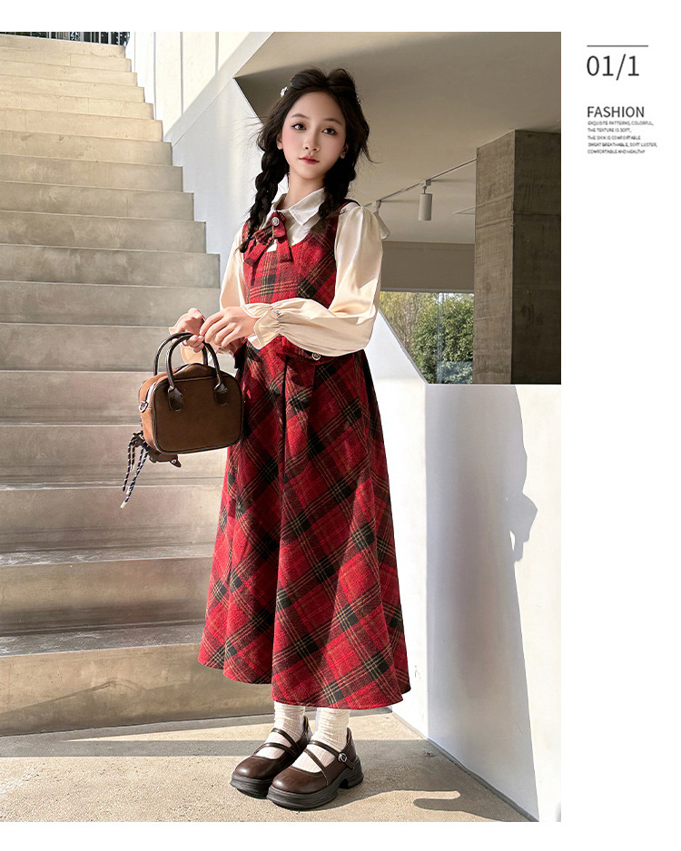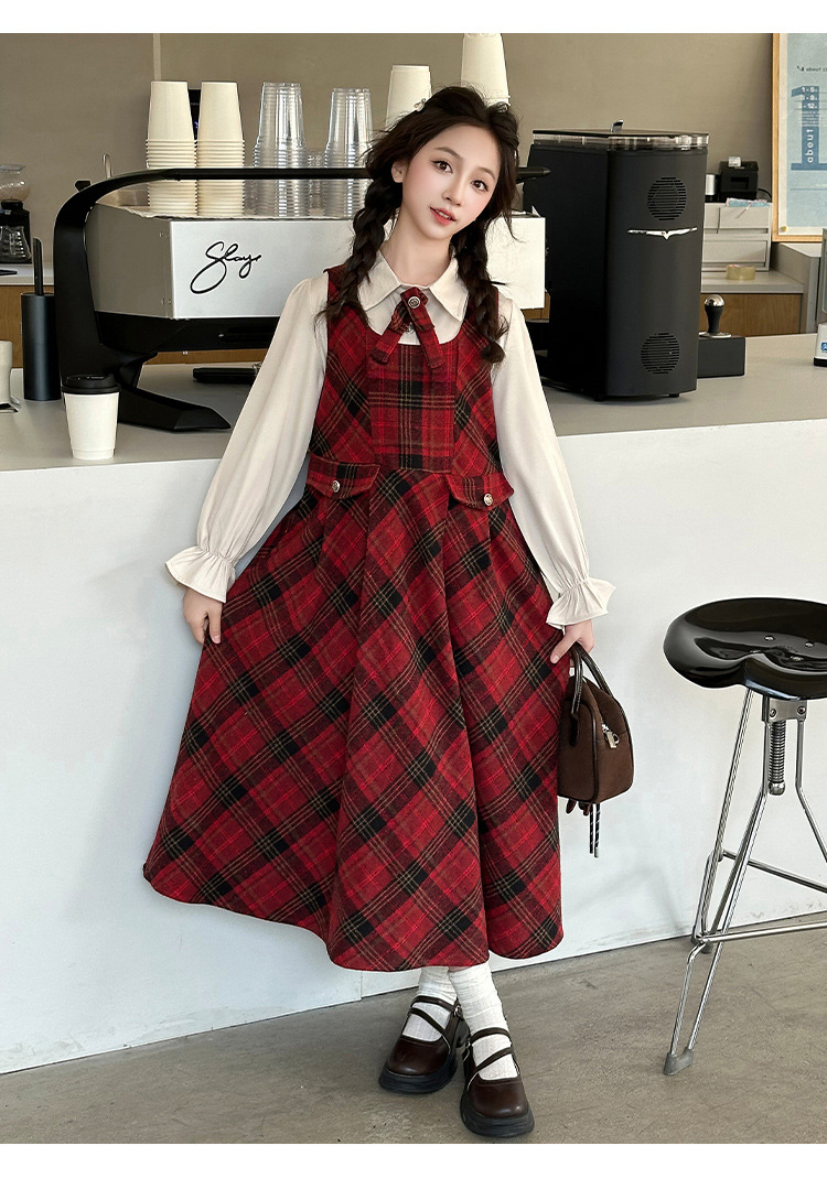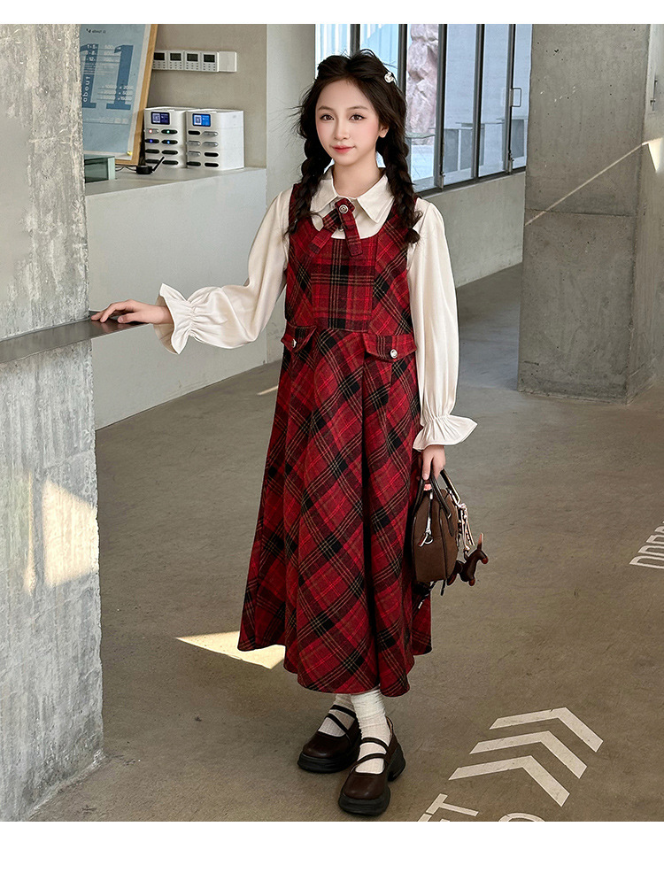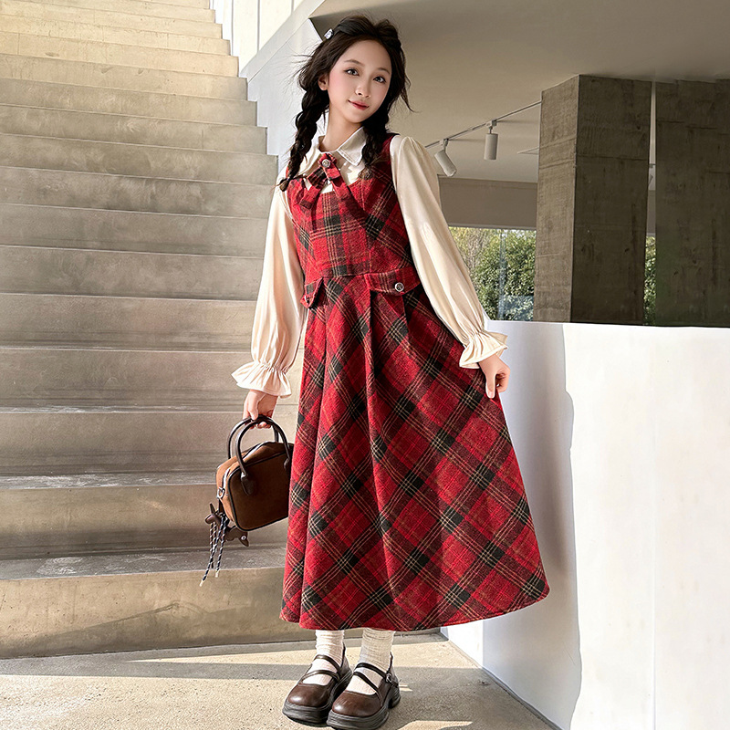 여자 대학 스타일 빨간 격자 무늬 스트랩 원피스 2025 봄과 가을 중학교 어린이를위한 새로운 달콤한 셔츠 2 피스 세트
