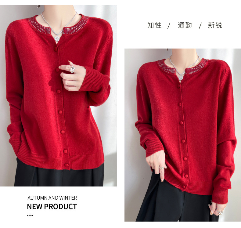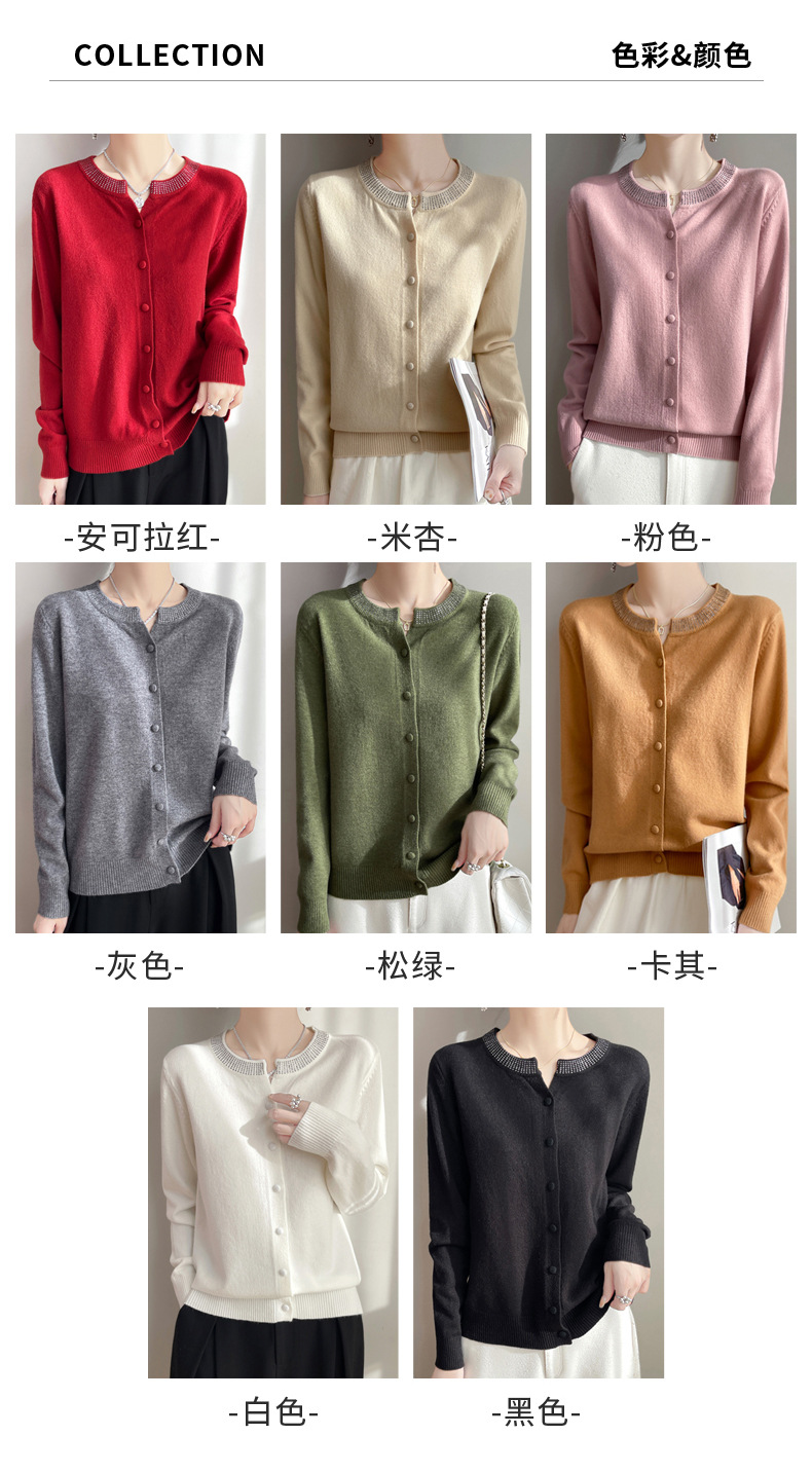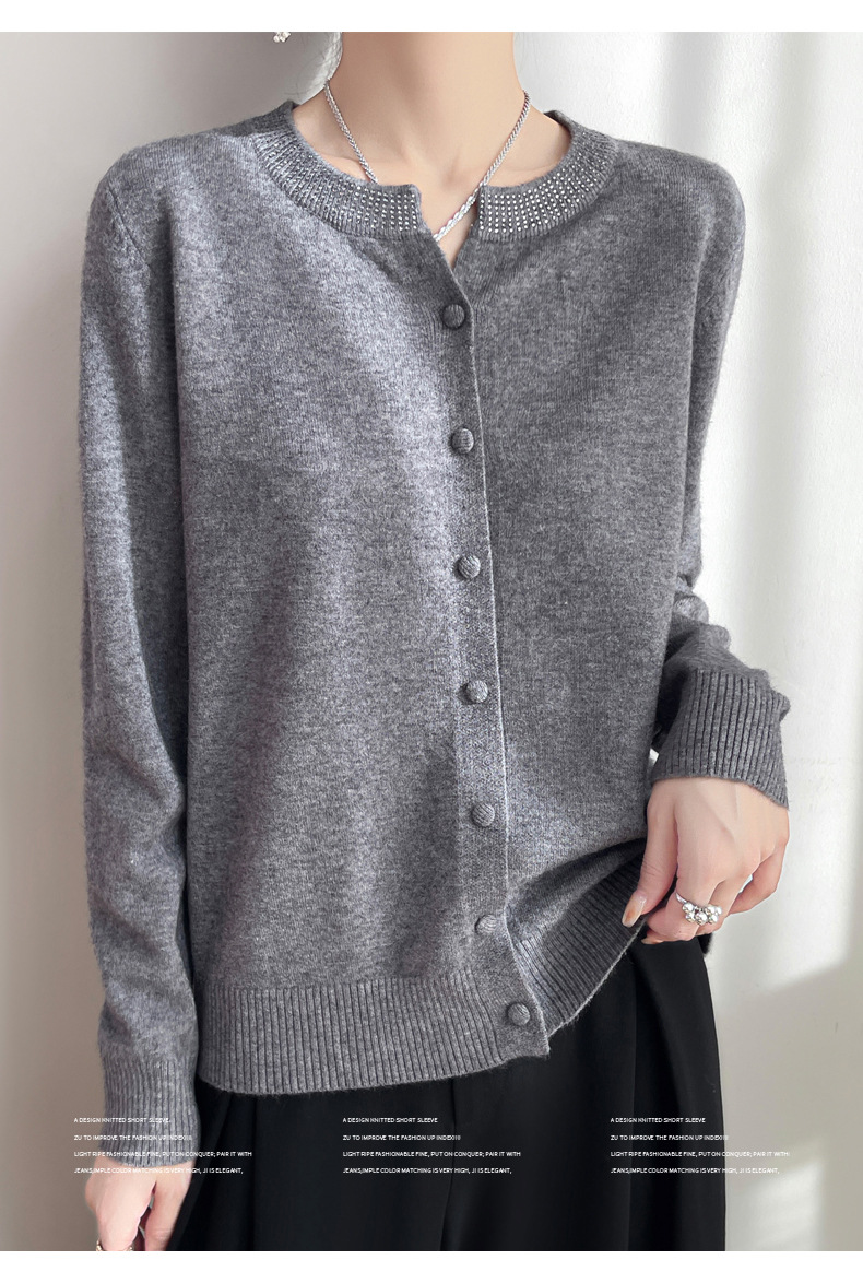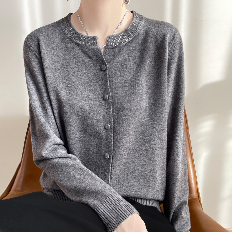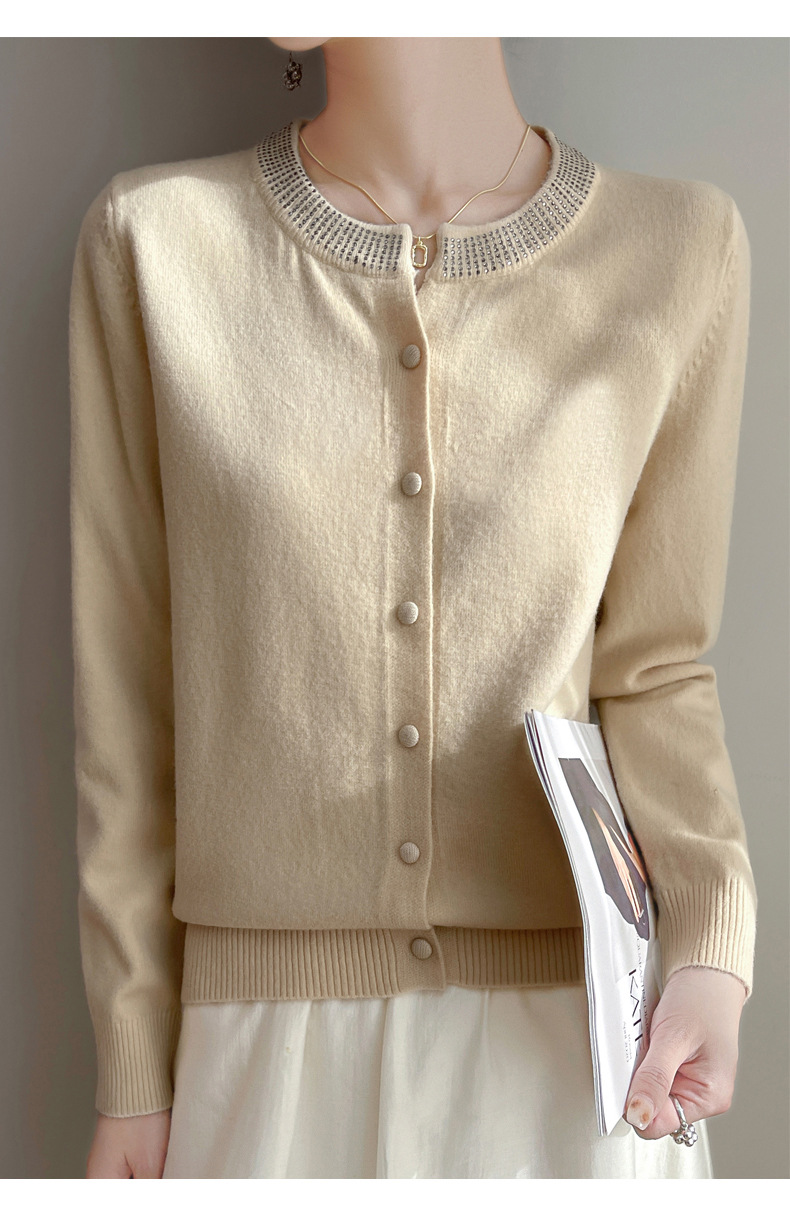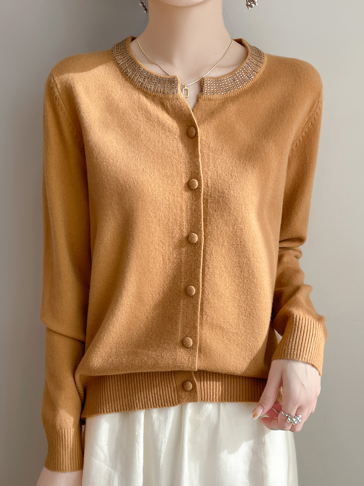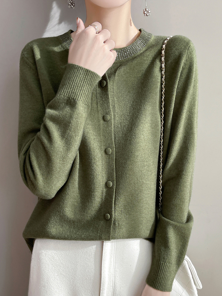 이른 봄 크루 넥 니트 카디건 여성의 느슨한 간단한 단색 내부 재킷 라인스톤 디자인 센스 얇은 외부 스웨터스토어 가기