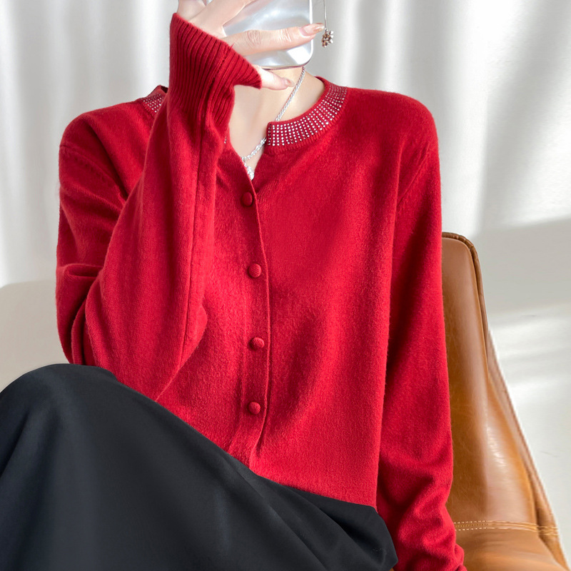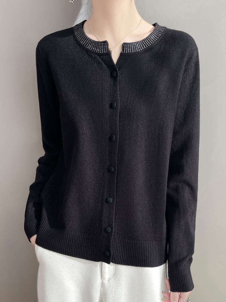 이른 봄 크루 넥 니트 카디건 여성의 느슨한 간단한 단색 내부 재킷 라인스톤 디자인 센스 얇은 외부 스웨터