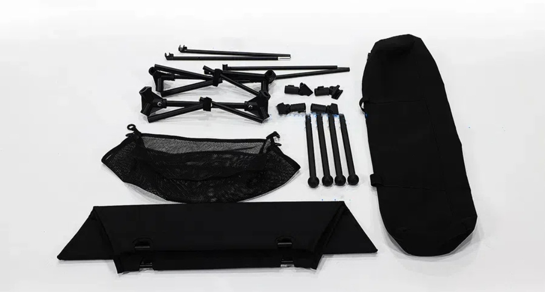 一张椅面 一个网袋 两个支架 两根连接杆 四根椅腿 一个收纳袋