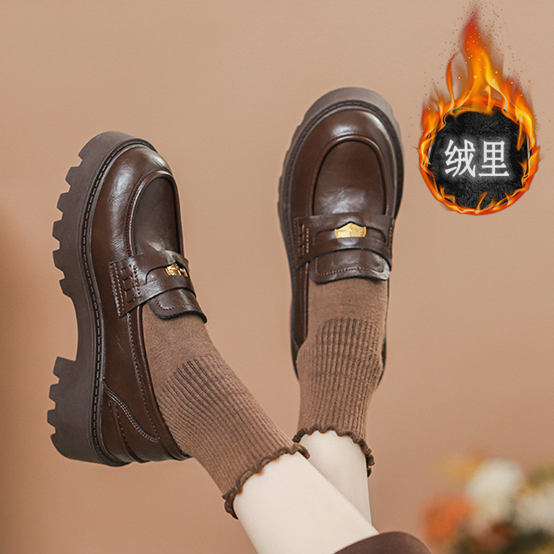 재고 도매 비싼 작은 금화 둥근 발가락 가죽 신발 여성의 두꺼운 밑창 신발 페달 블랙 증가 로퍼 여성
