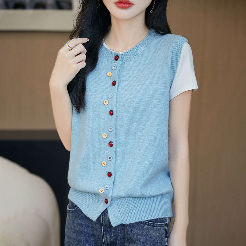봄 2025 새로운 피부 친화적 인 벨벳 크루 넥 니트 조끼 카디건 컬러 버클 디자인 센스 솔리드 컬러 민소매 여성용스토어 가기