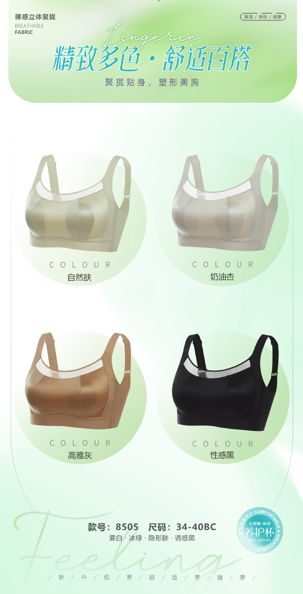 8505大胸显小薄杯养护型提拉内衣全罩杯无痕兔耳朵聚拢收副乳文胸