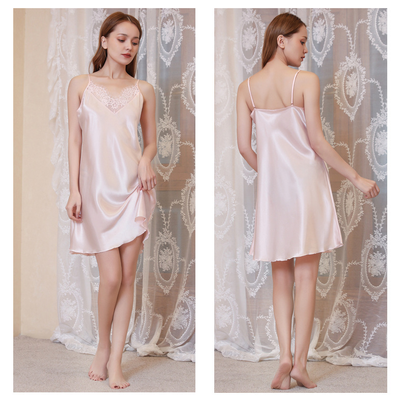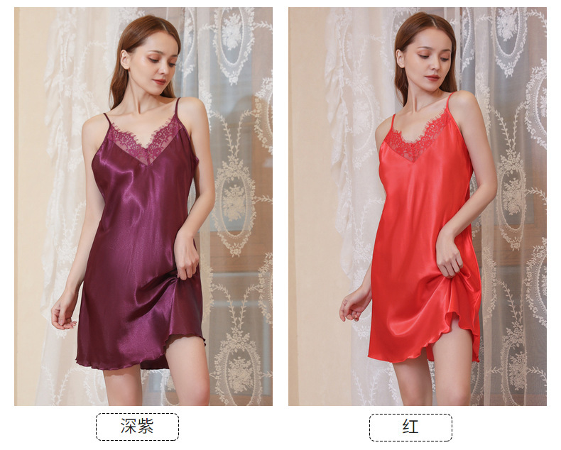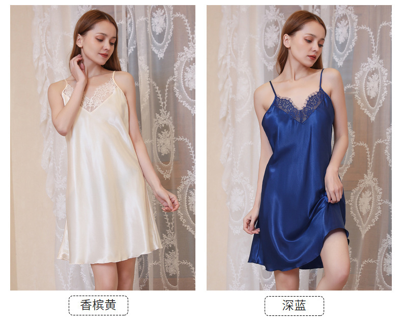 국경 간 플러스 사이즈 여름 얇은 실크 파자마 감성 아름다운 백 V 넥 레이스 레이스 여성 홈 슬링 나이트 가운스토어 가기