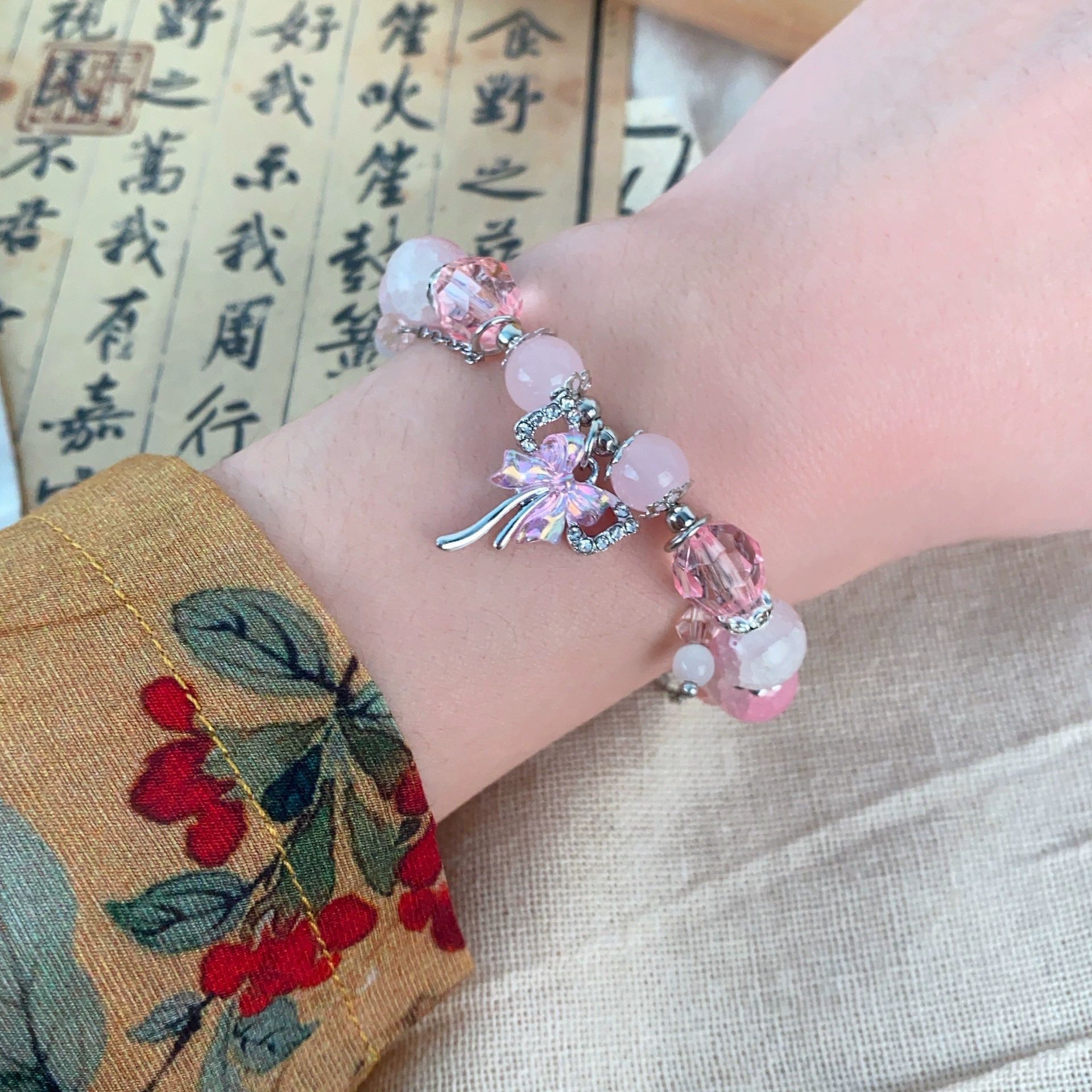 새로운 중국 핑크 활 펜던트 팔찌 여성용 골동품 고급 구슬 팔찌 빈티지 올 매치 팔찌