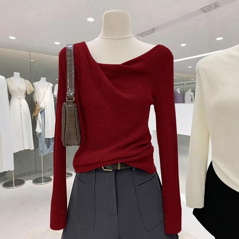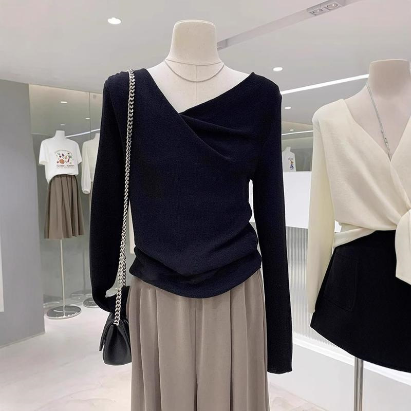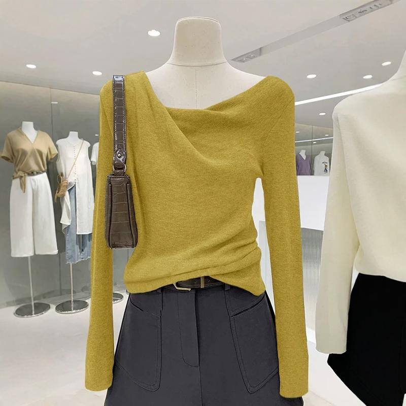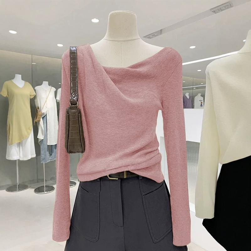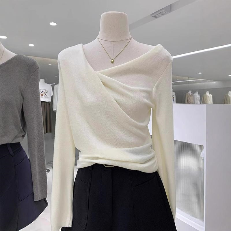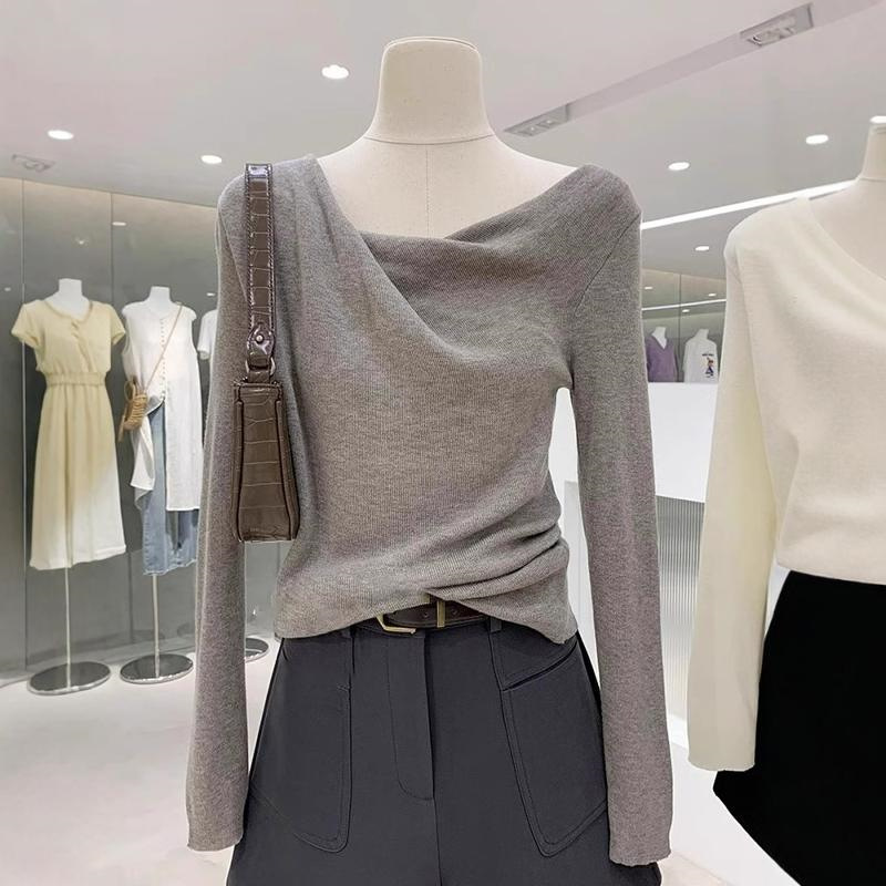 하이 엔드 우아한 그레이 스윙 칼라 긴팔 니트웨어 여성용 봄과 가을 디자인 슬림 핏 스웨터 내베이스 탑
