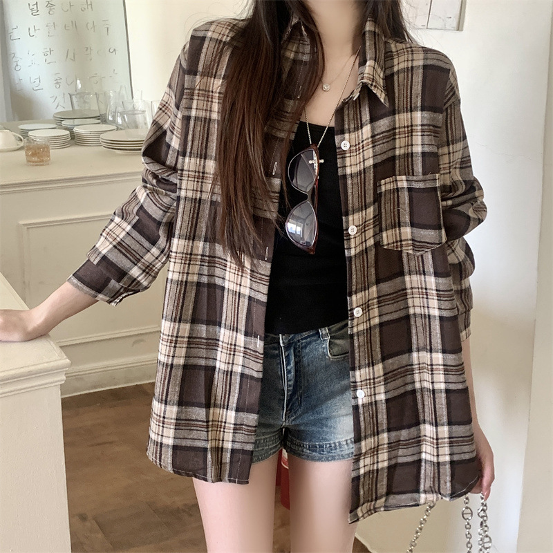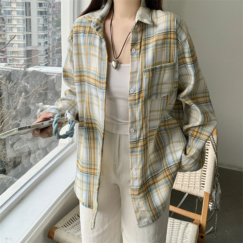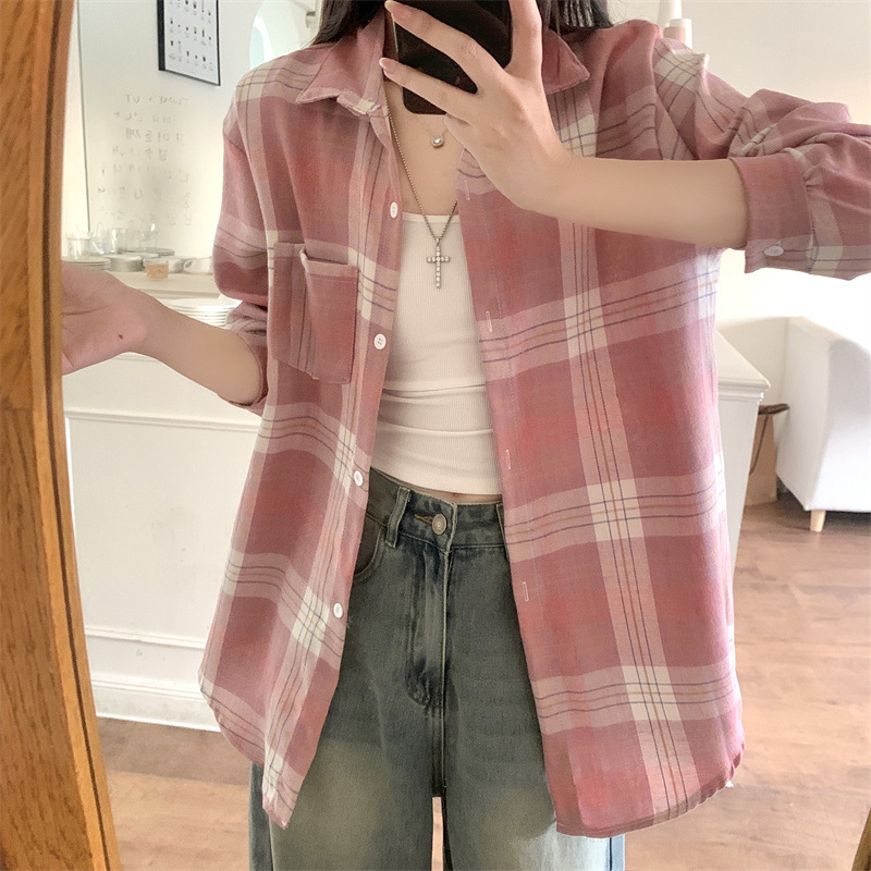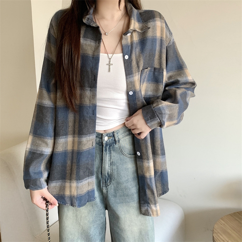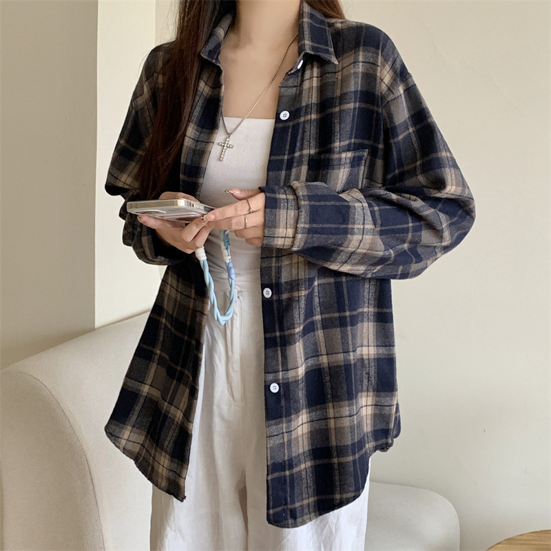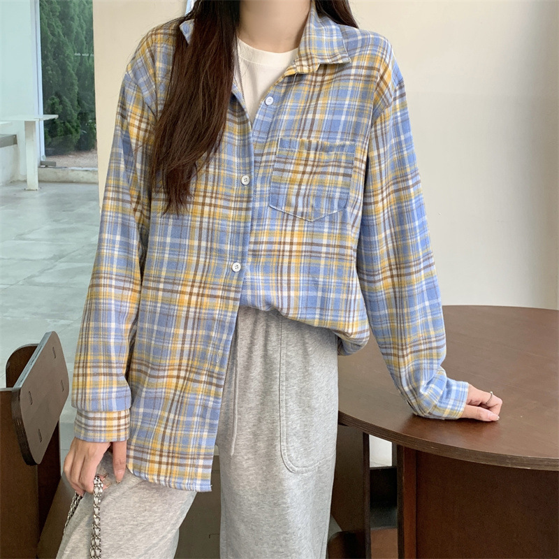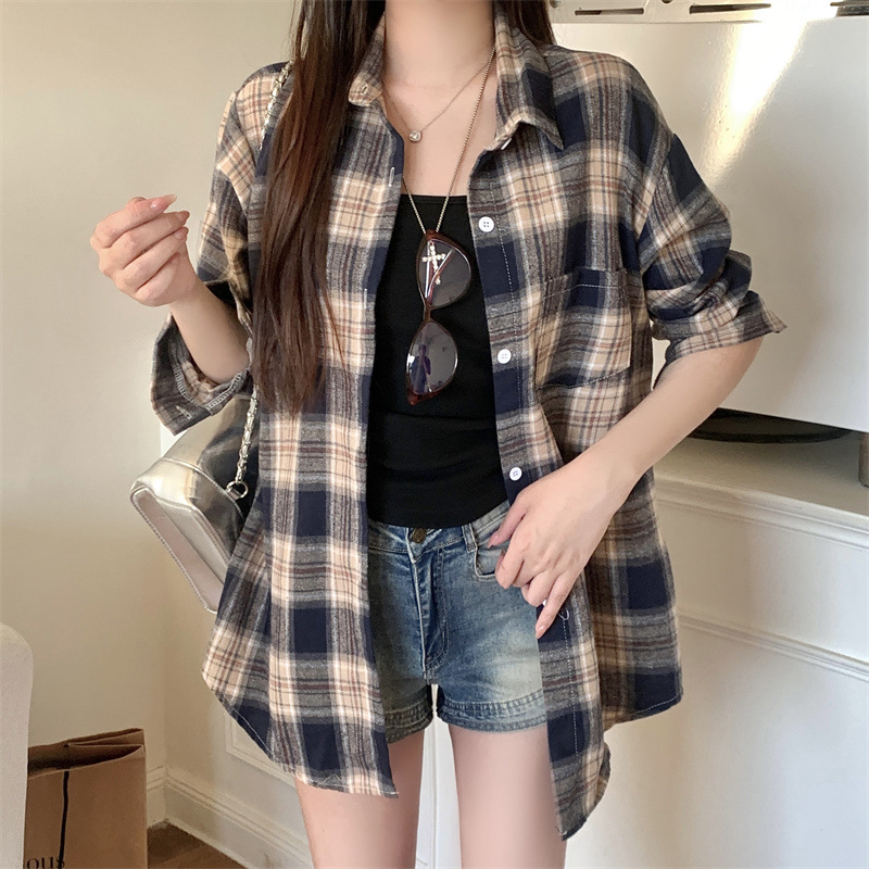 부드러운 달콤한 스타일 소녀의 Bm 블루 격자 무늬 느슨한 긴 소매 셔츠 여성의 중간 길이의 선 스크린 코트 트렌디스토어 가기