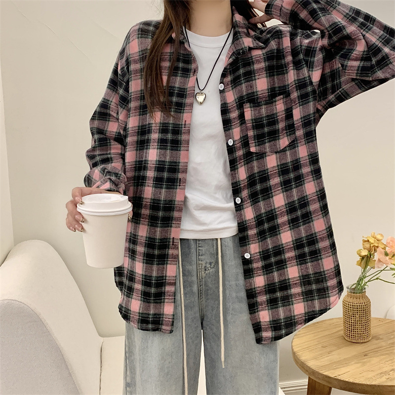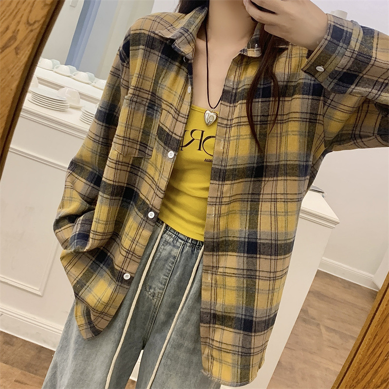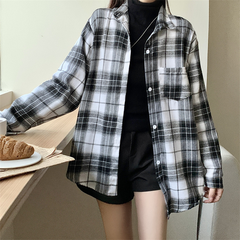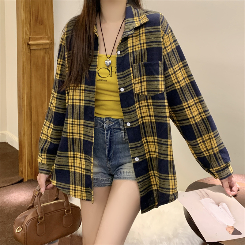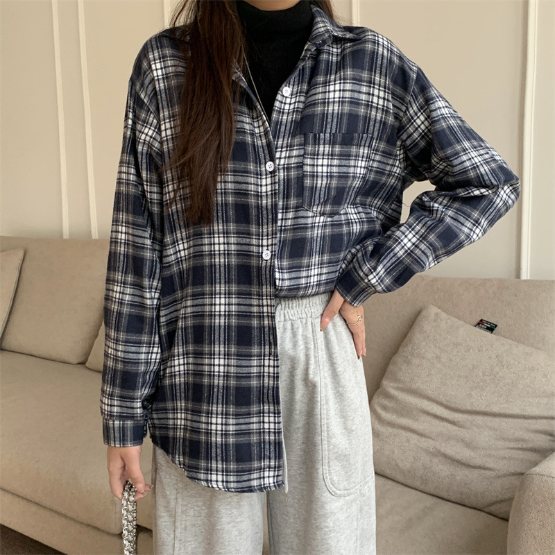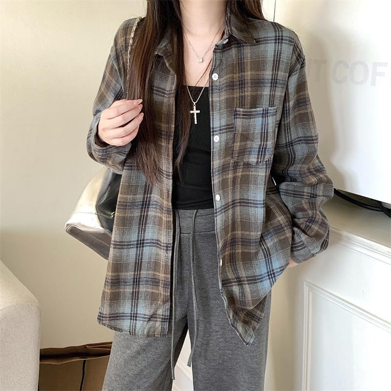 부드러운 달콤한 스타일 소녀의 Bm 블루 격자 무늬 느슨한 긴 소매 셔츠 여성의 중간 길이의 선 스크린 코트 트렌디스토어 가기